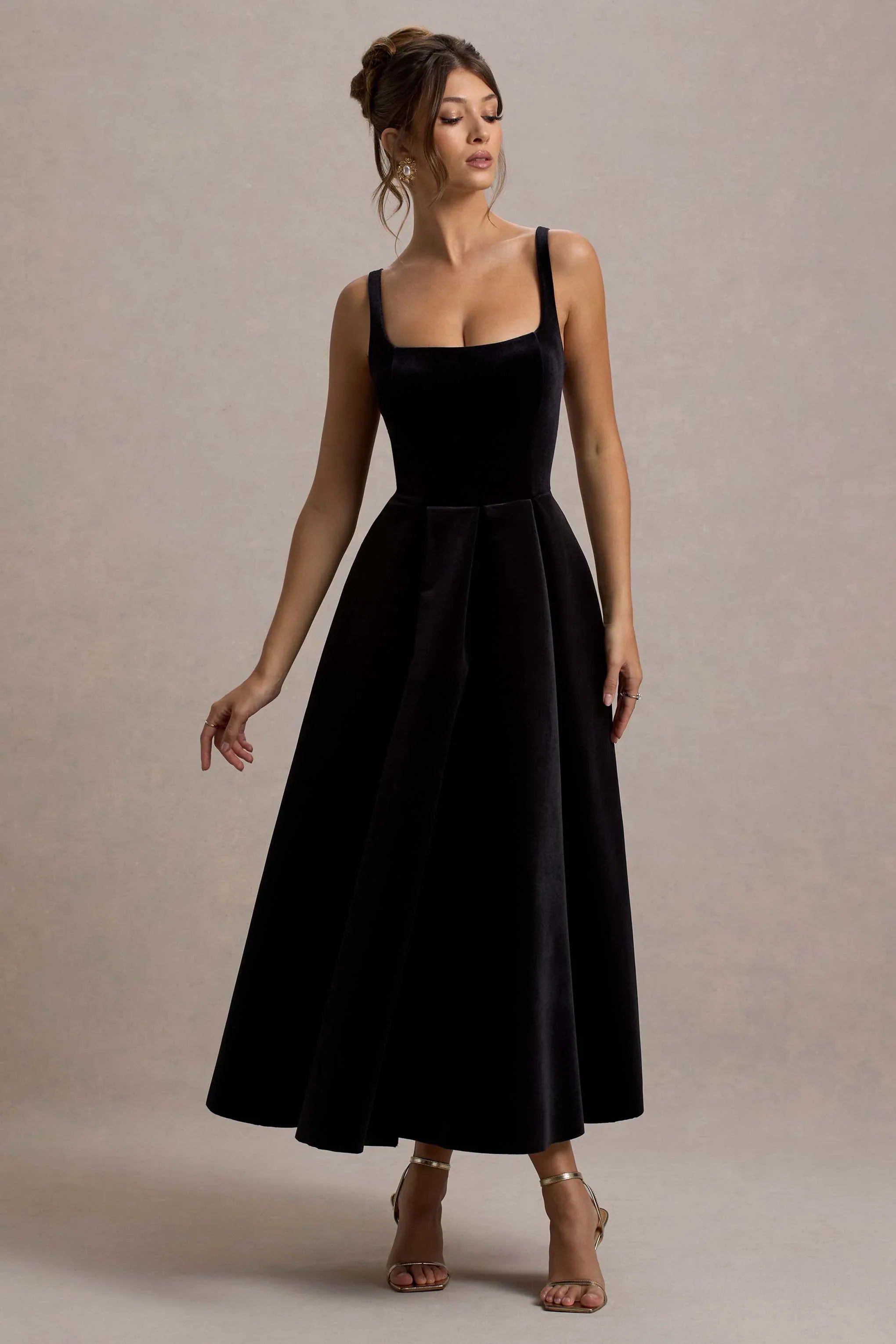 Offering up a sophisticated allure, opt for opulence in Francisca. Arriving in a classic black shade of our premium stretch velvet, this midi dress boasts a sculpting square neckline and artful pleated skirt with added volume to further enhance its shape.