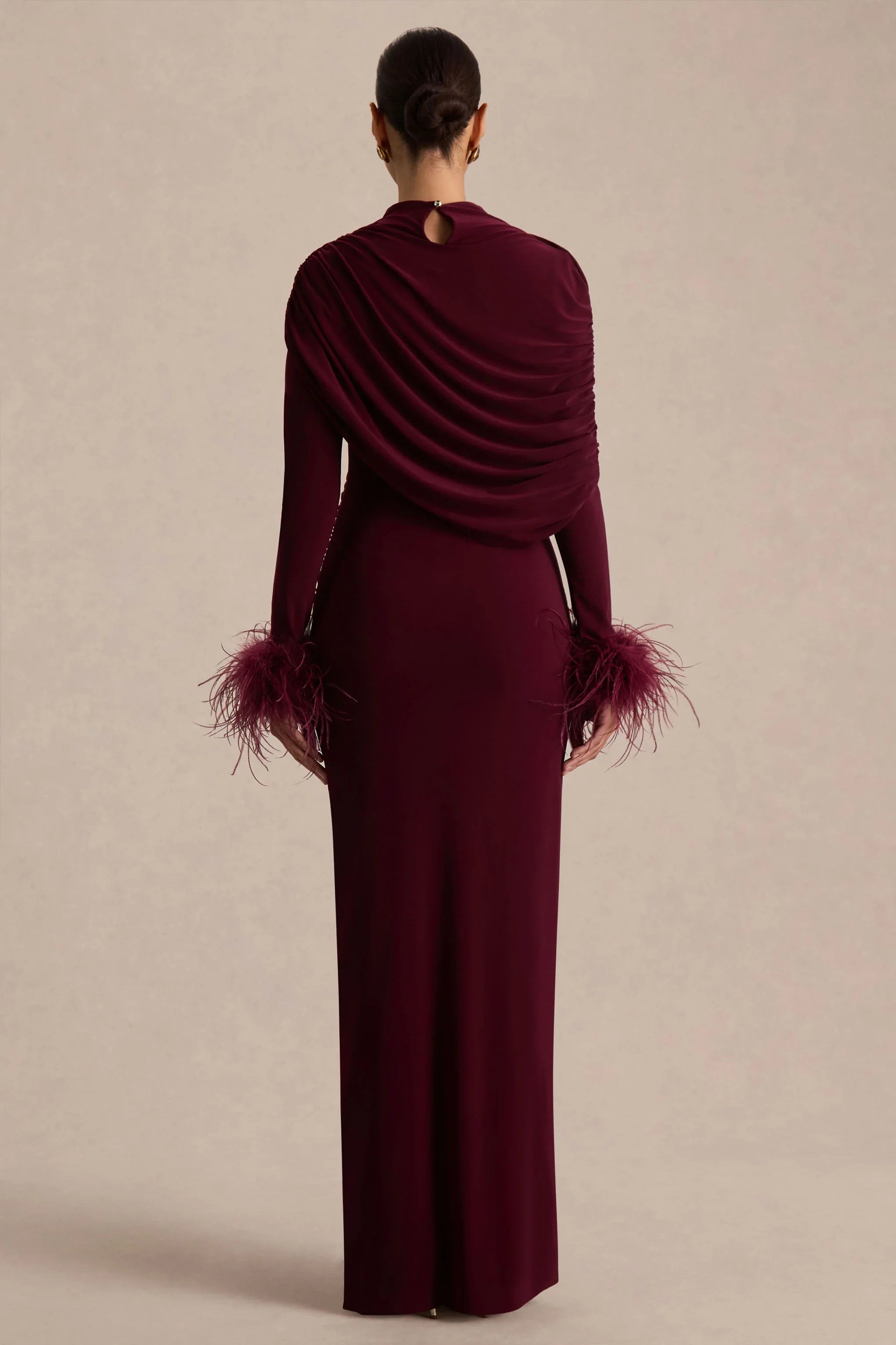 Say hello to Gatsby, a show-stopping gown that embodies timeless glamour with a modern twist. Designed in our premium stretch jersey, this burgundy maxi sculpts a stunning silhouette. Finished with s a sophisticated high neckline and an asymmetric shawl overlay for added drama. Feather-trim cuffs bring a touch of decadence, while a daring front-high split completes the look with confidence and allure. Gatsby is the statement piece your evening wardrobe has been waiting for.
