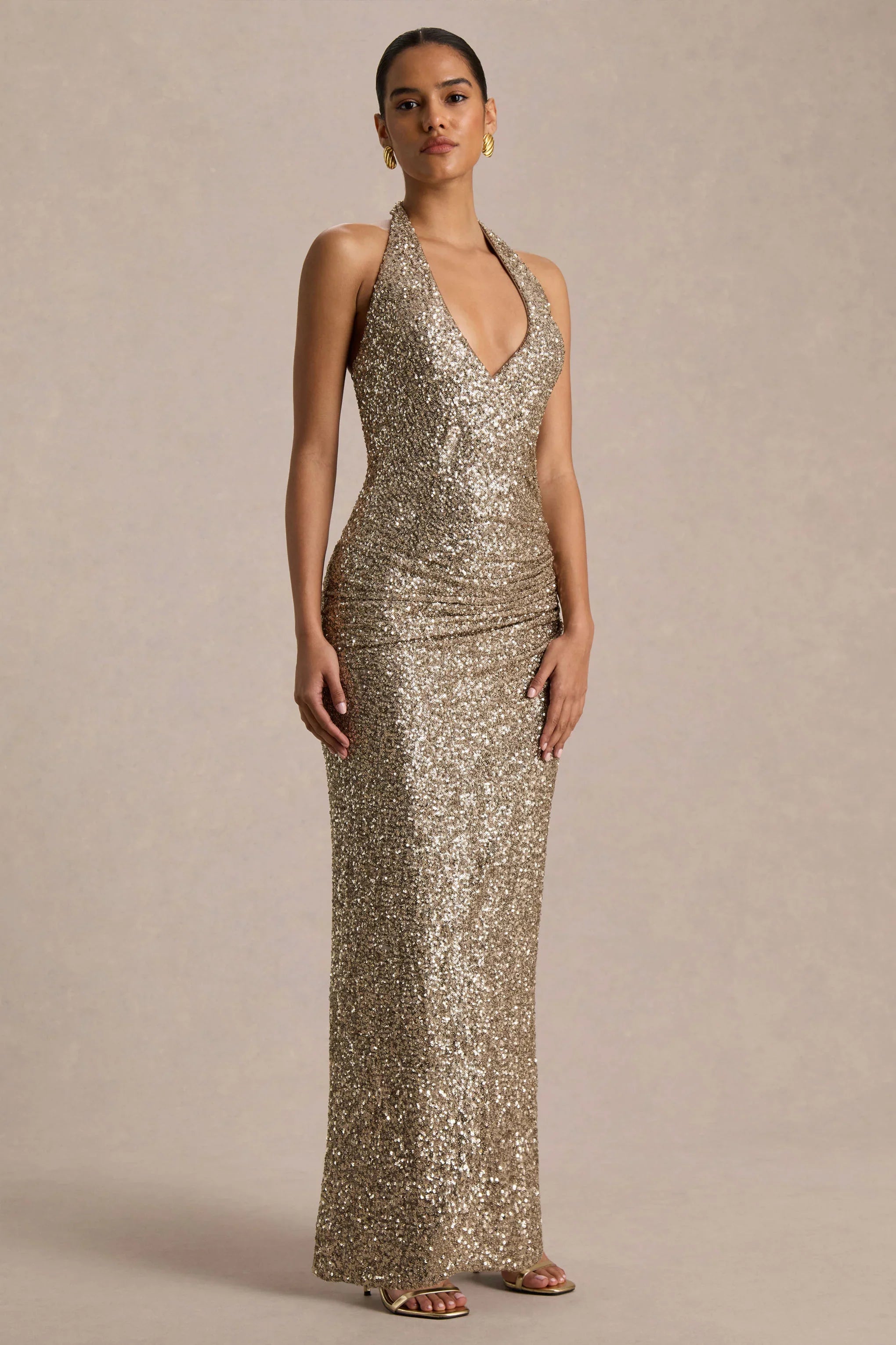 Gio is the ultimate show-stopper, made to turn heads from every angle. Crafted in our premium champagne sequin, this maxi dress glimmers with every movement, flattering your silhouette with a sleek fit. The plunge neckline and gathered detailing highlight your curves, while the open back and delicate tie-back detail add a touch of daring elegance. Gio is the perfect choice for making a sparkling, unforgettable entrance.