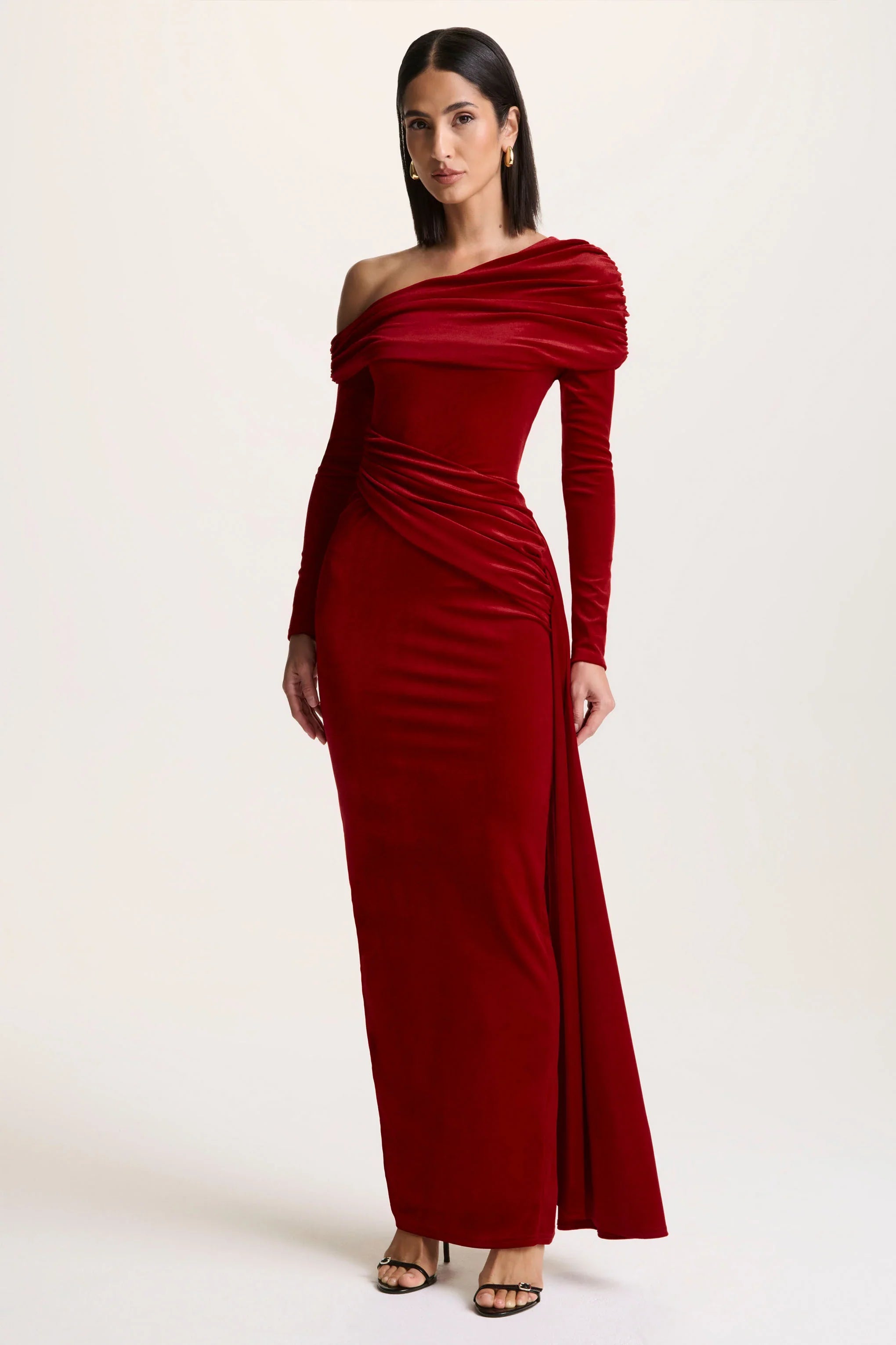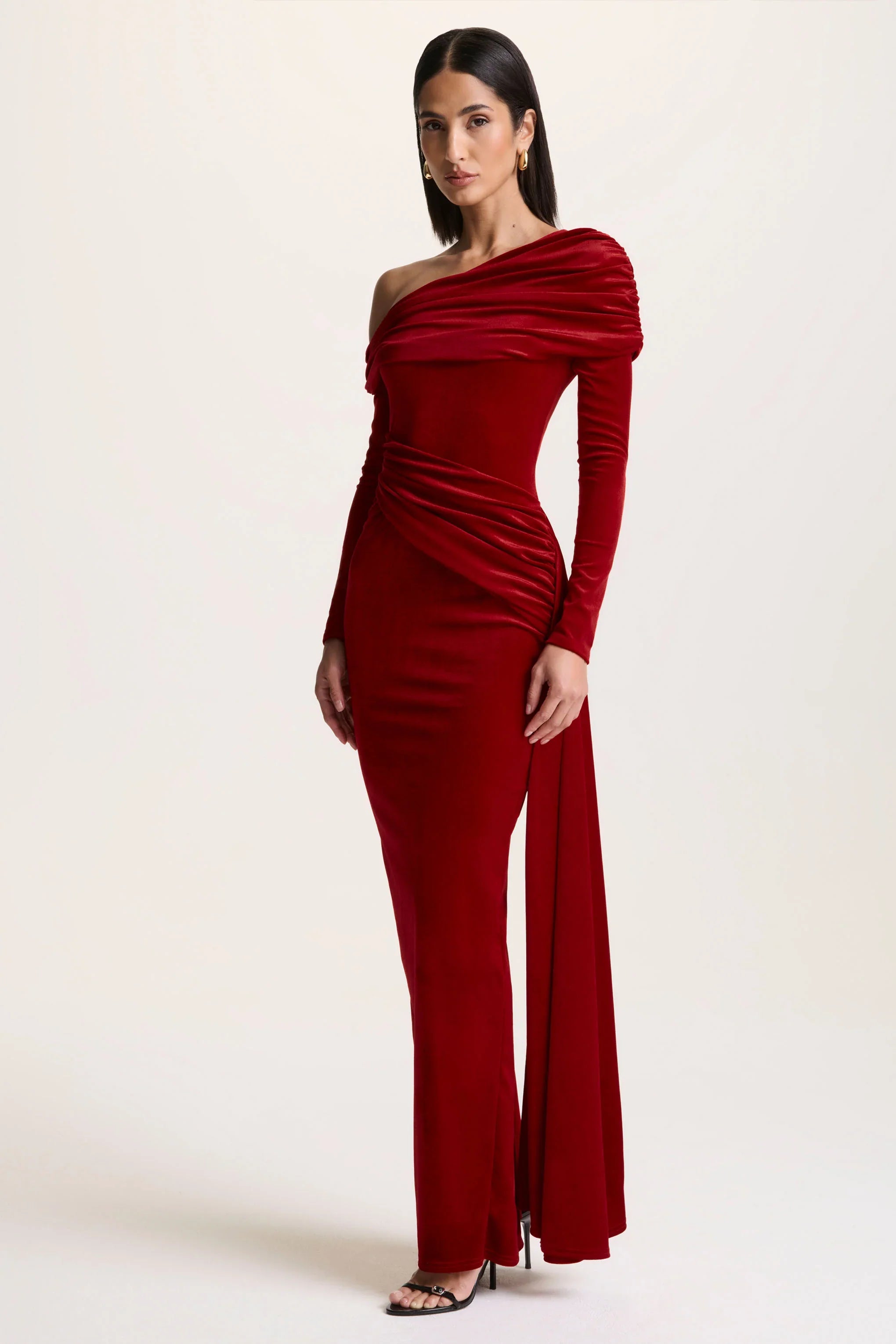 Hadria exudes bold sophistication with a sculpted, feminine silhouette. Crafted from our premium red velvet, this maxi-length design drapes luxuriously while highlighting the body with effortless elegance. The asymmetric neckline creates a striking, contemporary finish, complemented by ruched detailing and a sash that enhances every curve. Finished with a centre-back split for graceful movement, Hadria is made for occasions that demand confidence, glamour, and unforgettable style.