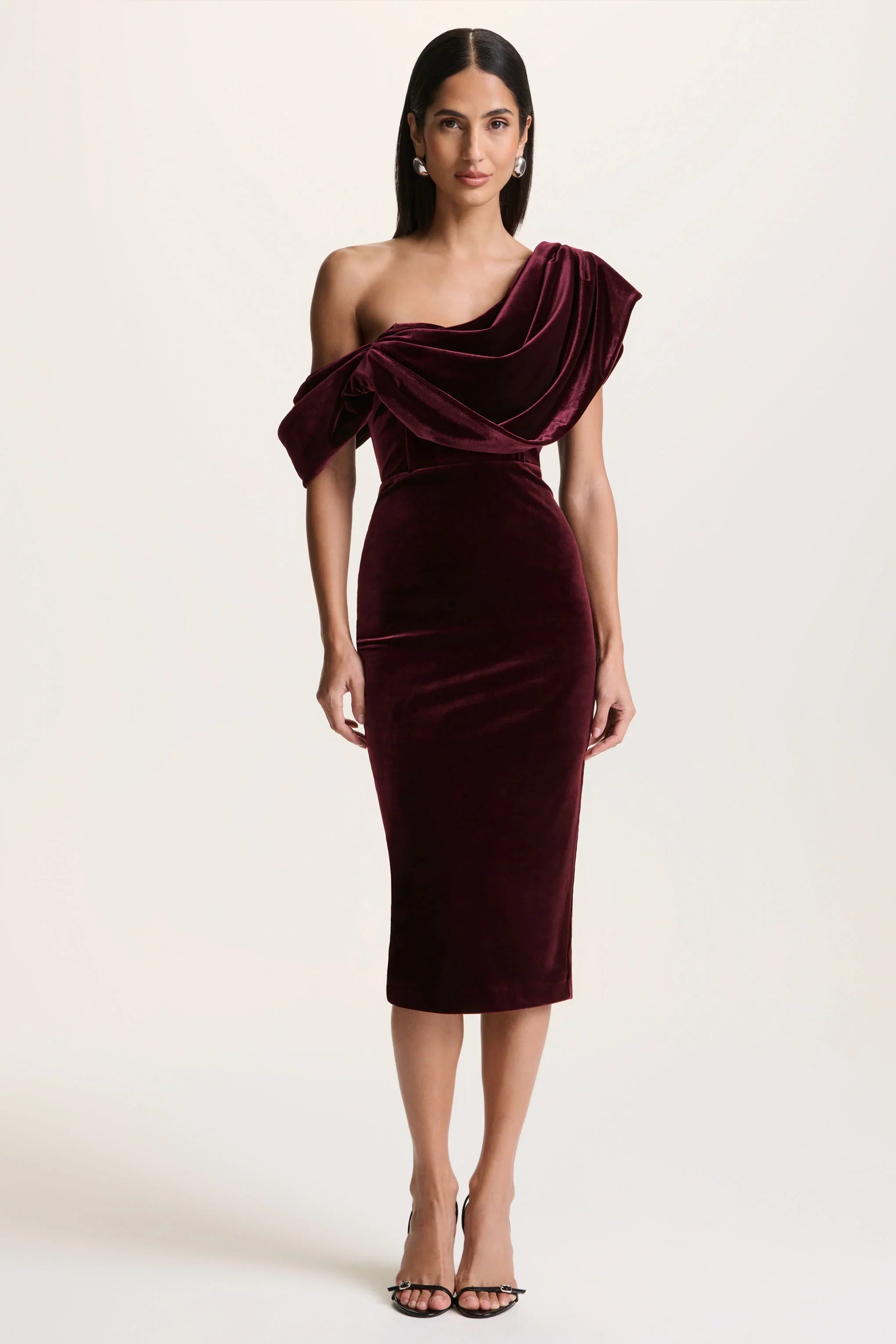 Sophistication meets allure in High End, a head-turner for your next special occasion. Crafted from our premium velvet, in a bold burgundy hue, this midi skims the figure for a flattering, refined fit. The draped asymmetric neckline adds an elegant edge, while a centre-back split adds subtle drama and allure. Designed for evenings that call for timeless glamour with a modern and feminine feel.