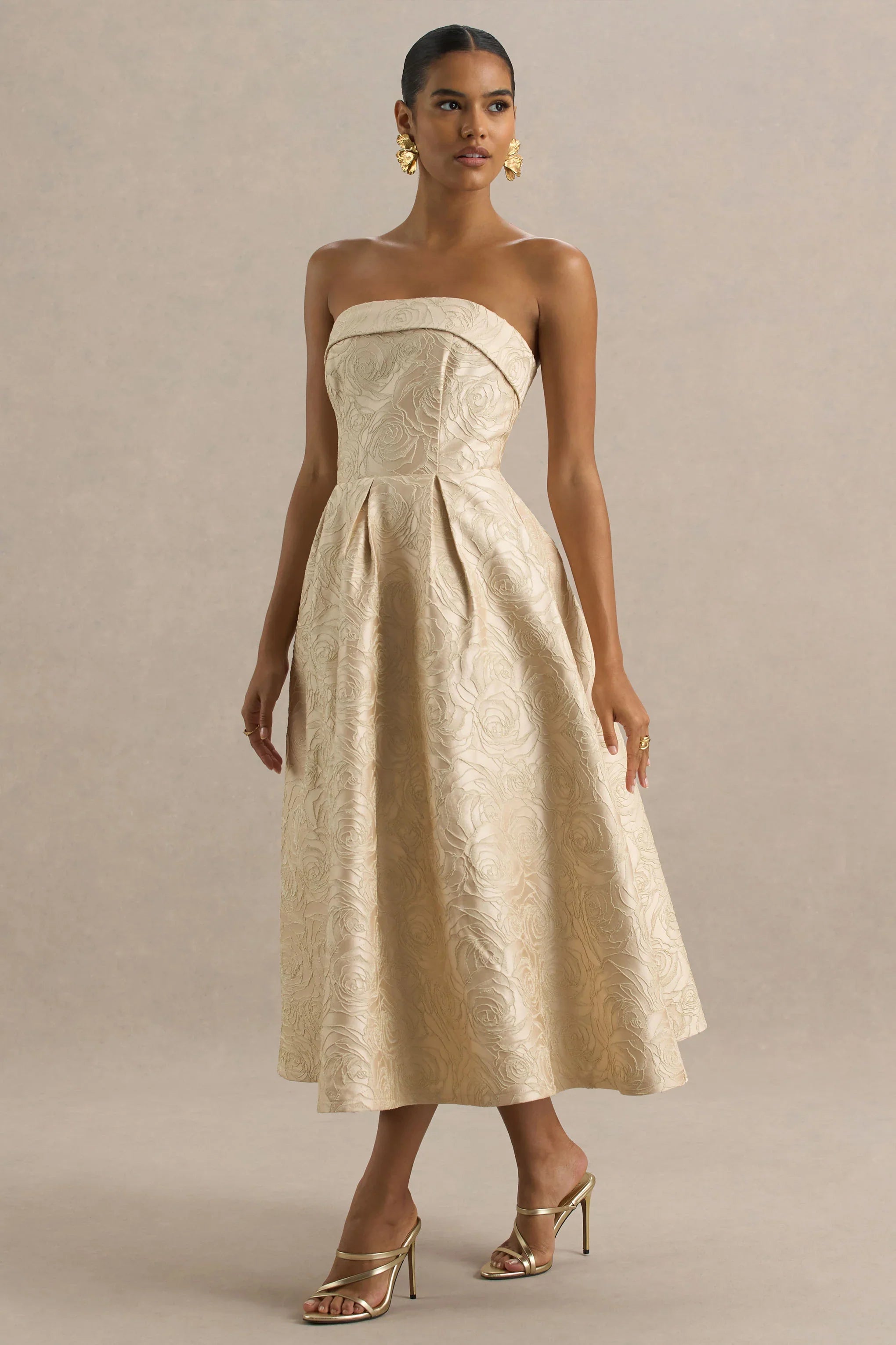 Captivate with your elegance at your next special occasion in our Hyptonic midi dress. Curated in a rich gold shade of our premium jacquard , this dress is the epitome of elegance. Finished with a folded bandeau neckline that delicately displays your decolletage, for a chic feminine edge. The pleated skirt moves effortlessly with every gesture, elevating this piece to next level chic. From weddings to glamorous dinners, in Hypnotic you won't be forgotten.