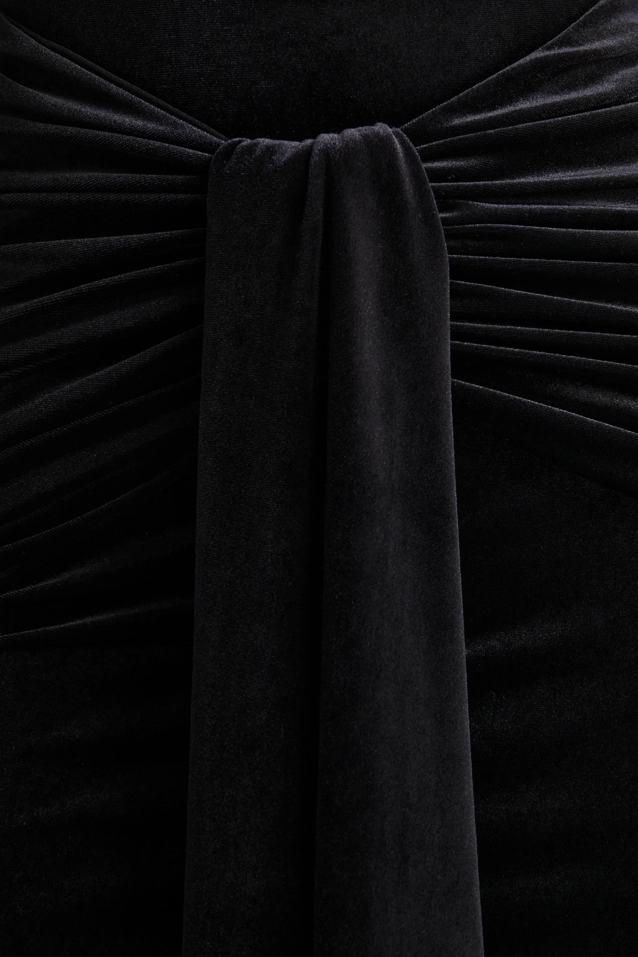 Idalina is the epitome of refined evening glamour. Crafted from our premium velvet in a classic black, this maxi-length design is both timeless and striking. The high neckline exudes sophistication, while the gathered detailing softly sculpts the silhouette. Finished with an elegant sash that cascades with graceful movement, Idalina is made for statement moments that call for effortless allure.