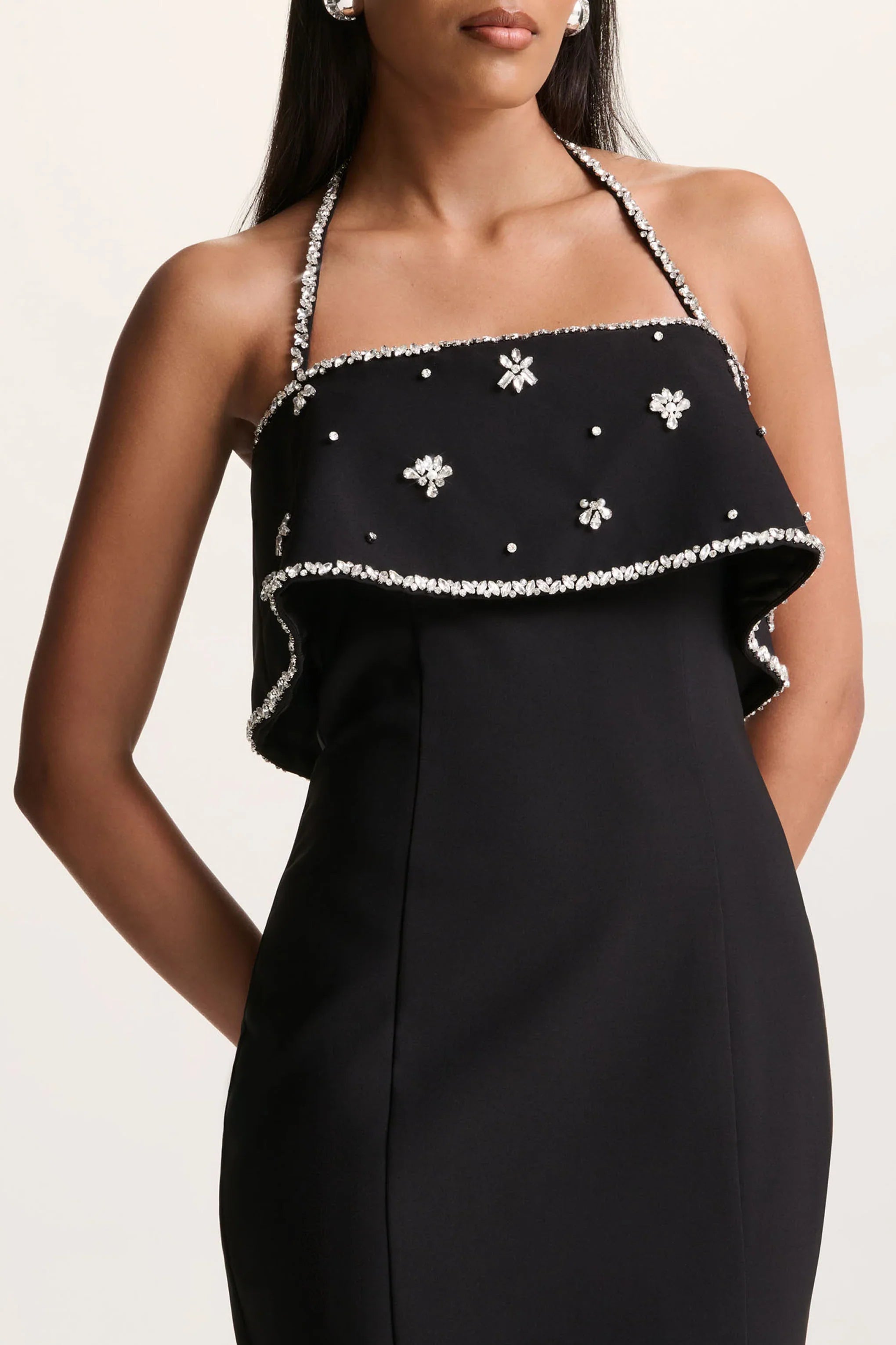 Sleek sophistication meets statement glamour in Illiana. Cut from our premium black crepe, this maxi dress sculpts the figure for a flawless silhouette. Featuring a chic halter neckline with a functional tie detail for an adjustable fit. A hand-embellished panel adds sparkle and drama, while the centre-back split ensures ease of movement with a sultry finish. Illiana is the ultimate choice for evenings where elegance and impact are non-negotiable.