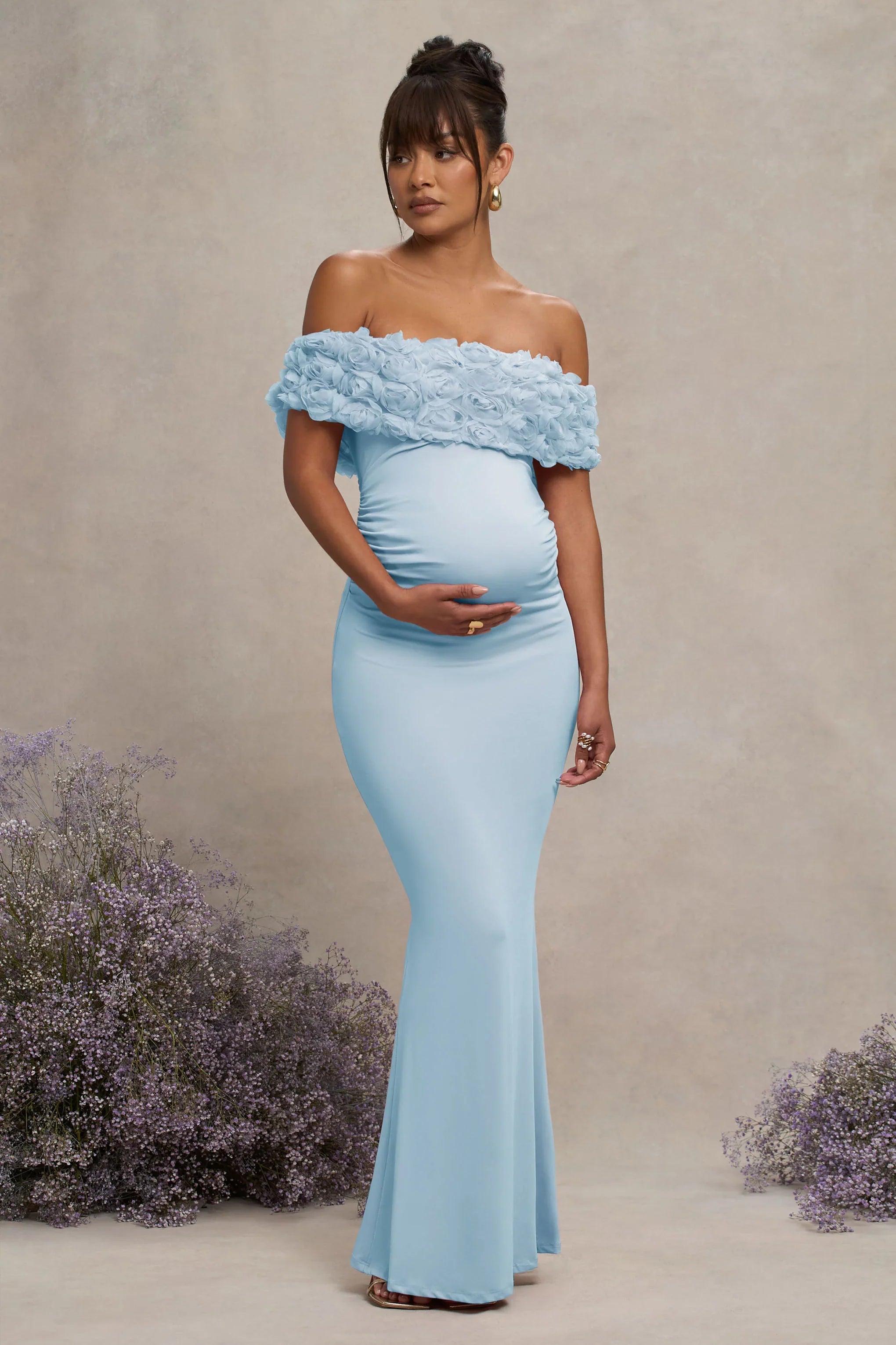 Both timeless and sophisticated, Inflorescence is a must-have maxi dress for any maternity wardrobe. Crafted in a premium stretch jersey known for its sculpting abilities, this form-flattering piece is defined by an artful array of mesh flowers across its bardot neckline. For an unforgettable wedding guest attire, try styling this fishtail maxi with some strappy heels and a classic sleek bun.