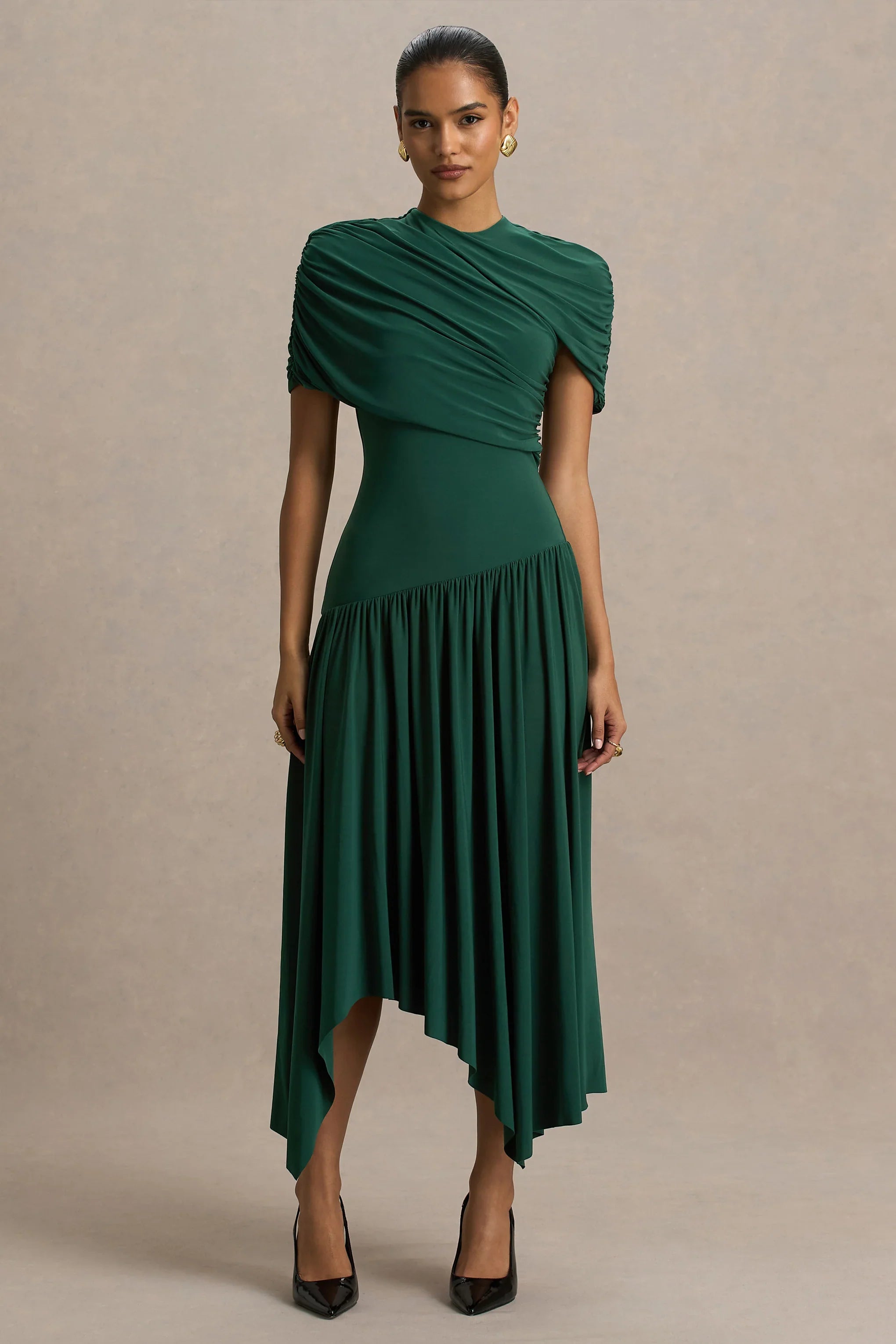 Striking yet effortless, Ione is designed to make an entrance. Crafted from our premium teal stretch jersey, this midi dress flows beautifully while sculpting the figure in all the right places. The refined high neckline and short cape sleeves create a dramatic silhouette, enhanced by gathered detailing and an asymmetric waistline that flatters from all angles. Finished with a hanky hemline, Ione moves with elegance, ensuring you captivate from every angle.
