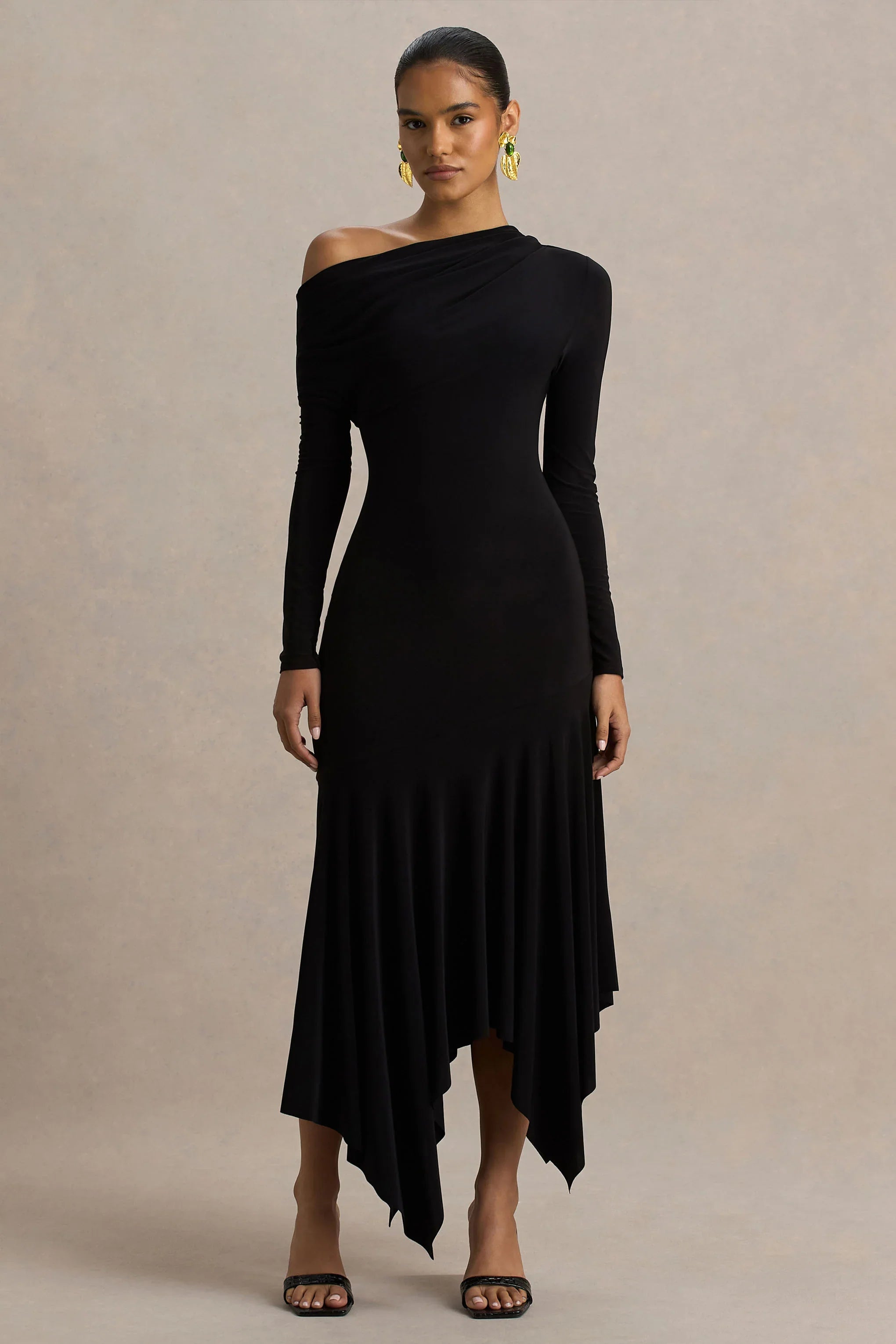 Introducing Isola, where sleek sophistication meets modern edge. Cut from our premium stretch jersey in a timeless black, this striking midi dress is designed to move with you and flatter every curve. The asymmetric neckline and drop-waist silhouette create a unique shape, while the flowing hanky hemline adds soft drama and effortless elegance. Isola is your go-to for standout evenings and chic occasions.