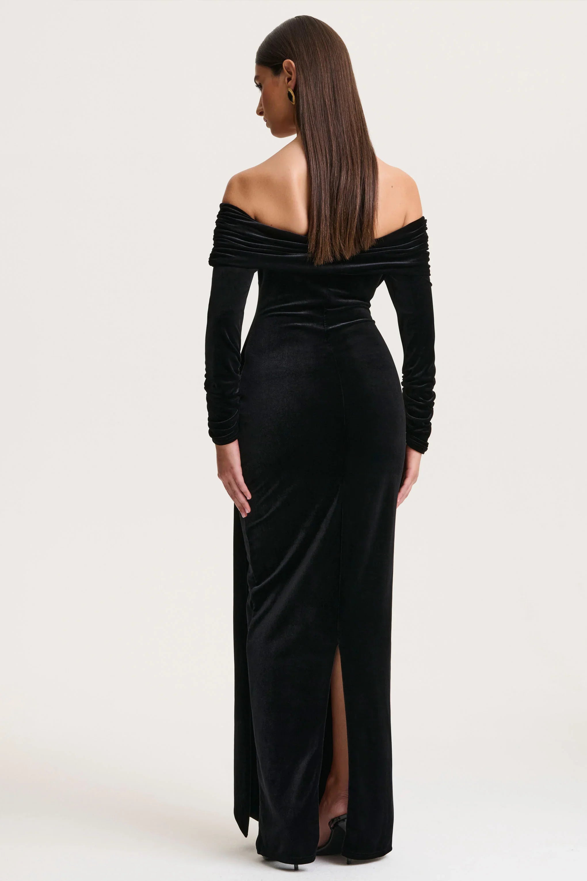 Jessara exudes contemporary elegance with a feminine silhouette. Crafted from our premium stretch jersey in classic black, this maxi-length design drapes effortlessly, enhancing every curve with refined ease. The bardot neckline frames the shoulders with understated allure, while delicate knot and sash details create a sophisticated, sculpted focal point. Finished with a flowing hem for graceful movement, Jessara is designed for moments that demand confidence, poise, and timeless glamour.