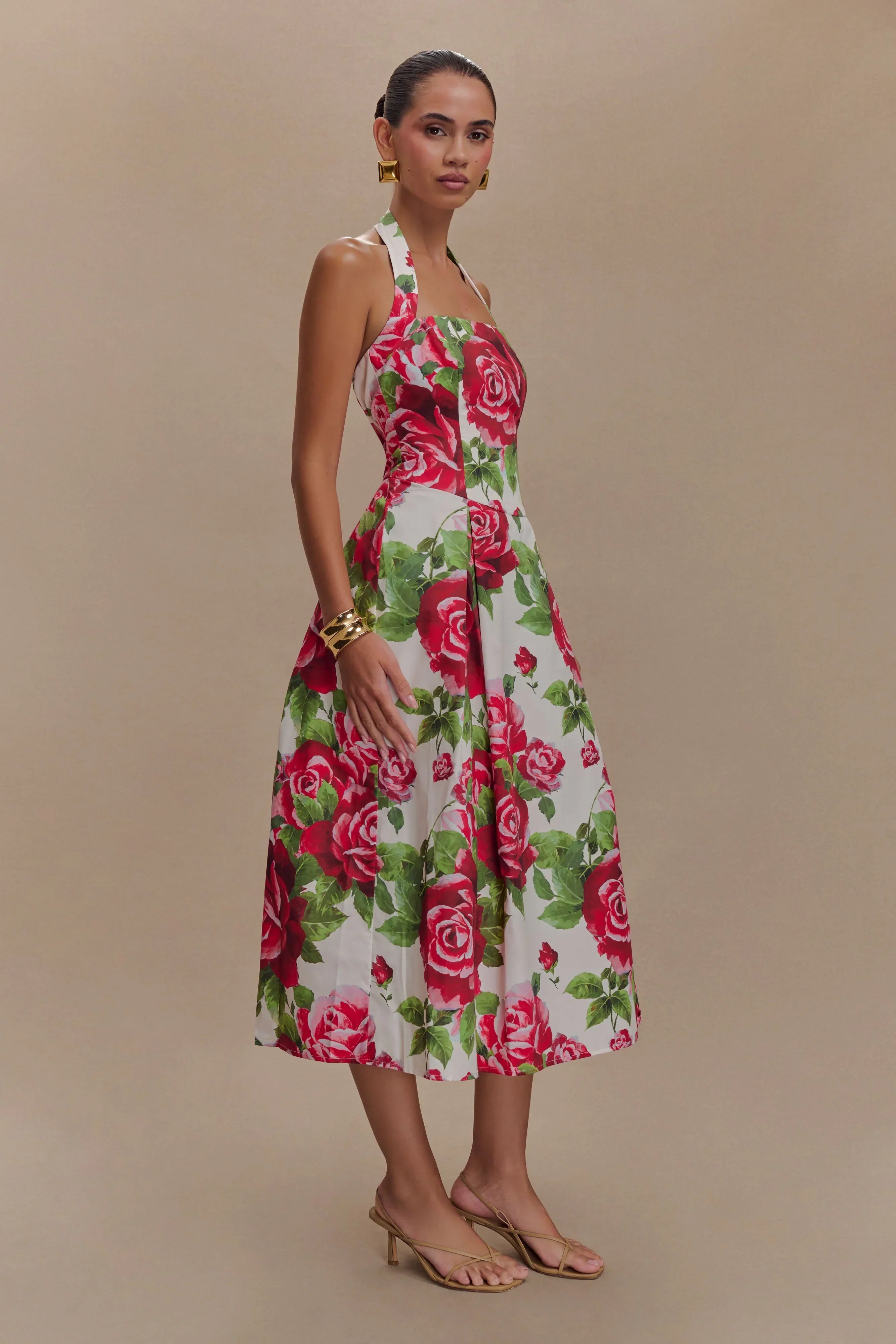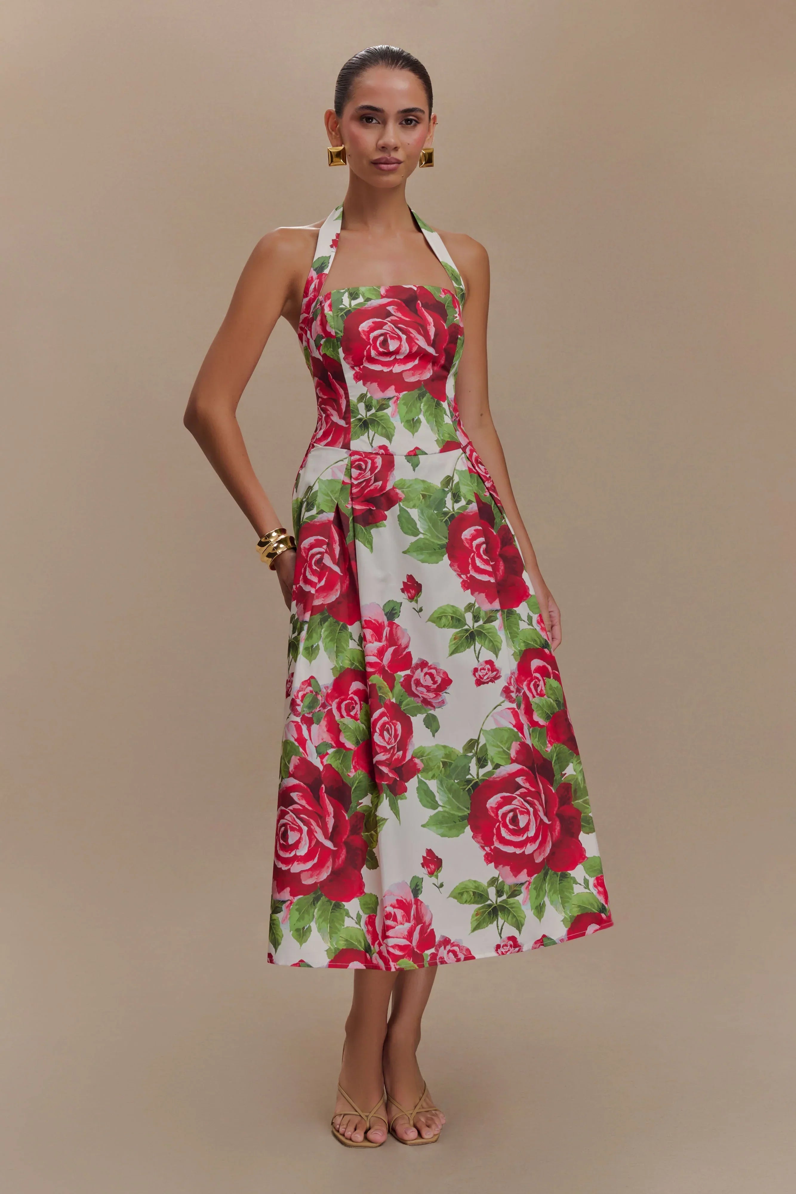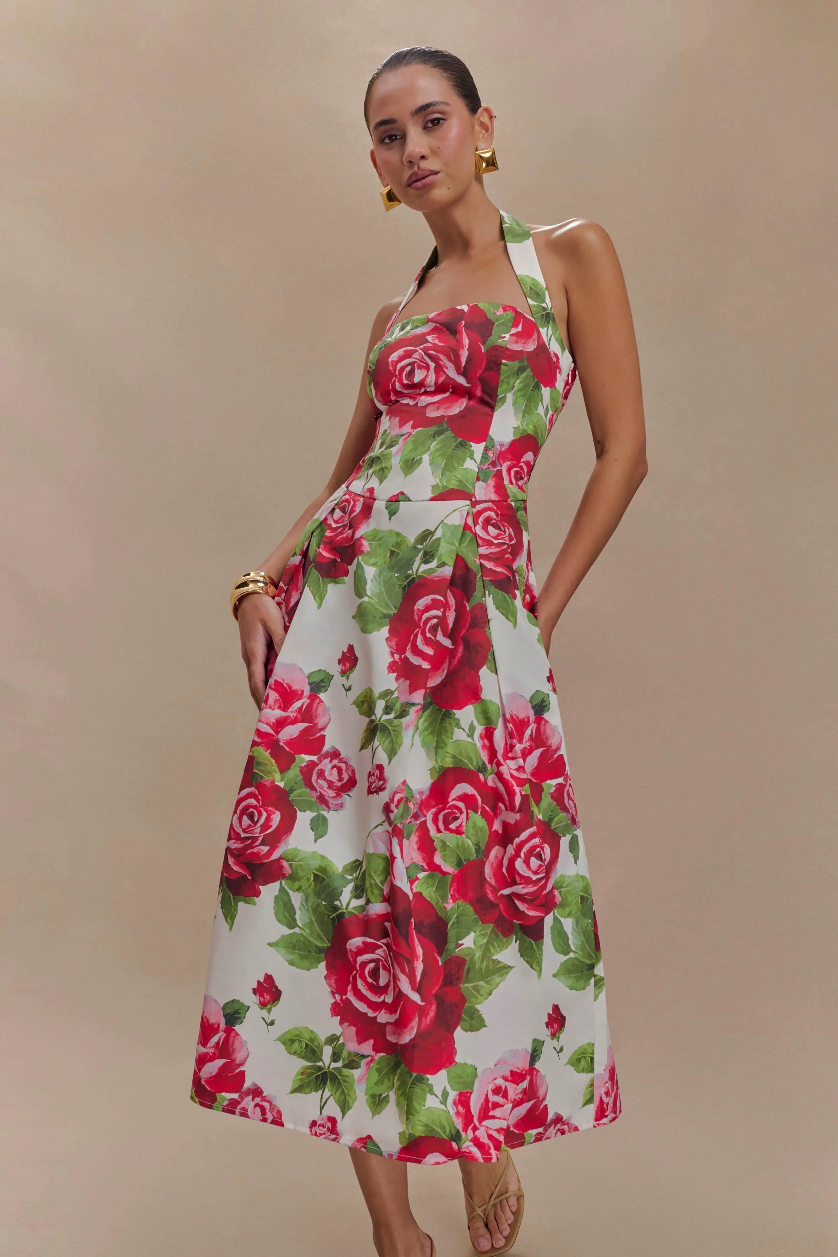 Step into timeless sophistication with the JUANA Halter Midi Dress, a graceful design that exudes femininity. Featuring a flattering halter neckline and a rounded waistline, this dress beautifully highlights your silhouette. The front and back skirt pleats add movement and texture, enhancing its refined charm. Designed in a chic midi length with a discreet side zip for easy wear, this dress is perfect for weddings, soirées, or any occasion where effortless elegance is key.