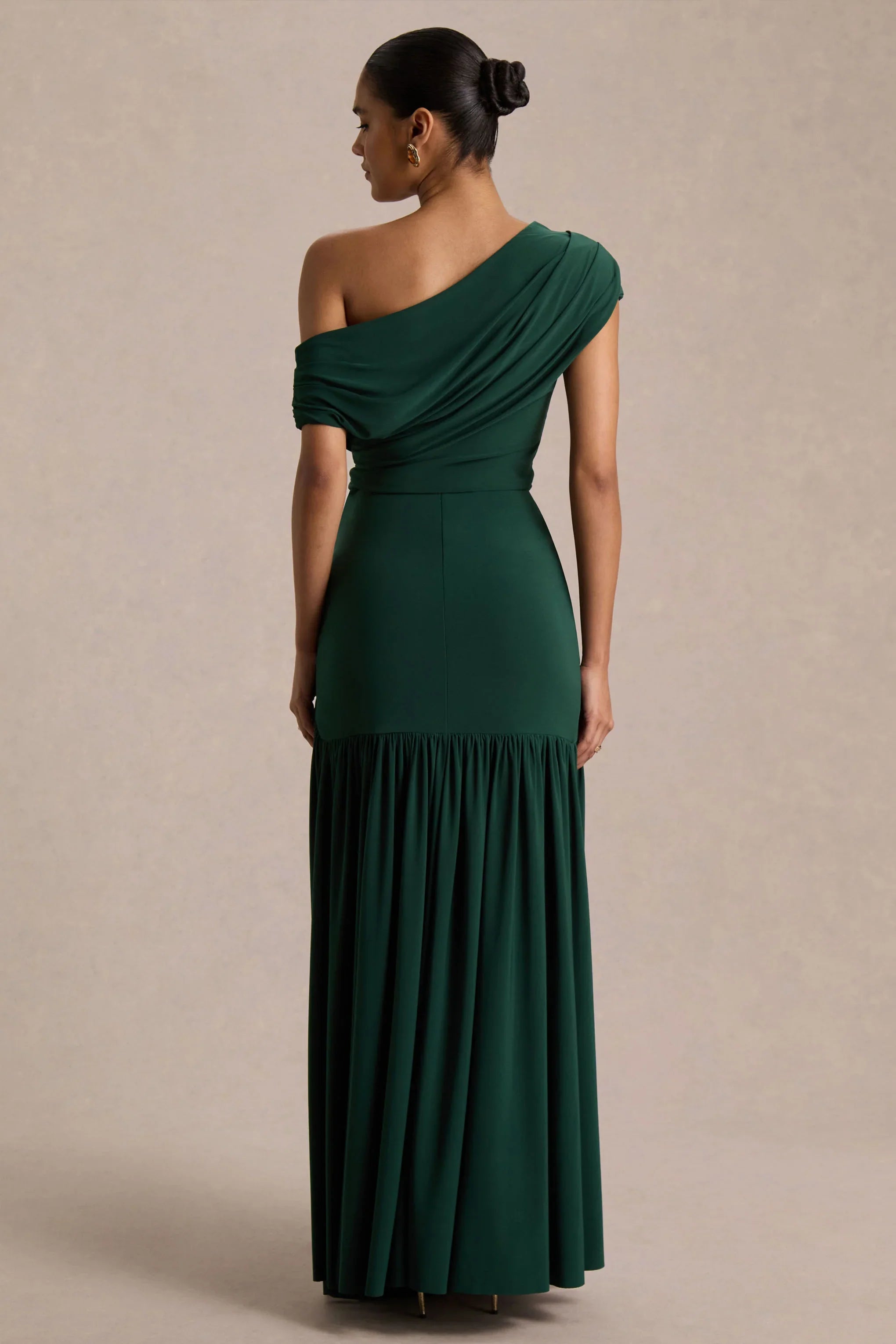 Chic, sculpted, and effortlessly striking, Kady is designed to make an entrance. Crafted from premium stretch jersey in timeless dark green, this maxi dress hugs and drapes in all the right places, ensuring high-impact style. The asymmetric neckline and blouson bodice create a soft, flattering shape, balanced by a ruched detailing that defines the silhouette. Kady moves with confidence and allure, perfect for evening events that call for understated drama..