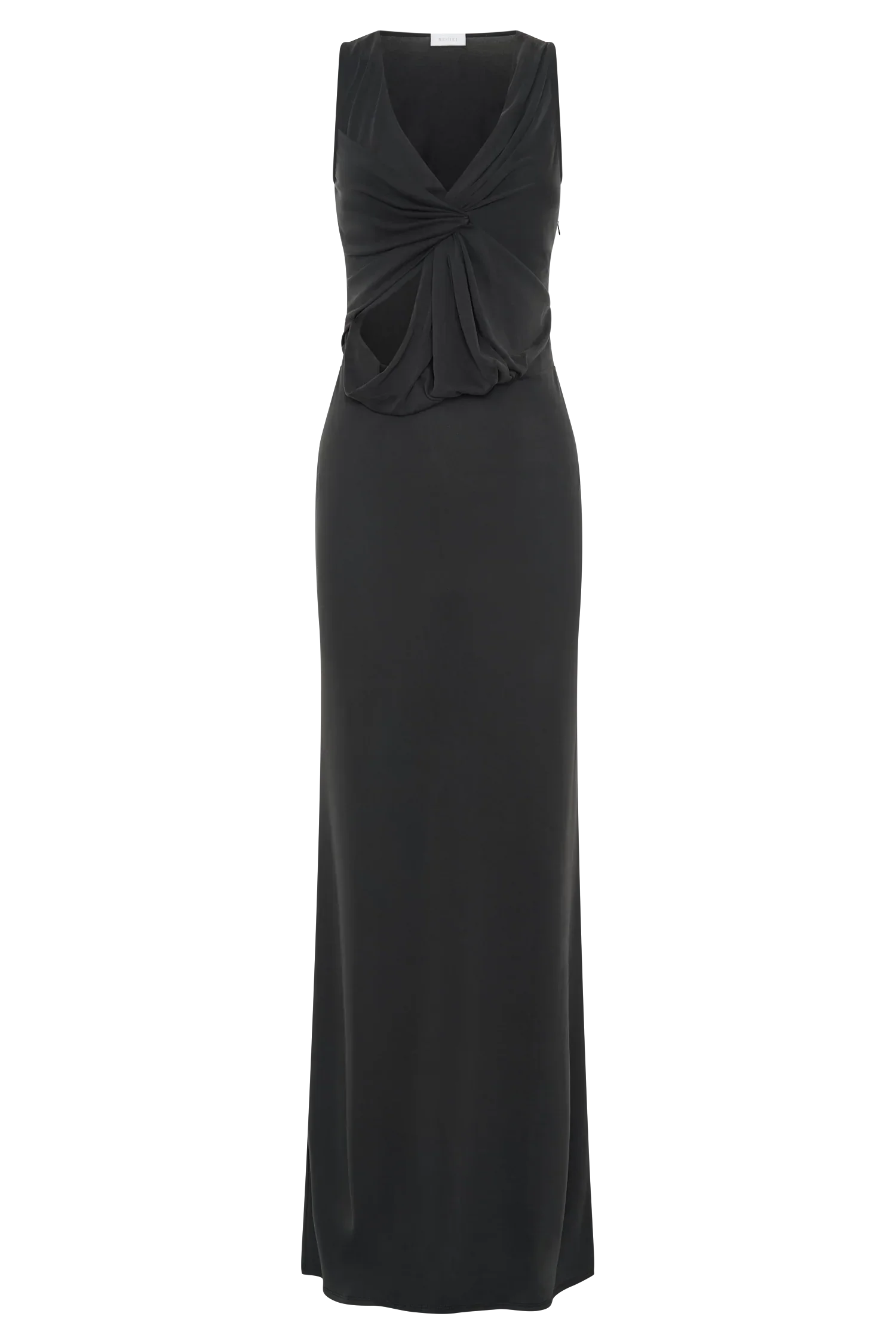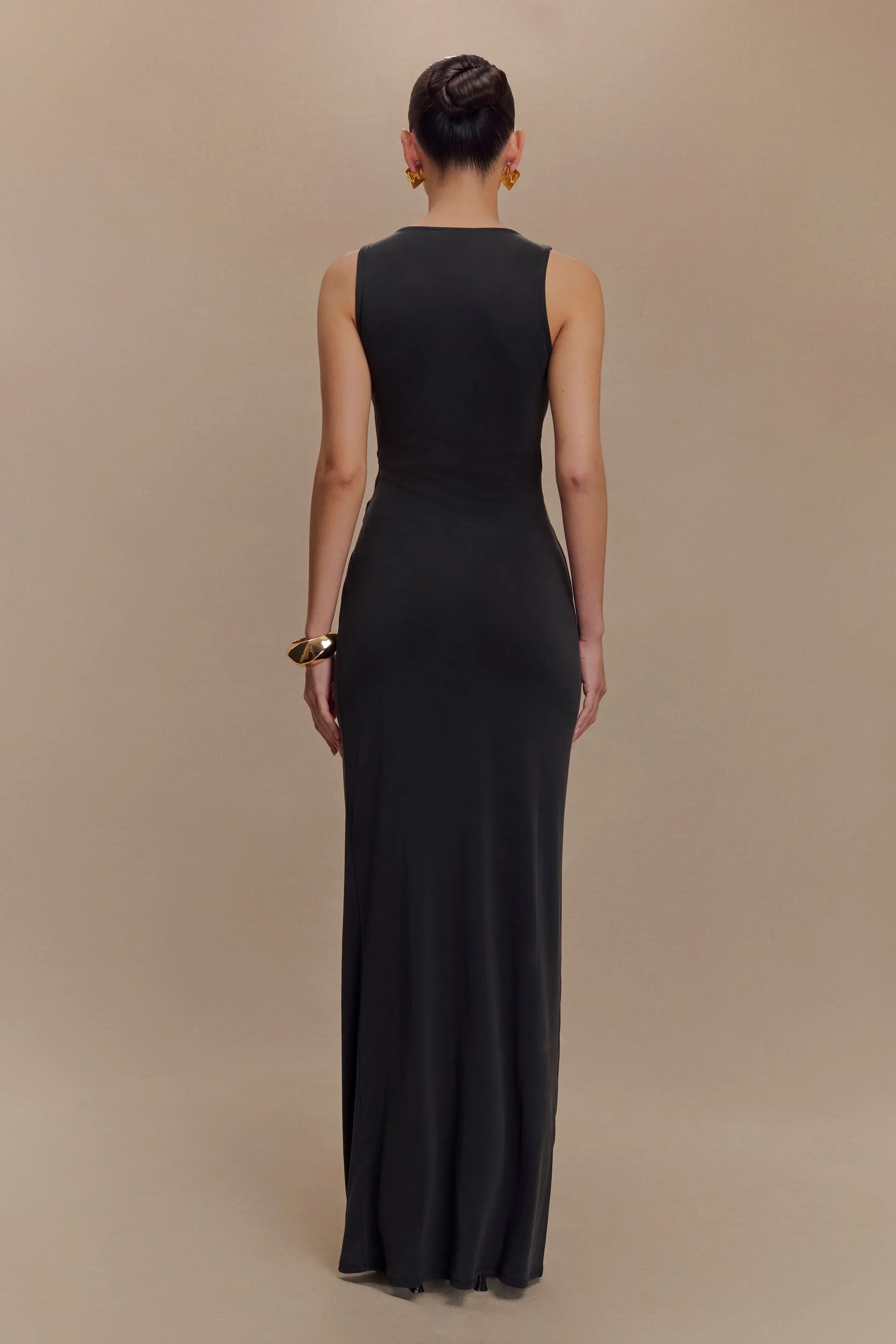 The KASSIDY Peached Jersey Maxi Dress exudes effortless sophistication with its modern twist front neckline and dramatic draped front cutout. Designed to highlight your curves, this sleeveless bodycon dress offers a flattering, form-fitting silhouette that skims your figure beautifully. The maxi length adds an elegant finish, making it the perfect choice for evening events or any occasion where you want to stand out. Crafted from soft peached jersey, this dress combines comfort and style, offering a luxe feel while ensuring you look your best.