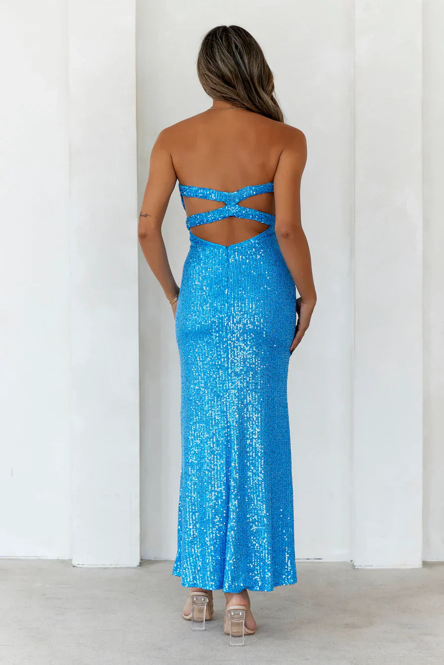 Show up as the luxe girl you know you are. The Knight Awaits Sequin Maxi Dress features a twist front and an open elastic back. Style with heels and curls to impress everyone.