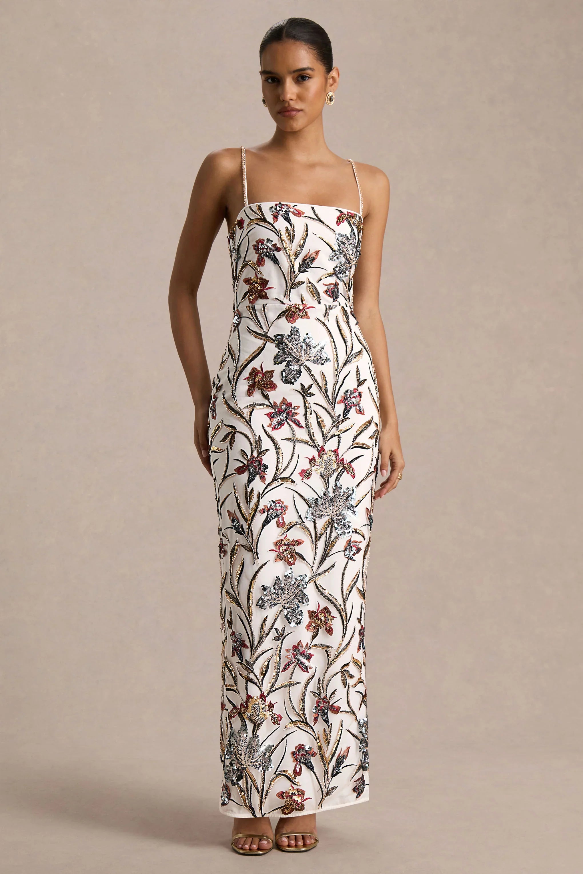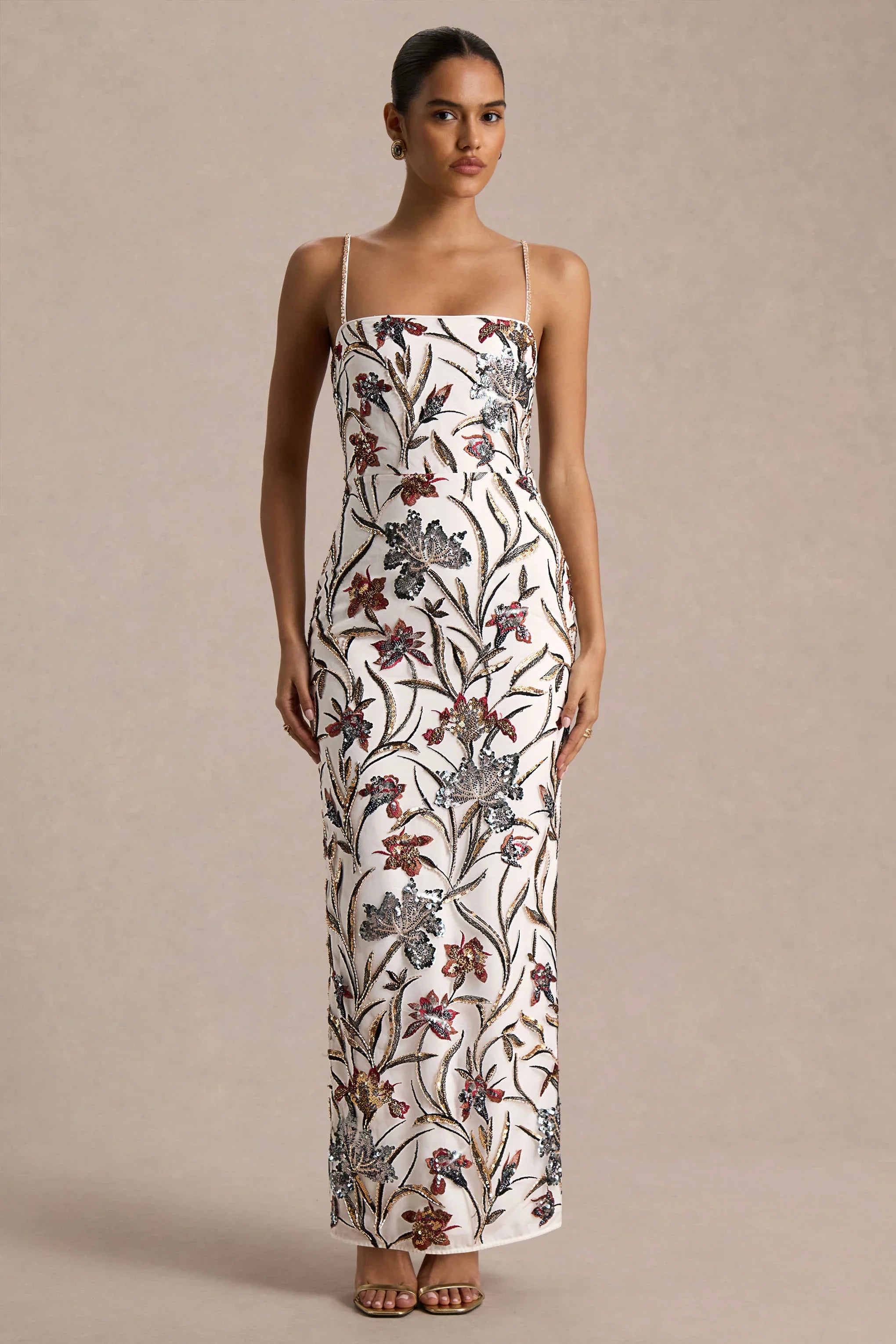 Delicate detail meets timeless glamour in Kyle . Designed in our premium cream floral embellishment, this maxi silhouette is both feminine and striking. The square neckline and adjustable cami straps frame the décolletage beautifully, while the centre-back split ensures ease of movement with a sultry touch. Romantic yet refined, Kyle is the perfect choice for occasions that call for elegance with a statement finish.