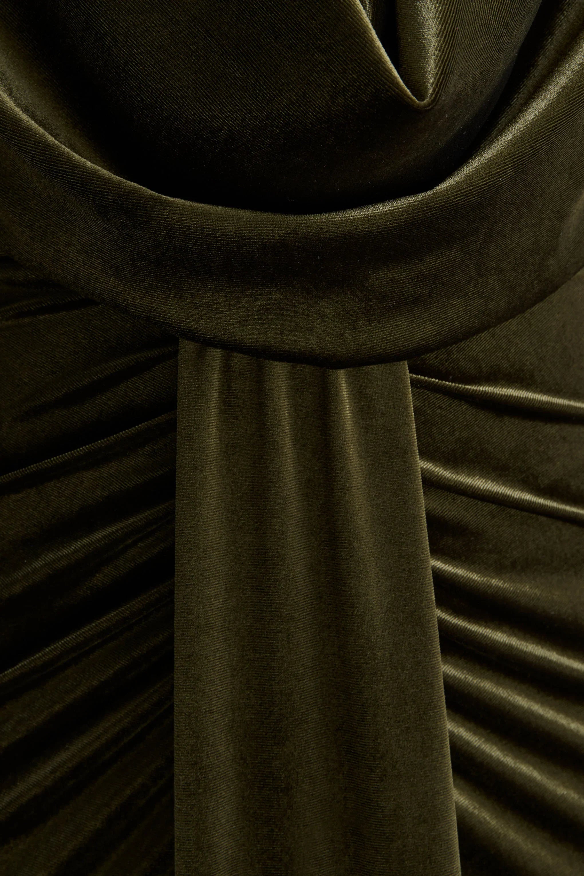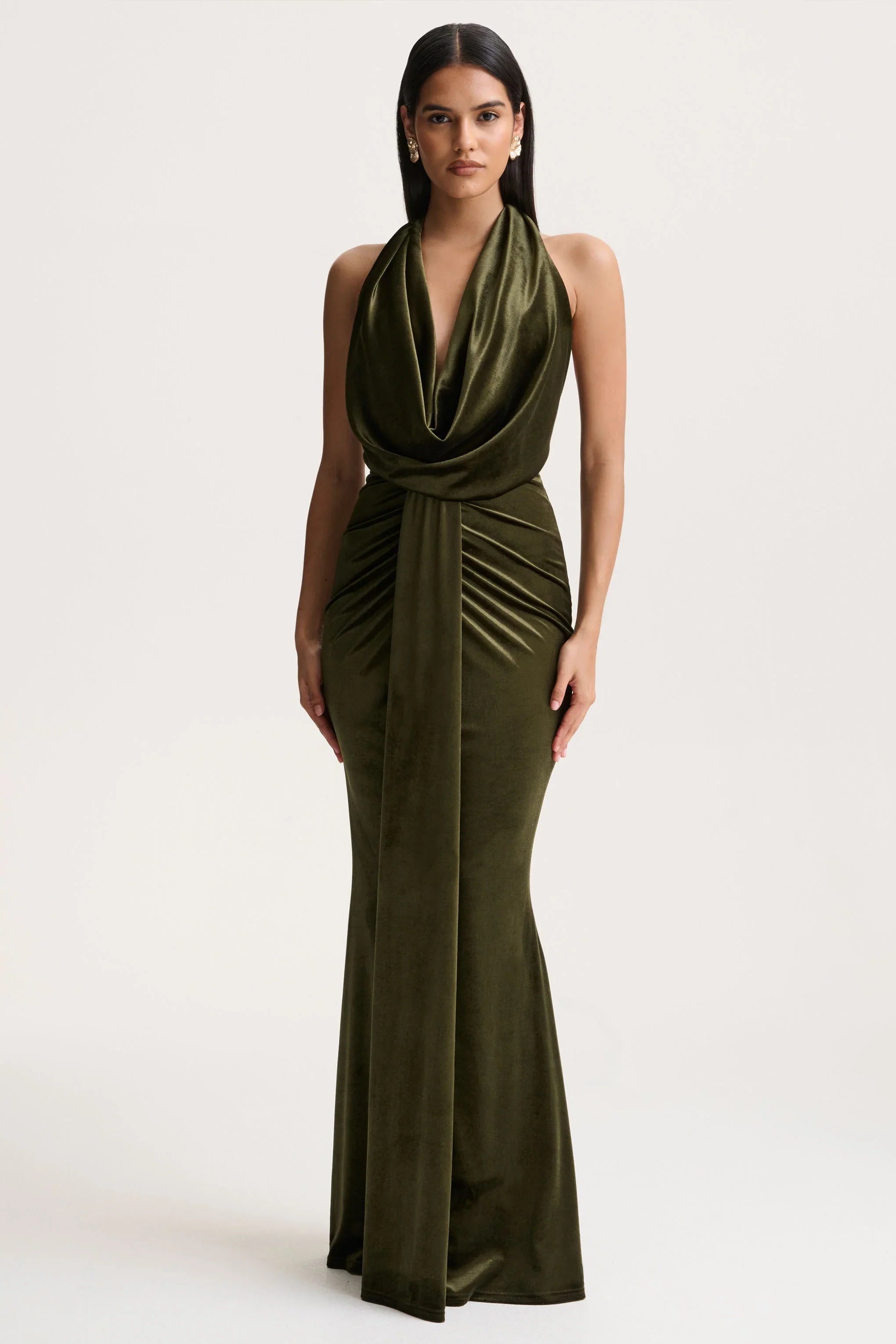 Lavernia embodies timeless glamour with a touch of modernity. Crafted from our premium velvet in a rich olive hue, this maxi-length design flows beautifully over the silhouette. The self-tie halter neckline adds a feminine, adjustable finish, while the draped and gathered detailing sculpt and flatter every curve. Lavernia is a statement in refined elegance, made for evenings that call for effortless sophistication.