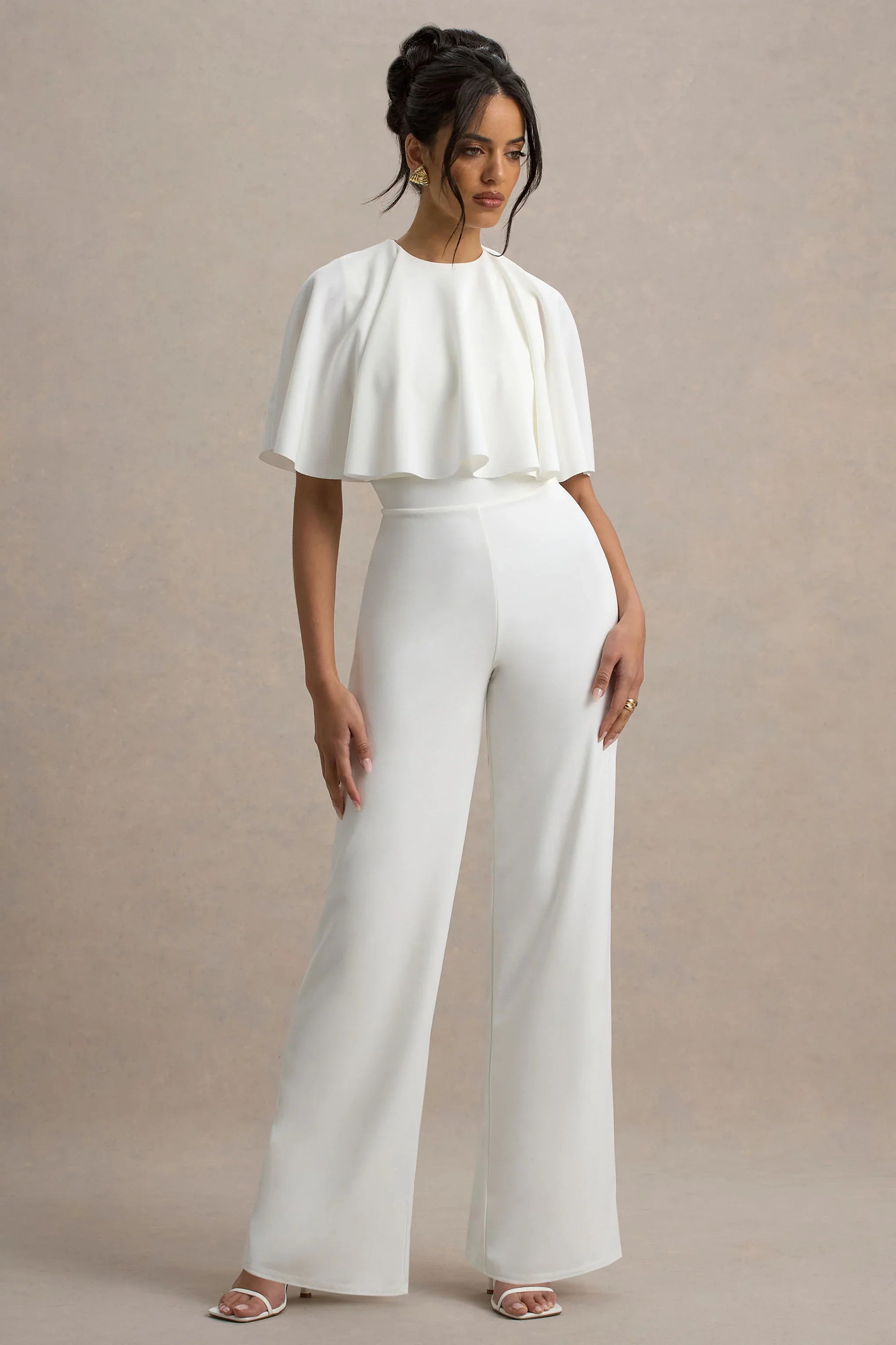 Leanna is the epitome of class and sophistication. Defined by its sleek silhouette and stunning cape detail, this premium white scuba crepe piece is the perfect jumpsuit choice for any formal event. Style yours with sleek accents to let Leanna shine at the forefront.