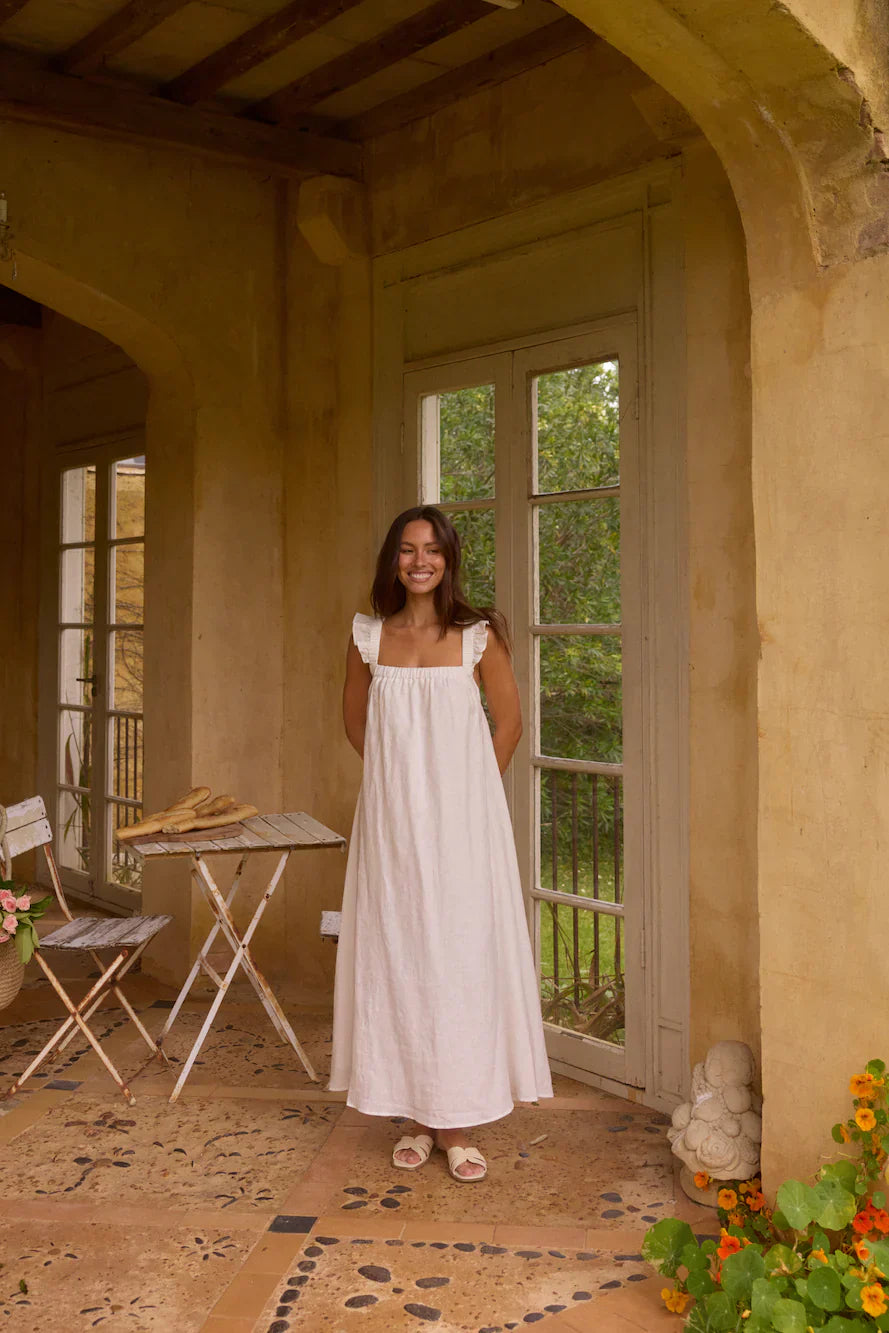 Crafted from 100% premium linen, this dress exudes a classic, feminine charm with a touch of rustic elegance. Its square neckline and gathered bodice create a structured yet soft silhouette, while the wide, ruffled straps add a romantic, cottage-inspired touch. The flowy, A-line skirt and premium linen fabric give it an effortless, breathable feel, perfect for warm-weather occasions or laid-back, yet sophisticated, styling.