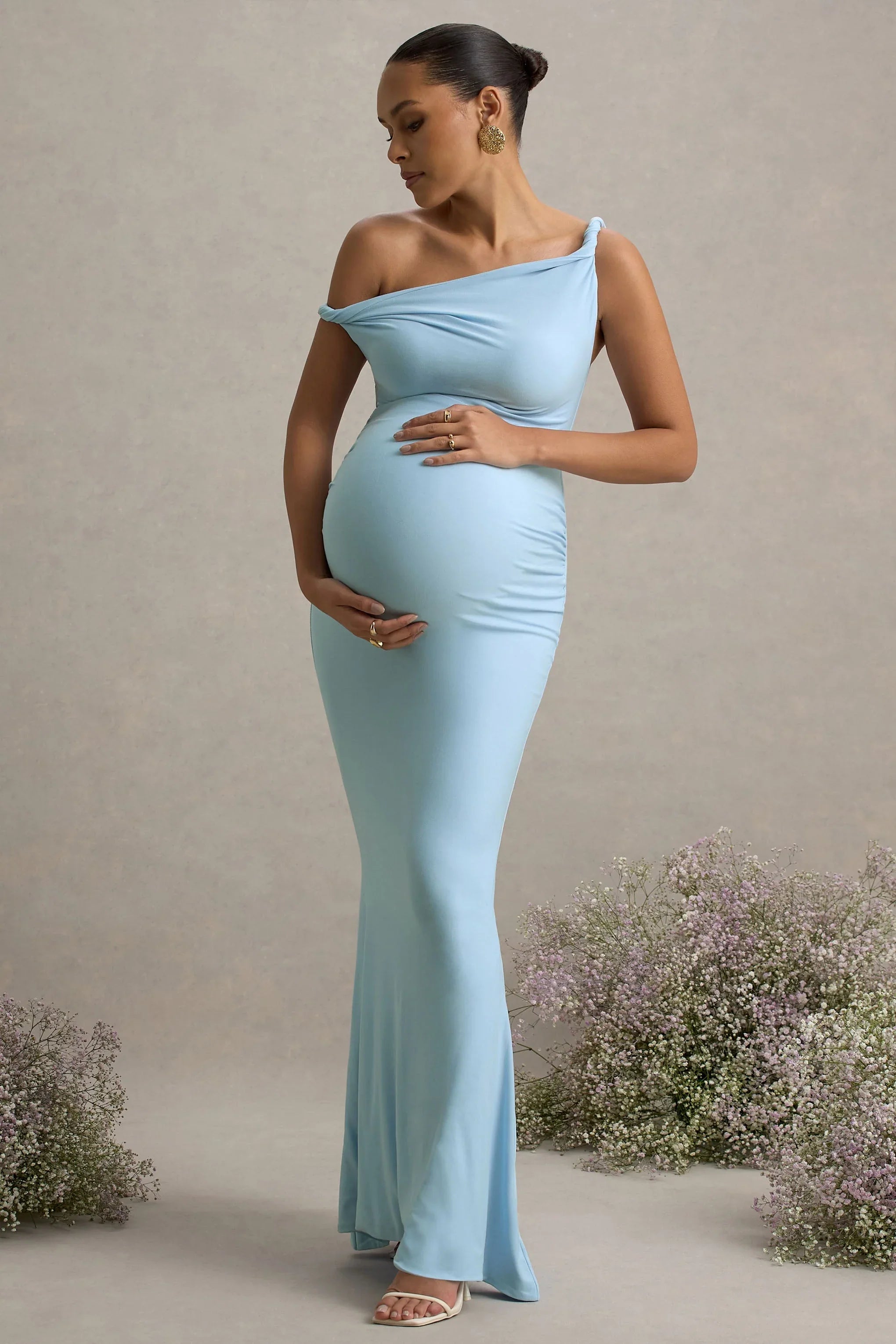 The latest must have maxi of the season is Lita. This maternity maxi dress has been cut in a powder blue shade of our premium stretch jersey that hugs every curve. Boasting a twisted asymmetric neckline, style this stand-out staple with a tousled bun and some gold accents for a classic look.