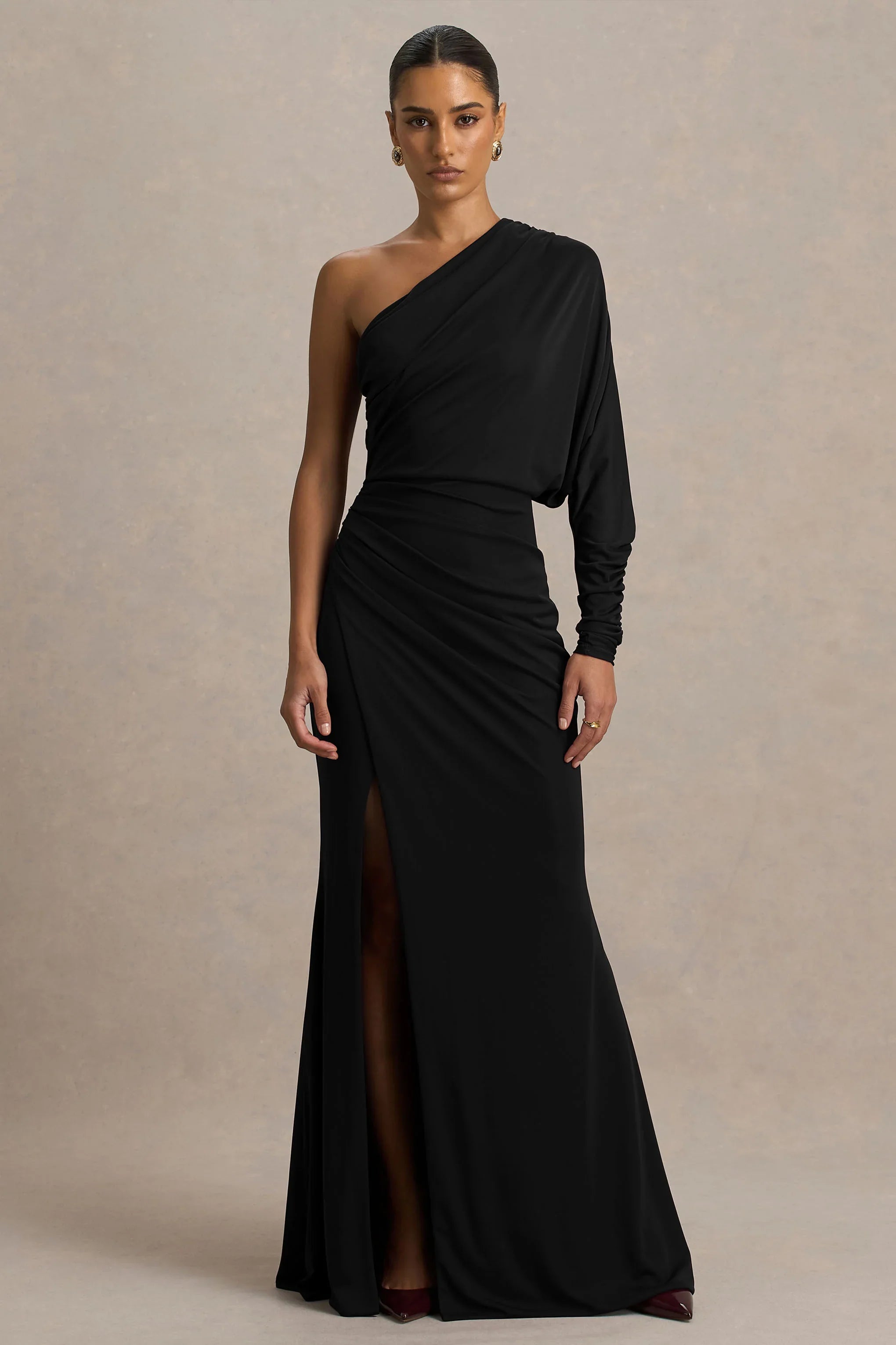 Step into drama with Lola, a statement piece that turns every entrance into a statement. Crafted from our premium black stretch jersey, this maxi gown flows effortlessly to floor-skimming perfection, hugging your curves in all the right places. The asymmetric neckline and batwing sleeves create a striking silhouette, balancing bold structure with soft, effortless elegance. Gathered detailing and a wrap skirt enhance movement and fluidity, while the front high split adds a daring touch of allure. Perfect for evening soirées, red-carpet moments, or unforgettable nights out, Lola is a show-stopping choice for every occasion.