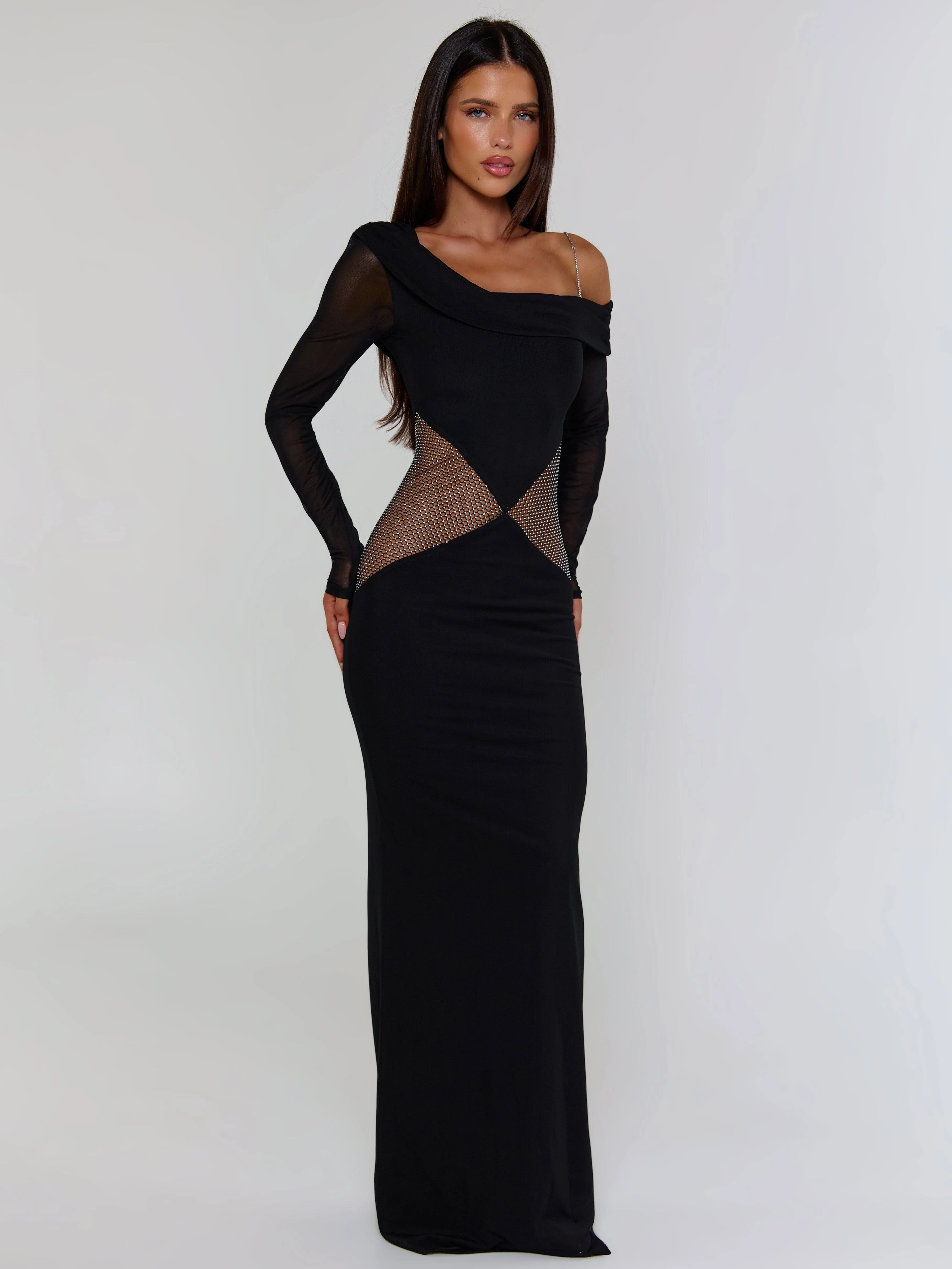 Crafted from soft black jersey, she features sheer mesh panels at the waist adorned with sparkling diamante detailing for a bold, sculpted look. The asymmetrical neckline and delicate shoulder chain strap add a touch of edge, while her long sleeves and body-con fit balance sexy and elegance.