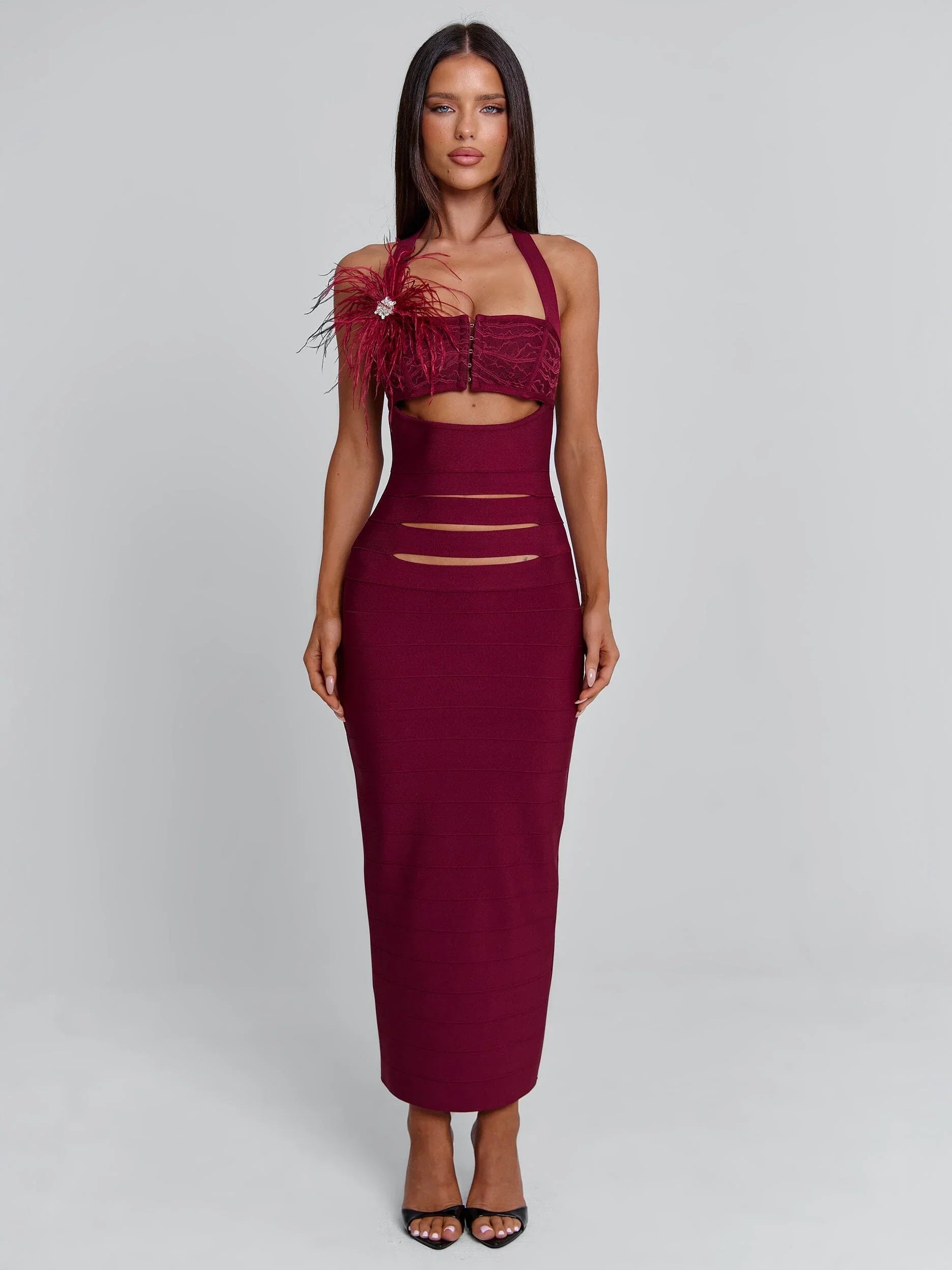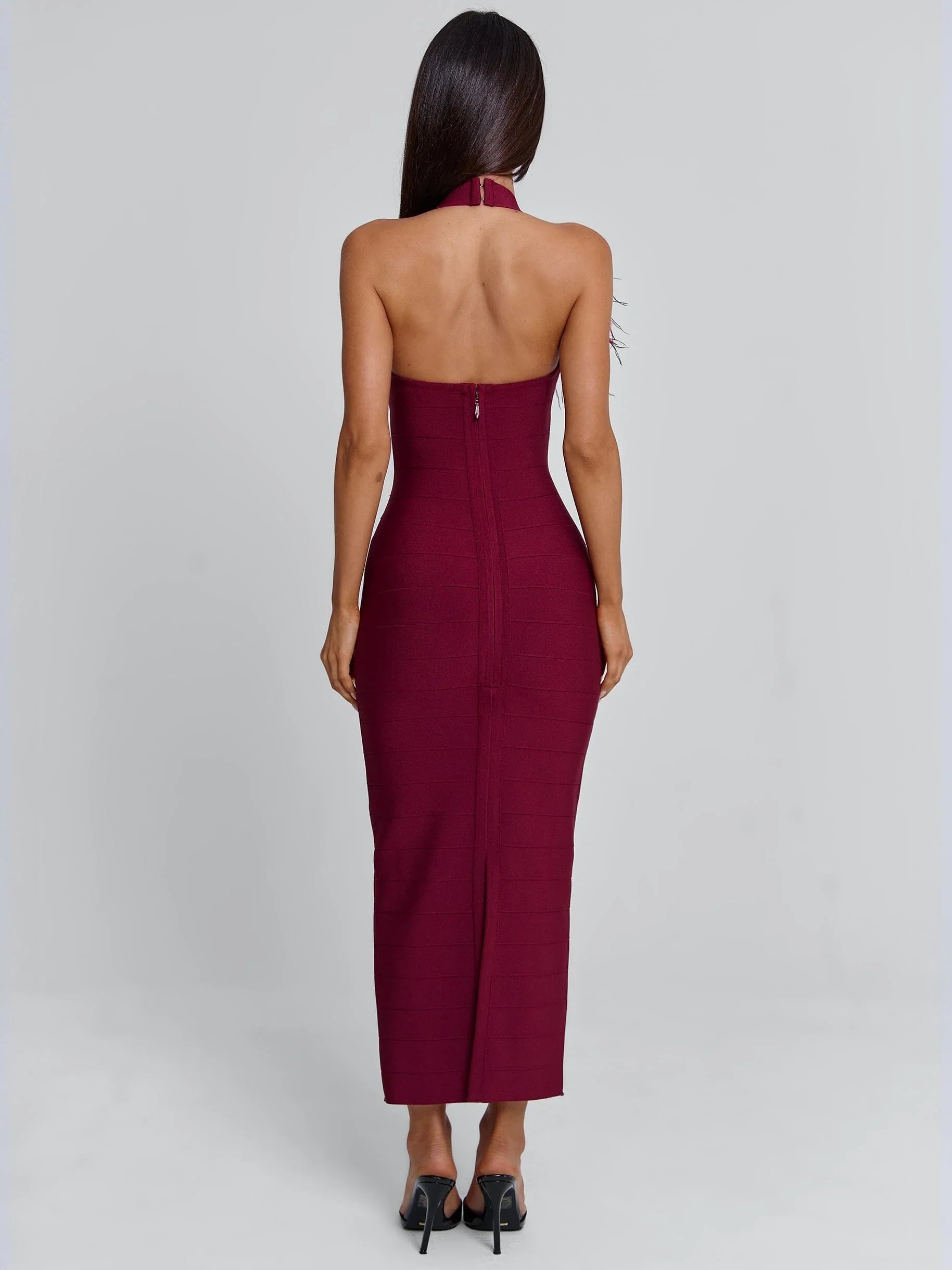 Crafted from a super-stretch bandage fabrication, she smooths and shapes the body while offering a comfortable, contoured fit. A slit detail through the bodice and a hook-and-eye accent at the bust add subtle structure, while the detachable feather brooch allows you to customise your look. Finished with a clean clip closure at the back of the neck, Lunabelle is the perfect blend of simplicity and statement.