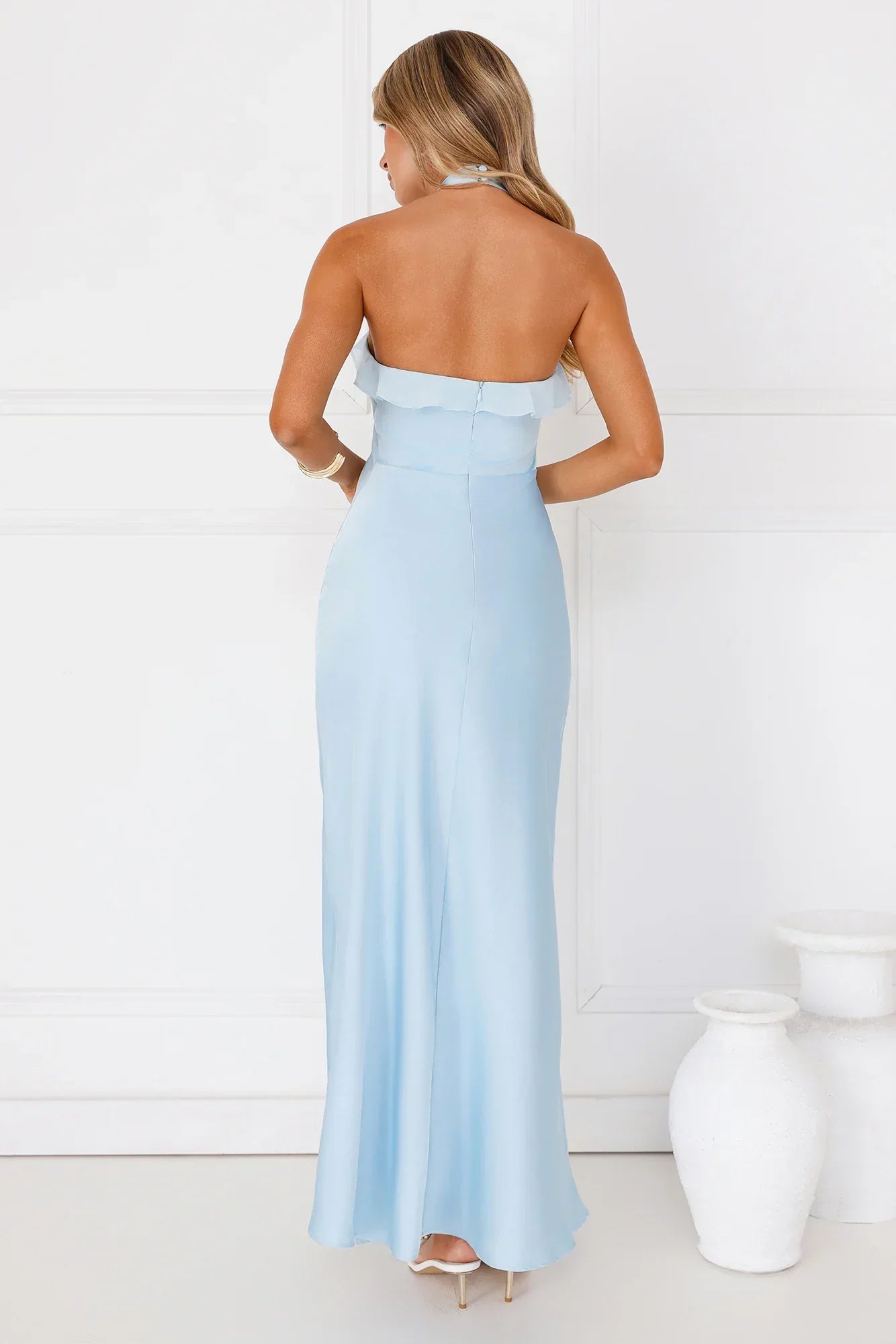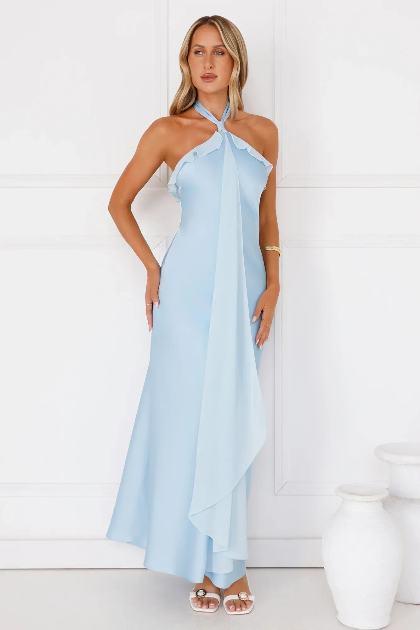 Shine bright in the Luxora Lady Halter Satin Maxi Dress. Featuring smooth satin, a sophisticated halterneck with button closure, and delicate chiffon-style frills, this dress is the perfect mix of grace and glam. Effortlessly chic and made for unforgettable nights. Style with heels.
