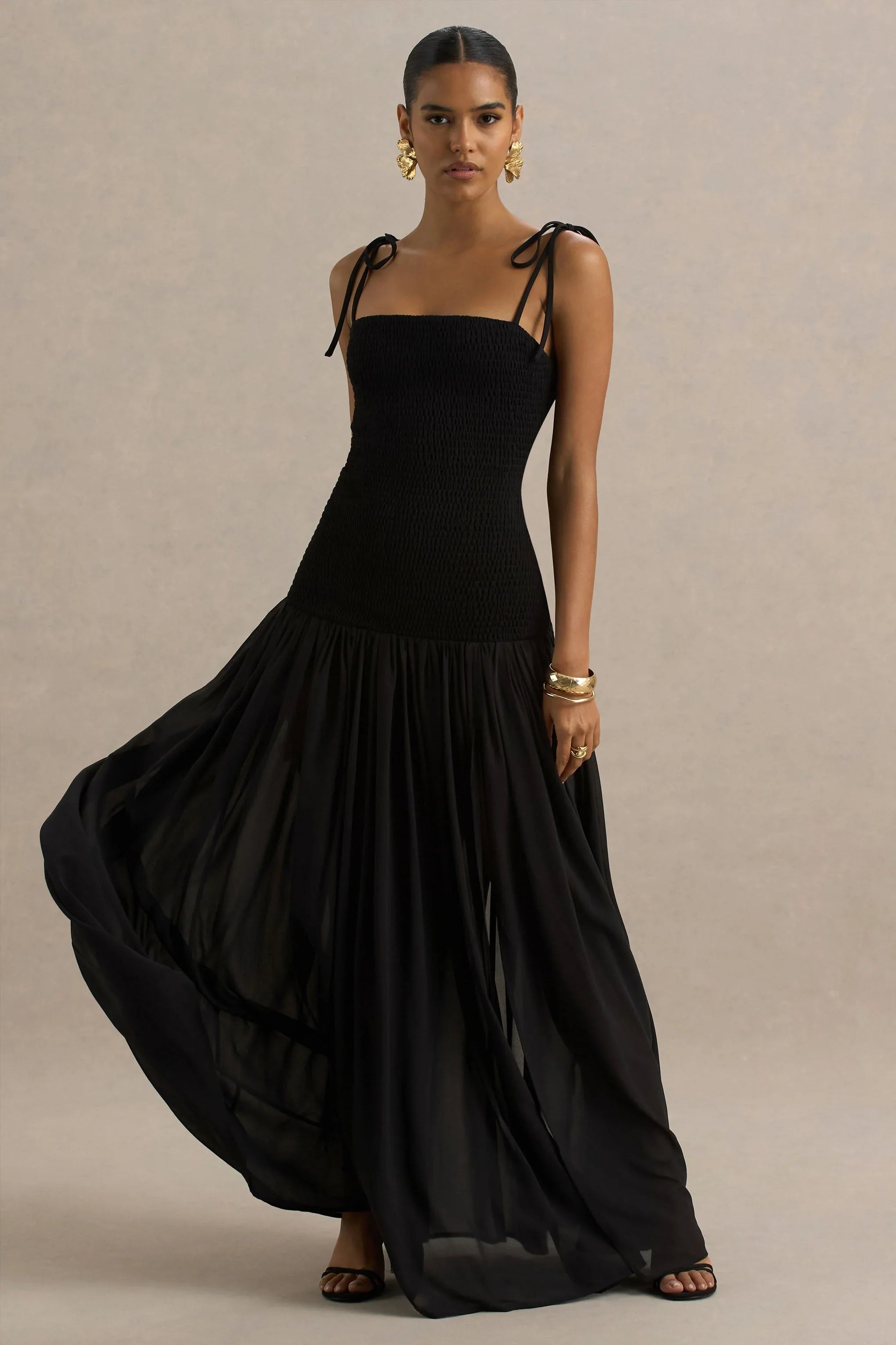 Make a dramatic statement this season in Maeva. Crafted in a blend of our premium stretch jersey and chiffon in a striking black shade, this maxi dress exudes elegance from every angle. Featuring a feminine square neckline and delicate self-tie straps that gorgeously frame your decolletage. Maeva is expertly designed to flatter your figure with a shirred bodice and drop waist to enhance your hourglass silhouette. Finished with a sheer chiffon skirt, cut with a front split, that moves effortlessly with every gesture. This maxi is made for memorable moments.