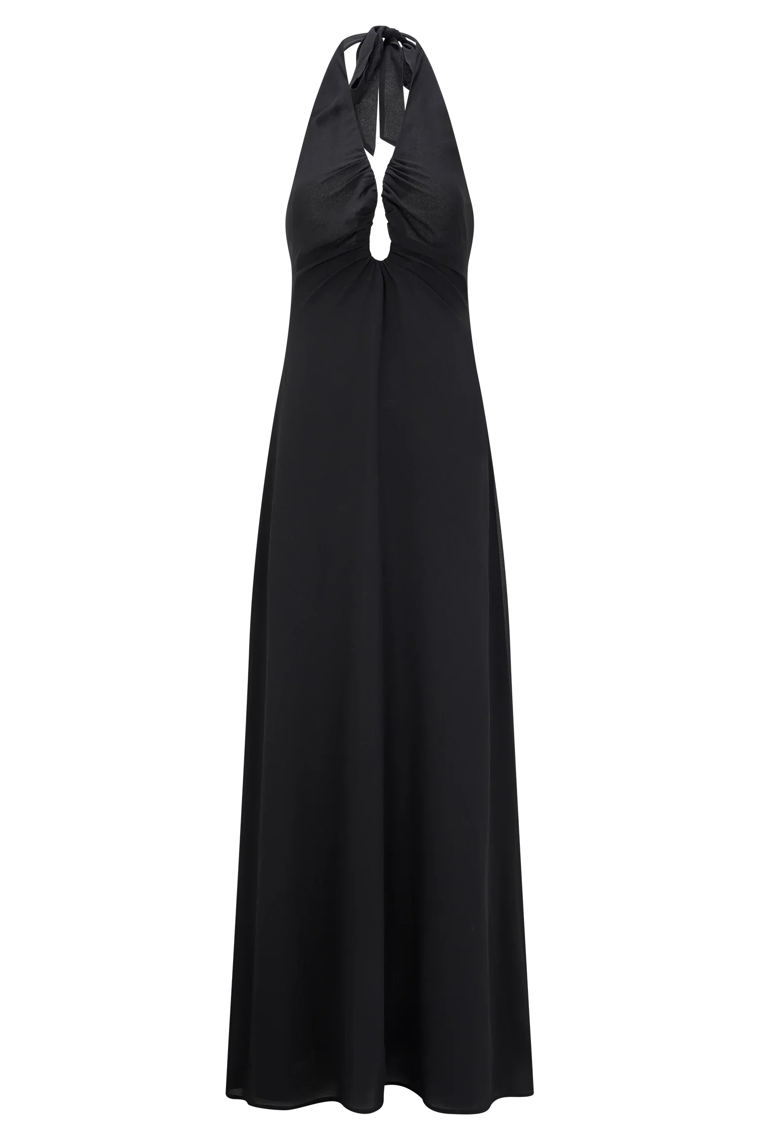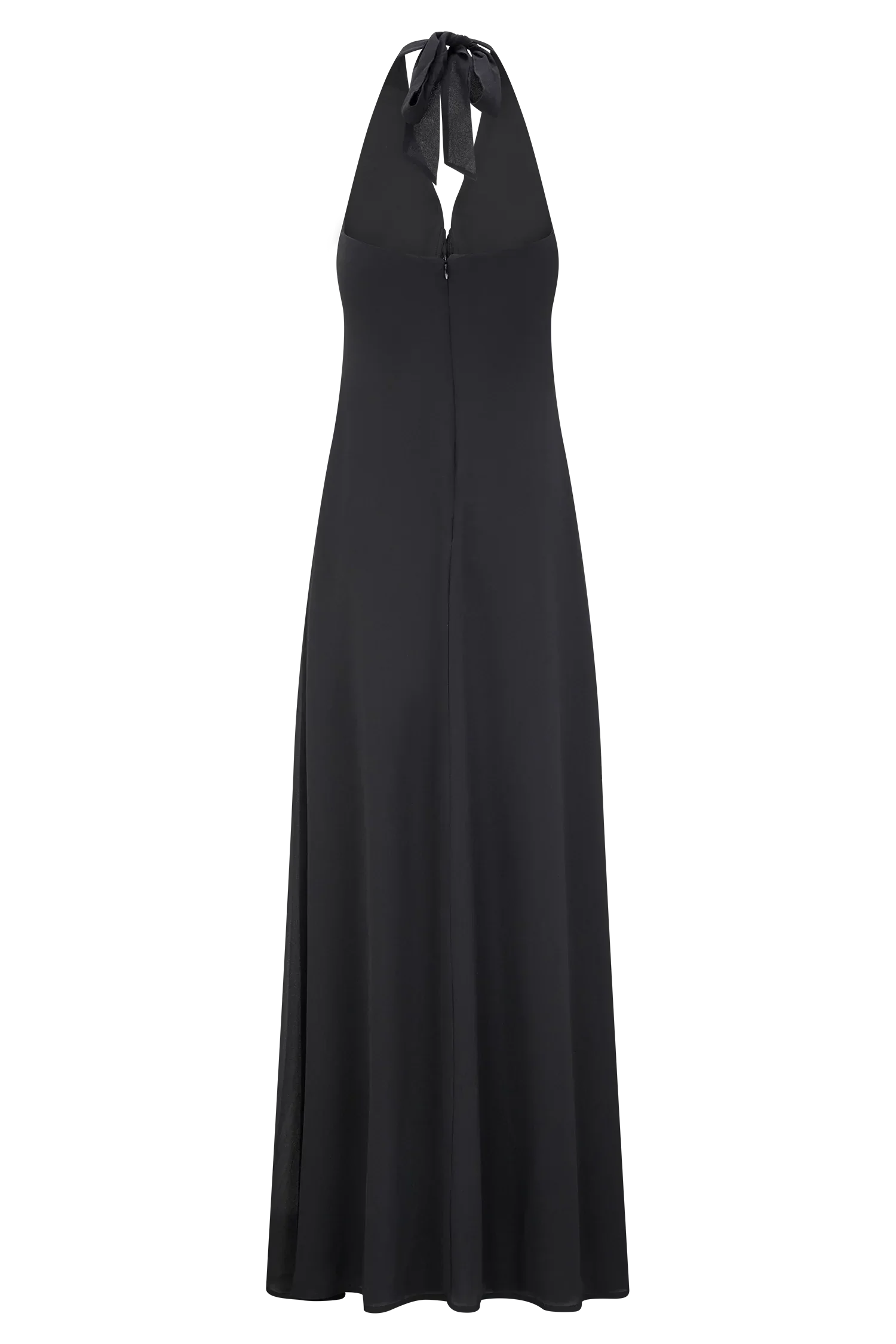 The MALAKHAI Chiffon Halter Maxi Dress is your go-to for effortless glamour, from sunlit lunches to evening soirees. Featuring a deep V halter neckline with subtle front gathering and a structured wire insert to hold its shape, this silhouette flatters with a bodycon fit through the bodice and a soft A-line flare at the hips. A side seam invisible zipper keeps the finish clean, while the sleek hardware neck closure adds a refined edge. Fully lined and designed without padding for a natural, easy fit, this dress is made to move with you from day to night.