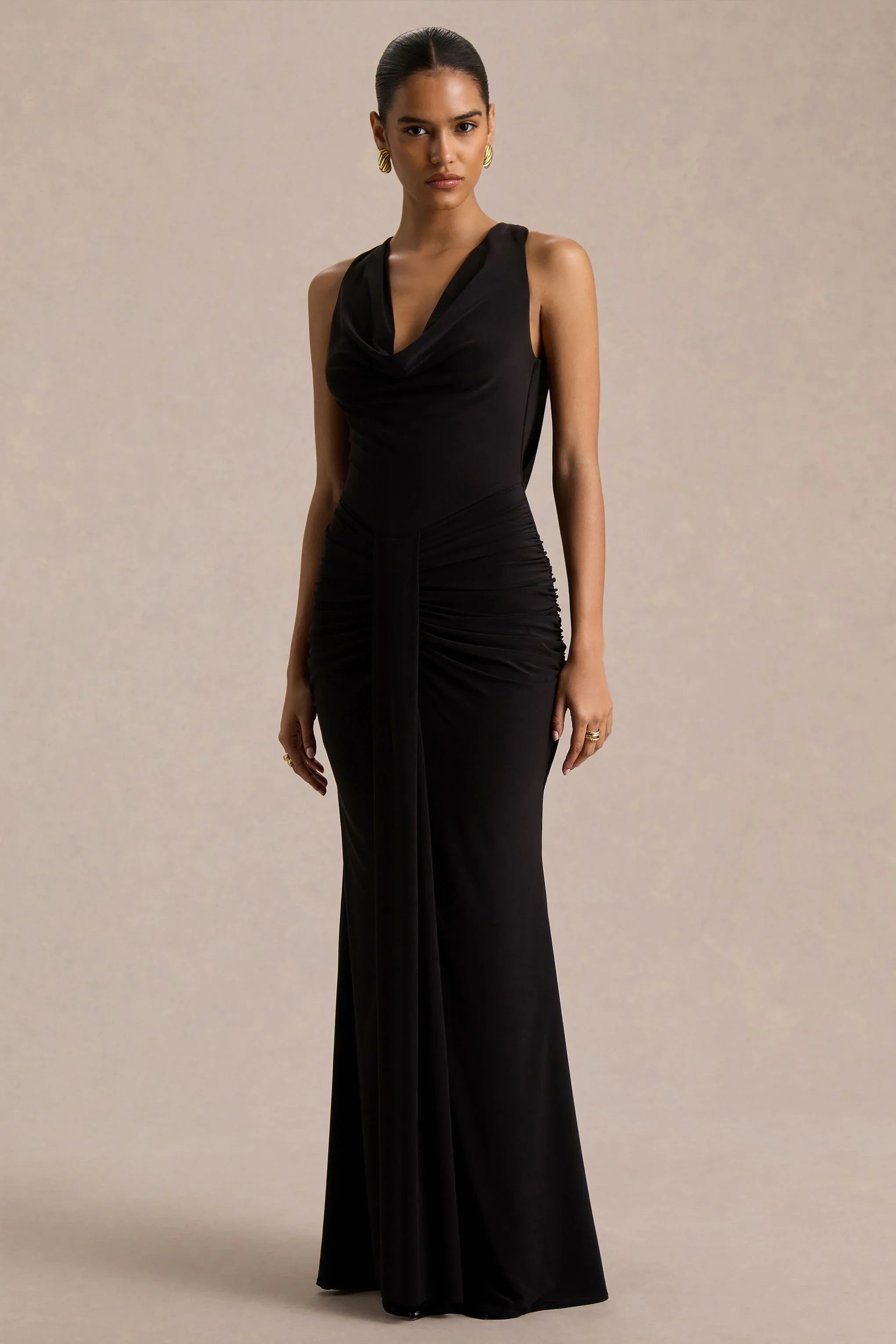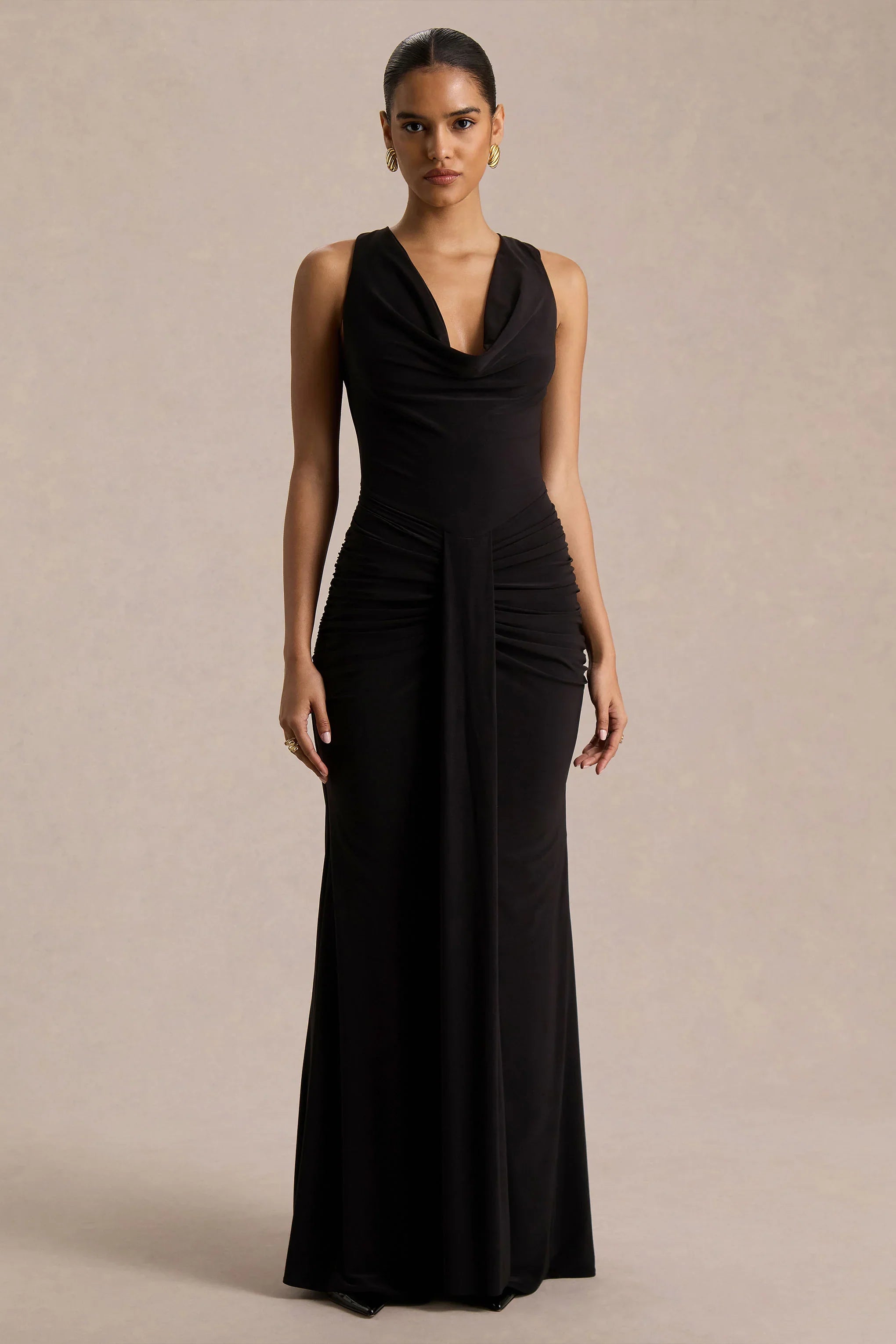 Mallie is elegance with a daring twist, made to leave a lasting impression. Cut from our premium black stretch jersey, this maxi dress smooths and flatters with a body-skimming silhouette. The draped cowl neckline flows into an open back with a delicate tie detail, striking the perfect balance of sophistication and allure. Gathered detailing and a sash accentuate the waist, ensuring you are flattered from all angles. Mallie is pure evening glamour, designed for unforgettable nights.