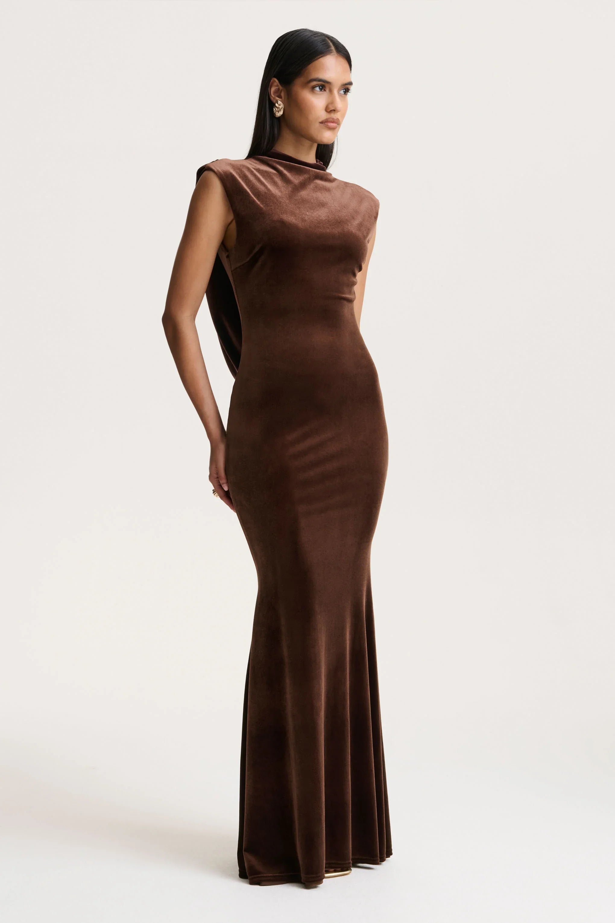 Malora captures the essence of modern elegance with a touch of allure. Crafted from our premium velvet in a rich brown hue, this maxi-length design flows effortlessly over the silhouette. The high neckline adds refined sophistication, while the draped open-back detail creates a striking, feminine contrast. Malora is made for evenings that call for confidence, grace, and timeless glamour.