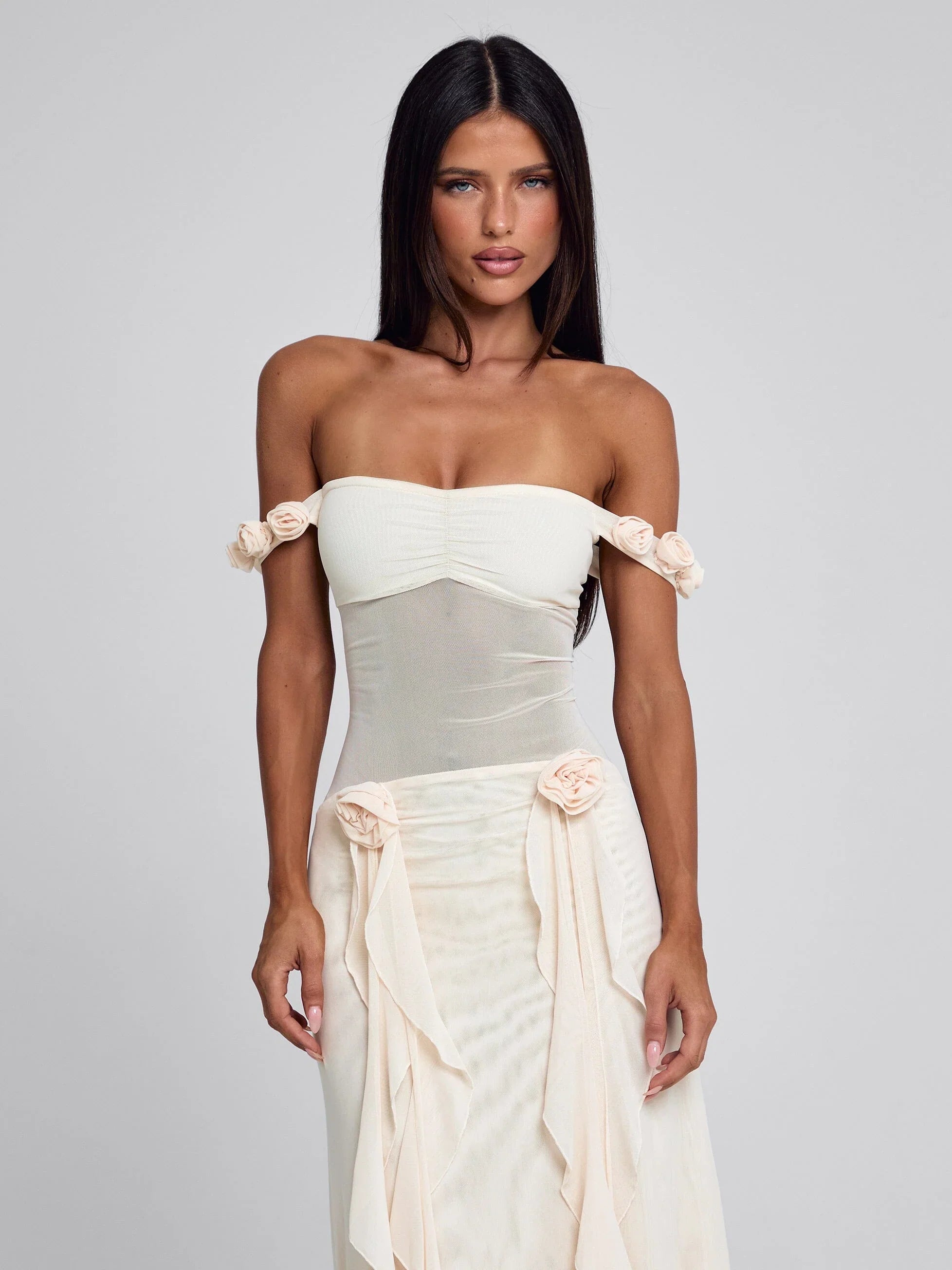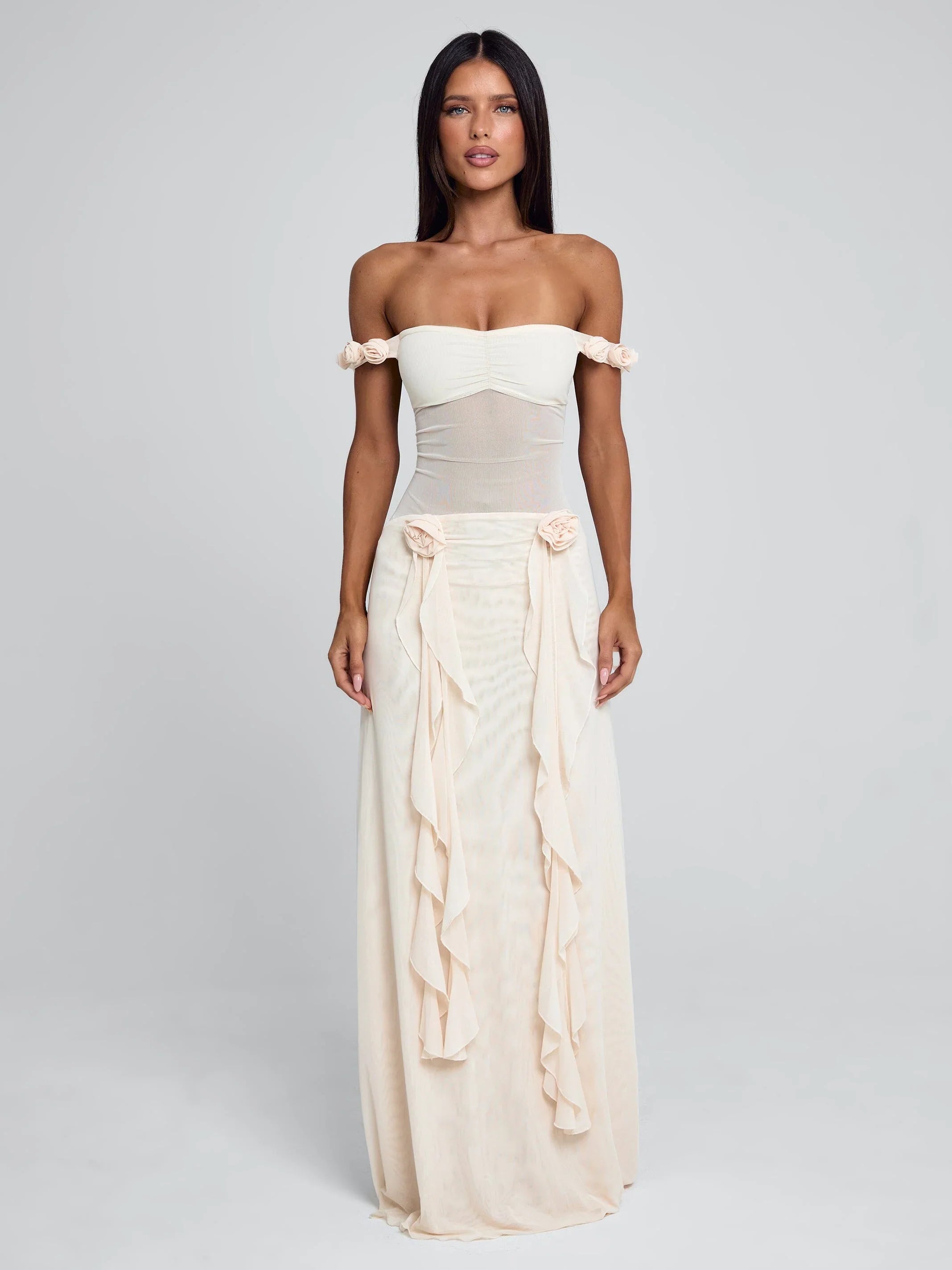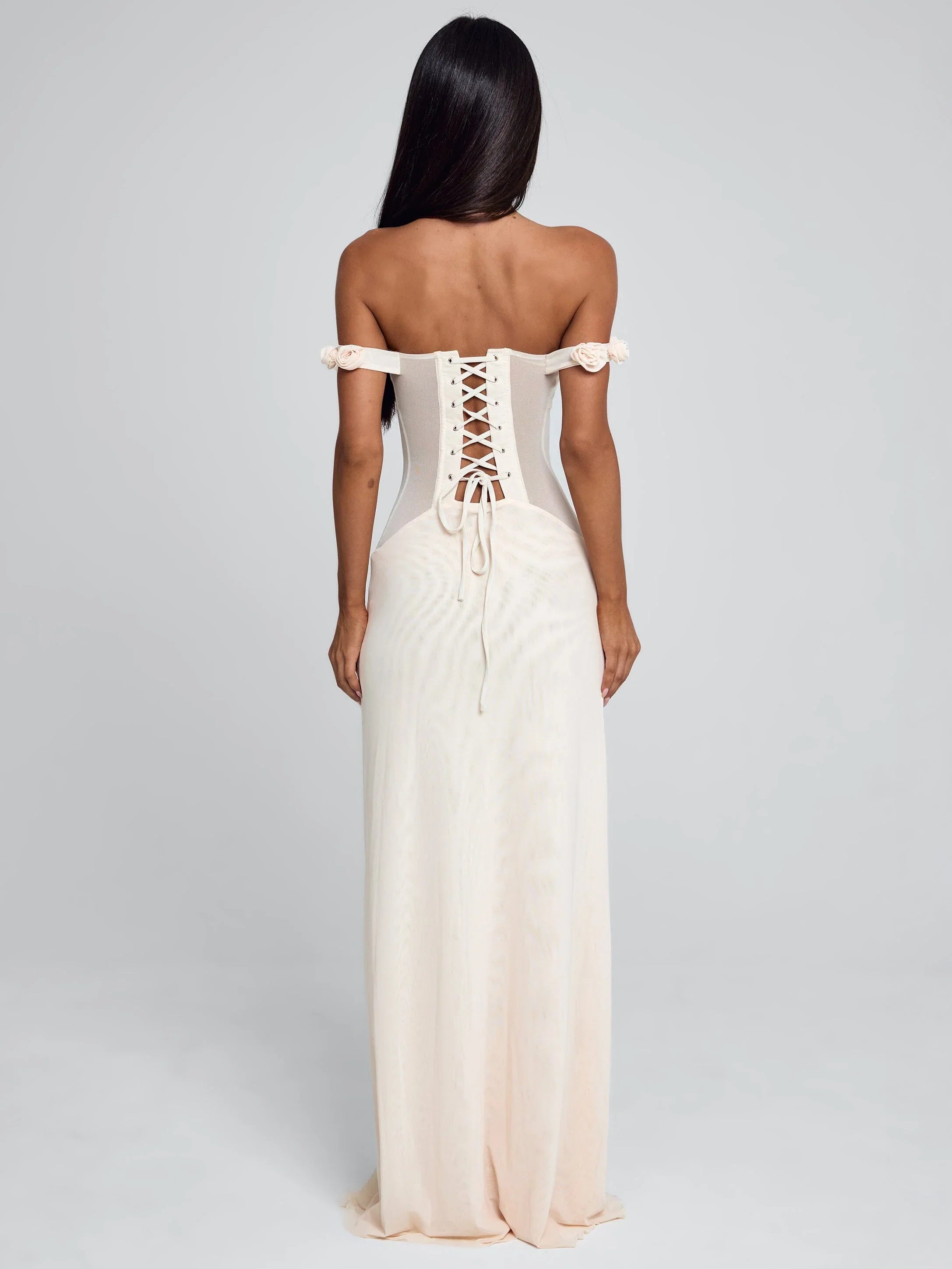 Crafted from delicate mesh, she features a sheer bodice with a corset lace-up back that sculpts and flatters the figure. The off-shoulder rosette details and cascading front flounce add a touch of elegance and movement, perfectly balancing structure with softness.