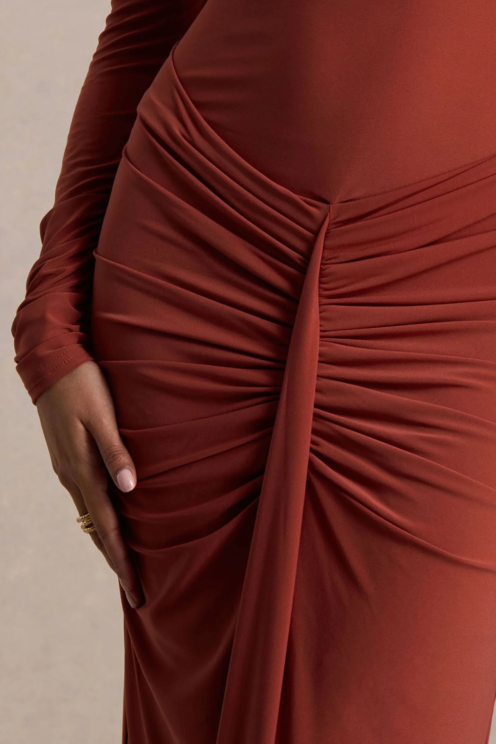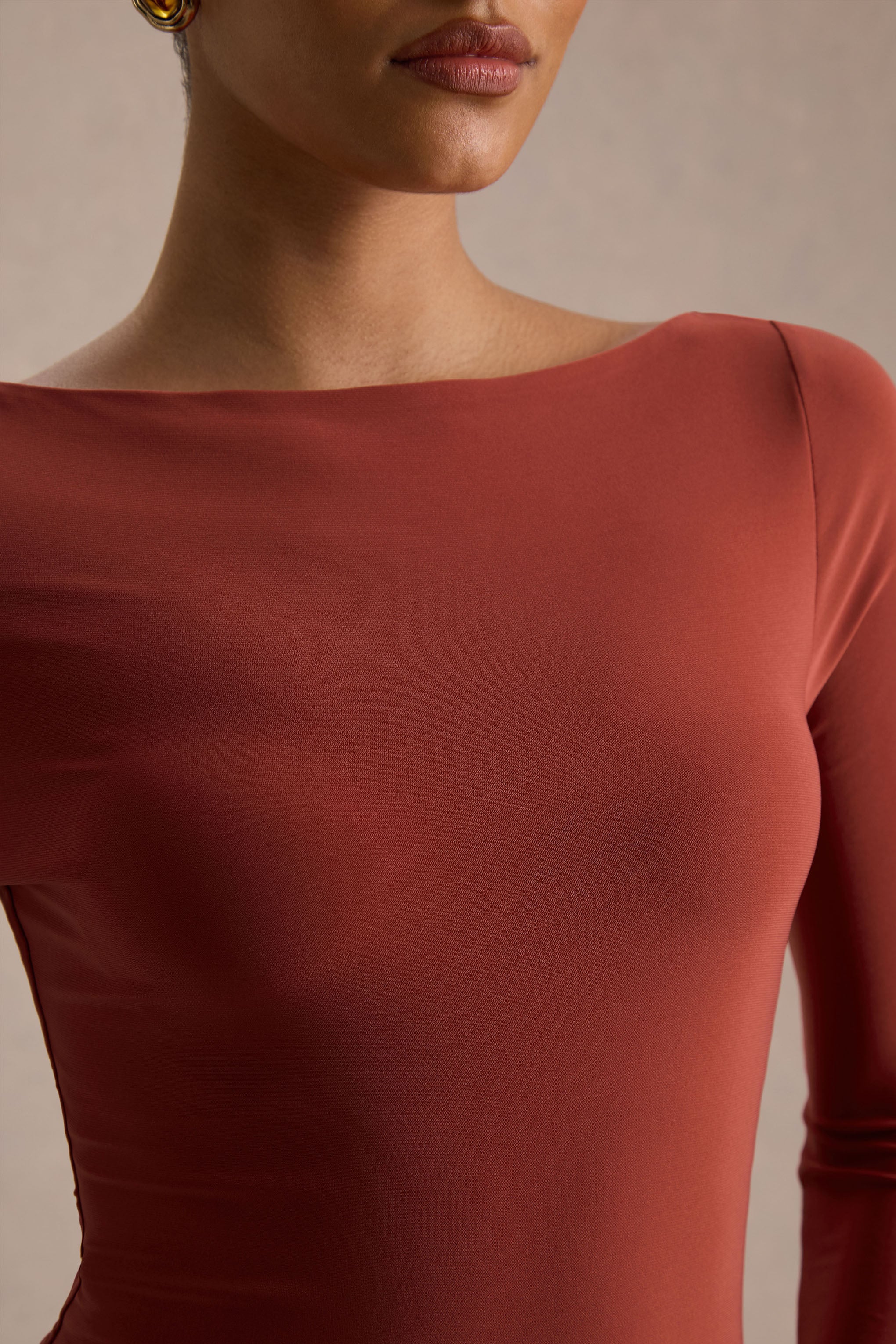 Make a striking statement in Matilda, a timeless maxi that effortlessly blends classic elegance with contemporary flair. Crafted from our premium stretch jersey, in contrasting rust shades, this dress flatters your silhouette like no other. Featuring a sophisticated boat neckline and long sleeves for a graceful finish, Matilda surprises with a subtle scoop back that adds a hint of allure. Finished with a ruched waist detail that cinches and sculpts your silhouette, in this dress you won't be forgotten.