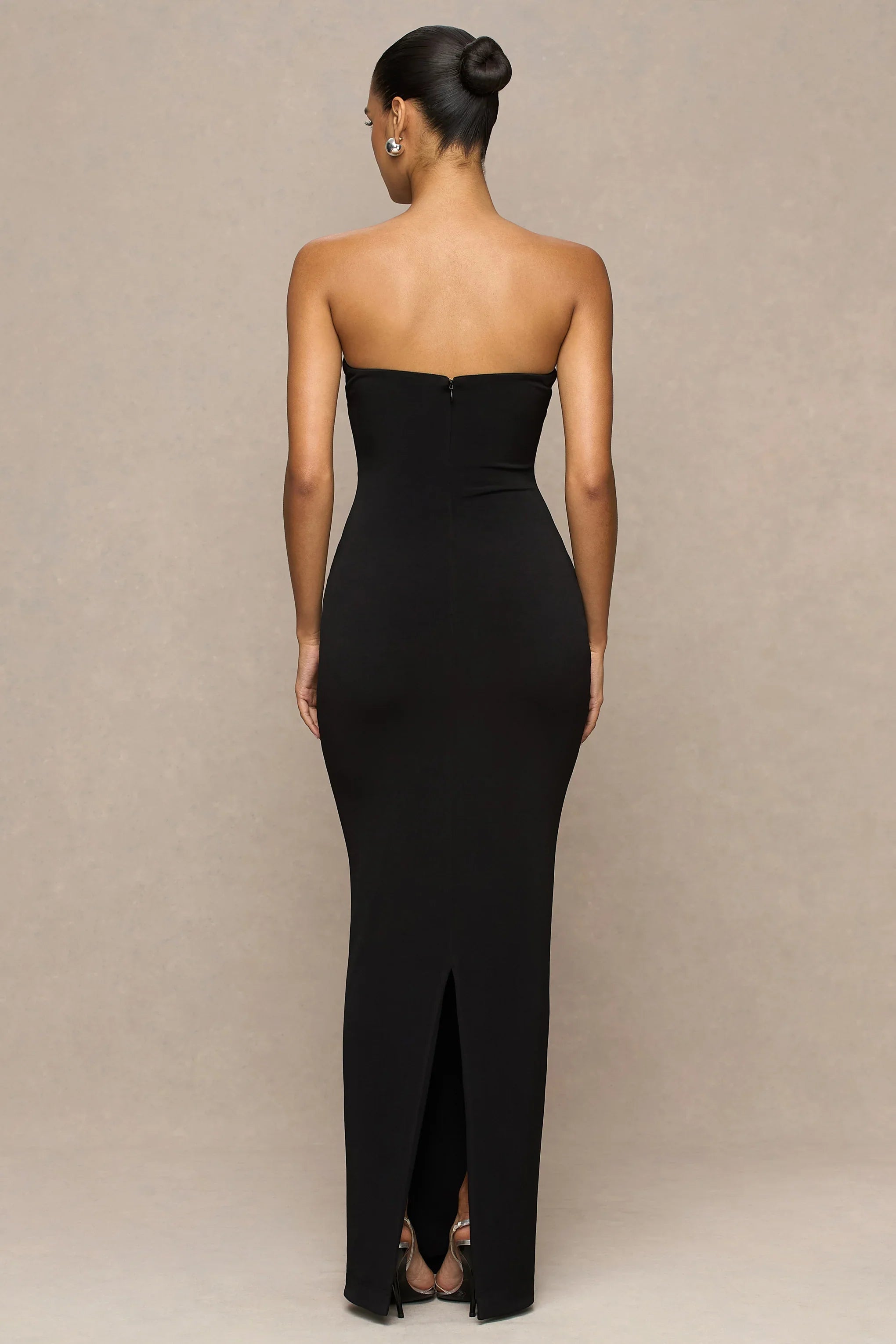Meet Milania, the maxi that redefines sophistication with a statement twist. Crafted from our premium black stretch jersey, it smooths and flatters your figure with ease. The bandeau neckline keeps the look clean and elegant, while the asymmetric, detachable, cape overlay adds a chic edge. Finished with a centre-back split for movement, Milania is a showstopping blend of timeless allure and modern drama.