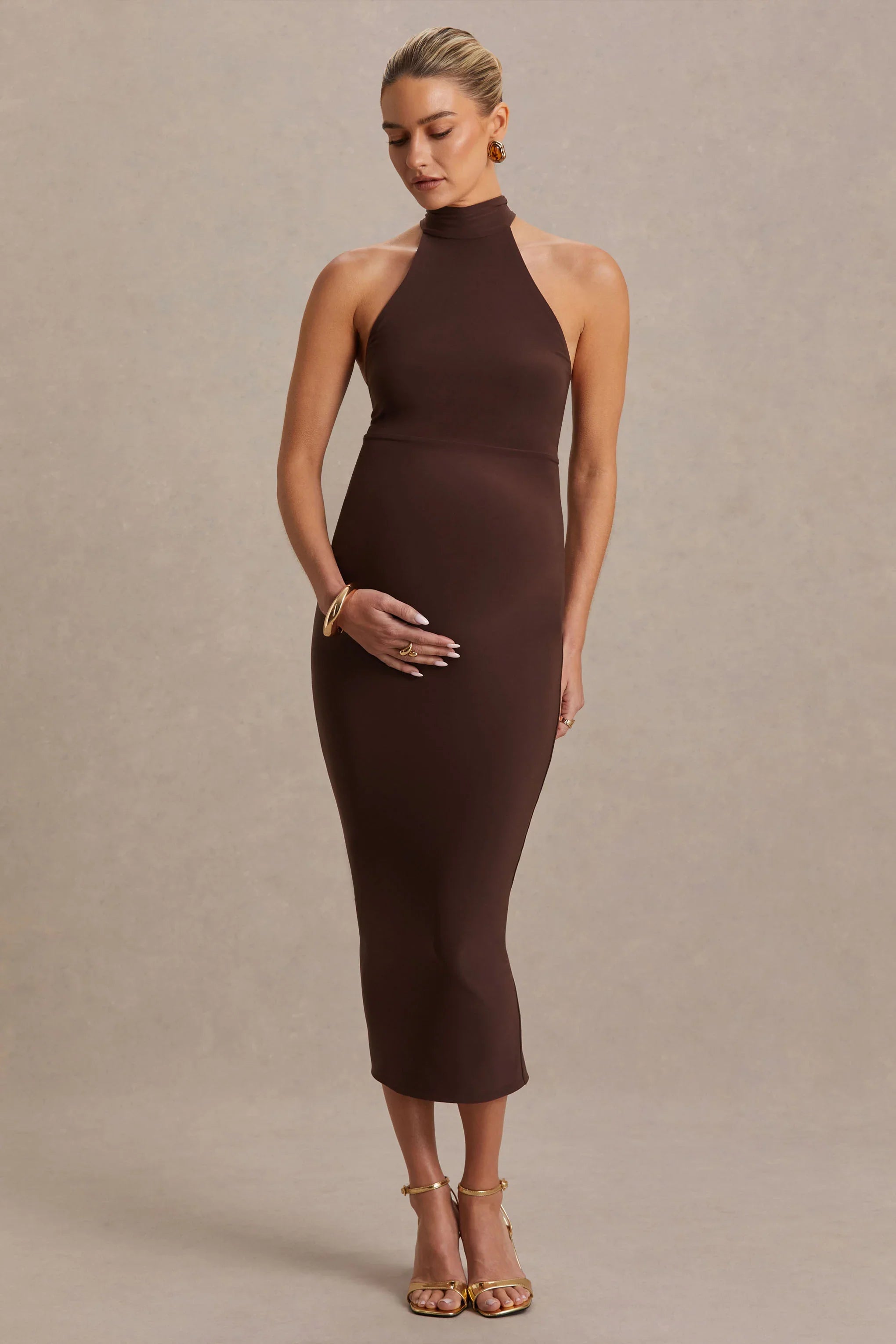 Say hello to Mireille, a maternity midi that blends comfort with timeless elegance. Cut from our premium brown stretch jersey, this dress is designed to flatter your bump at every stage. The halter neckline adds a sleek touch, while ruched detailing enhances the silhouette with a soft, sculpted effect. Finished with a centre-back split for ease of movement and a midi length for versatile styling, Mireille is the ultimate maternity go-to for chic occasions.