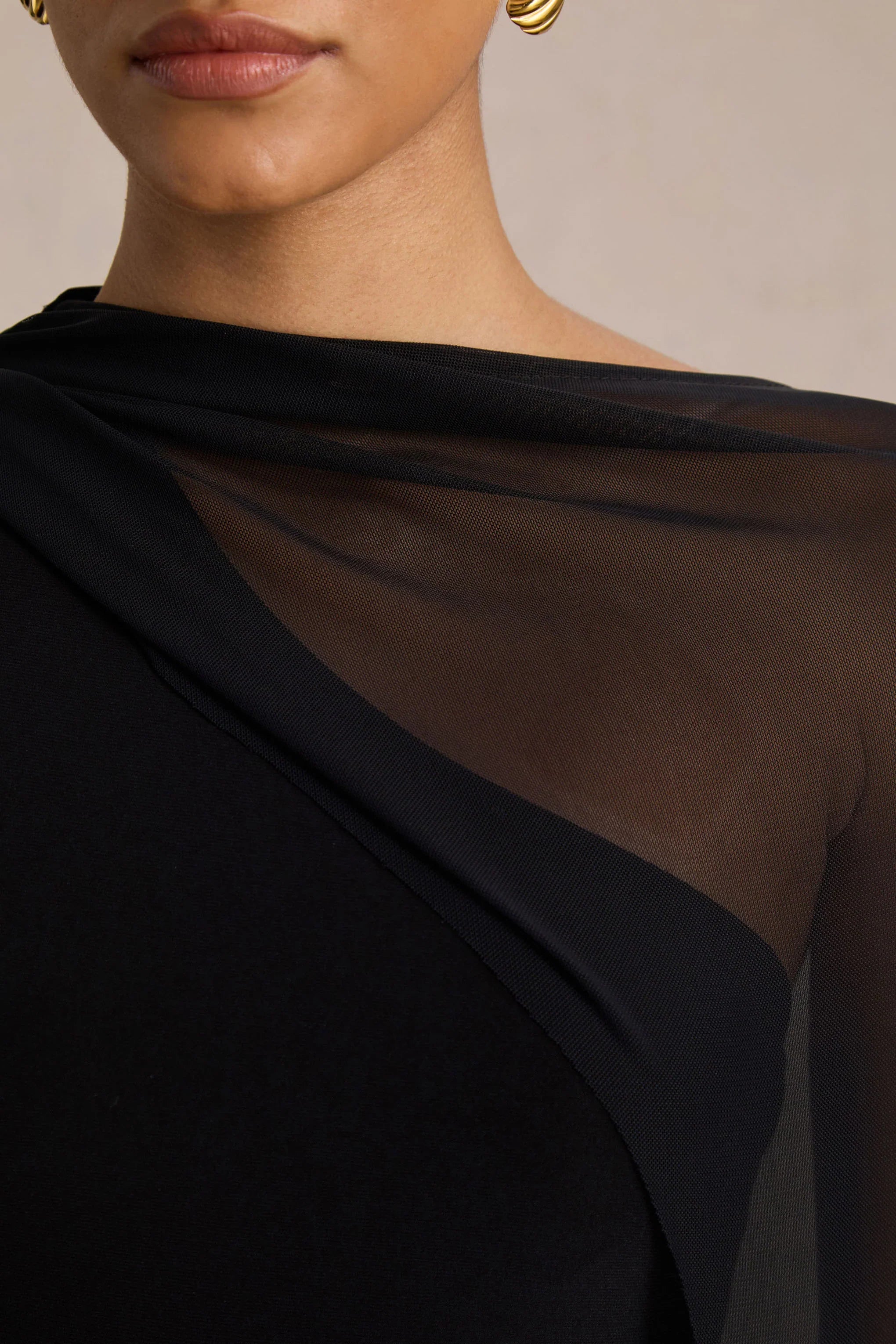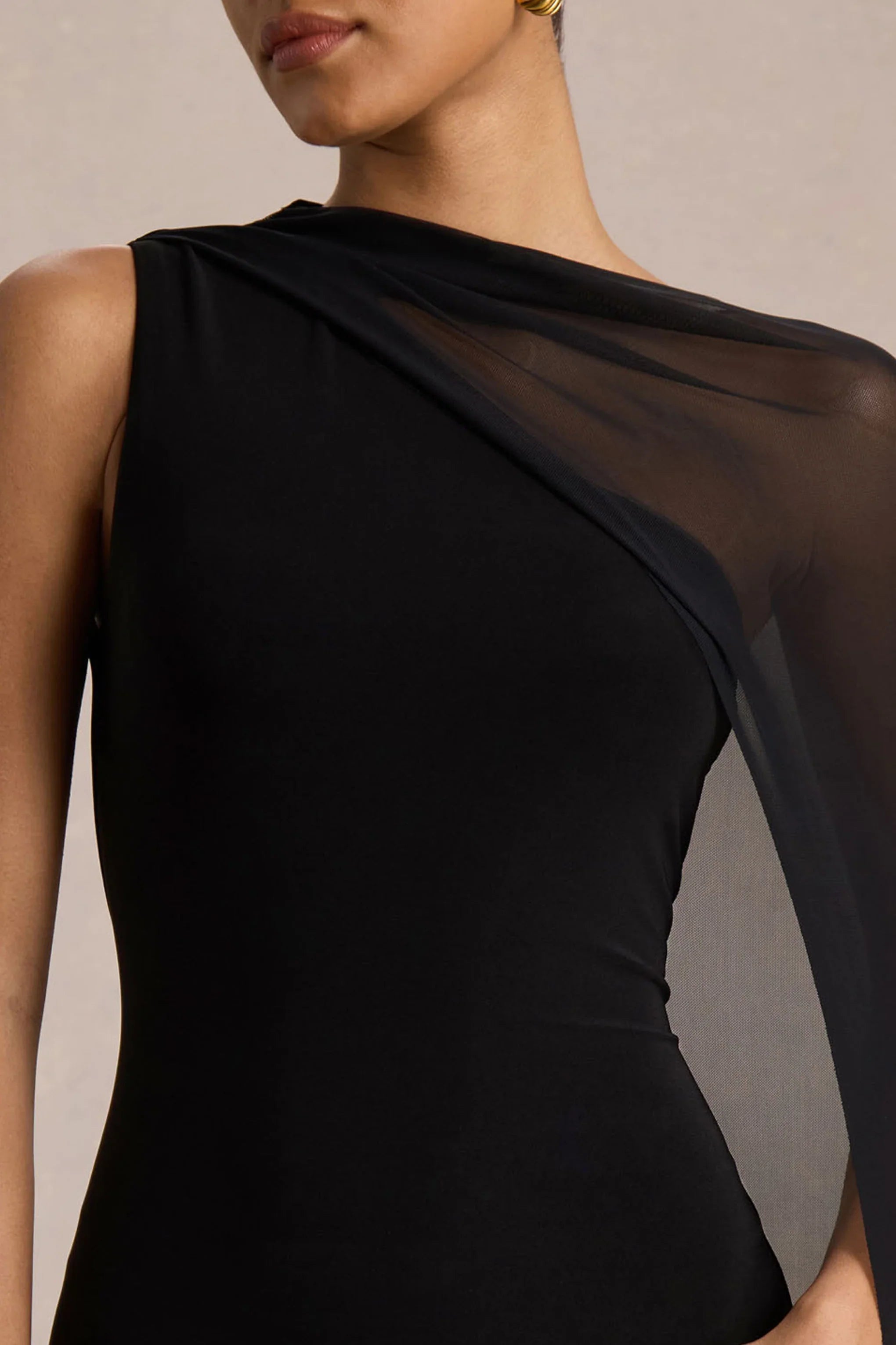 Turn heads and command the room in the Mirelle, where edgy elegance meets modern glamour. Draped in our sleek black premium stretch jersey, this maxi-dress skims the body beautifully for a figure-flattering silhouette. Designed with a striking asymmetric neckline and a dramatic asymmetric mesh-cape sleeve, it brings just the right amount of head-turning sophistication. Perfect for evening soirées or statement-making nights, Mirelle combines bold design with effortless movement, ensuring you feel as stunning as you look.