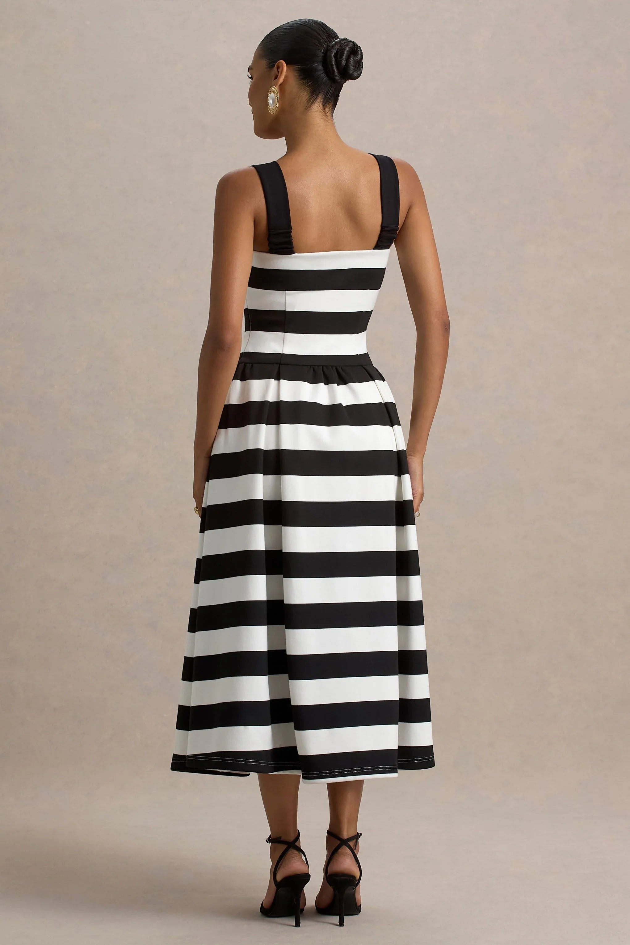 Designed to make a statement, our Monte Carlo midi has arrived. Curated in a black and white striped cut of our premium stretch crepe, this dress is bold and elegant. Finished with a feminine square neckline that frames your decolletage, for a chic and refined look. The drop waist enhances your silhouette ensuring you are flattered from every angle. Perfect for any upscale occasion this summer, paired with sleek black sunglasses to tie the look together.
