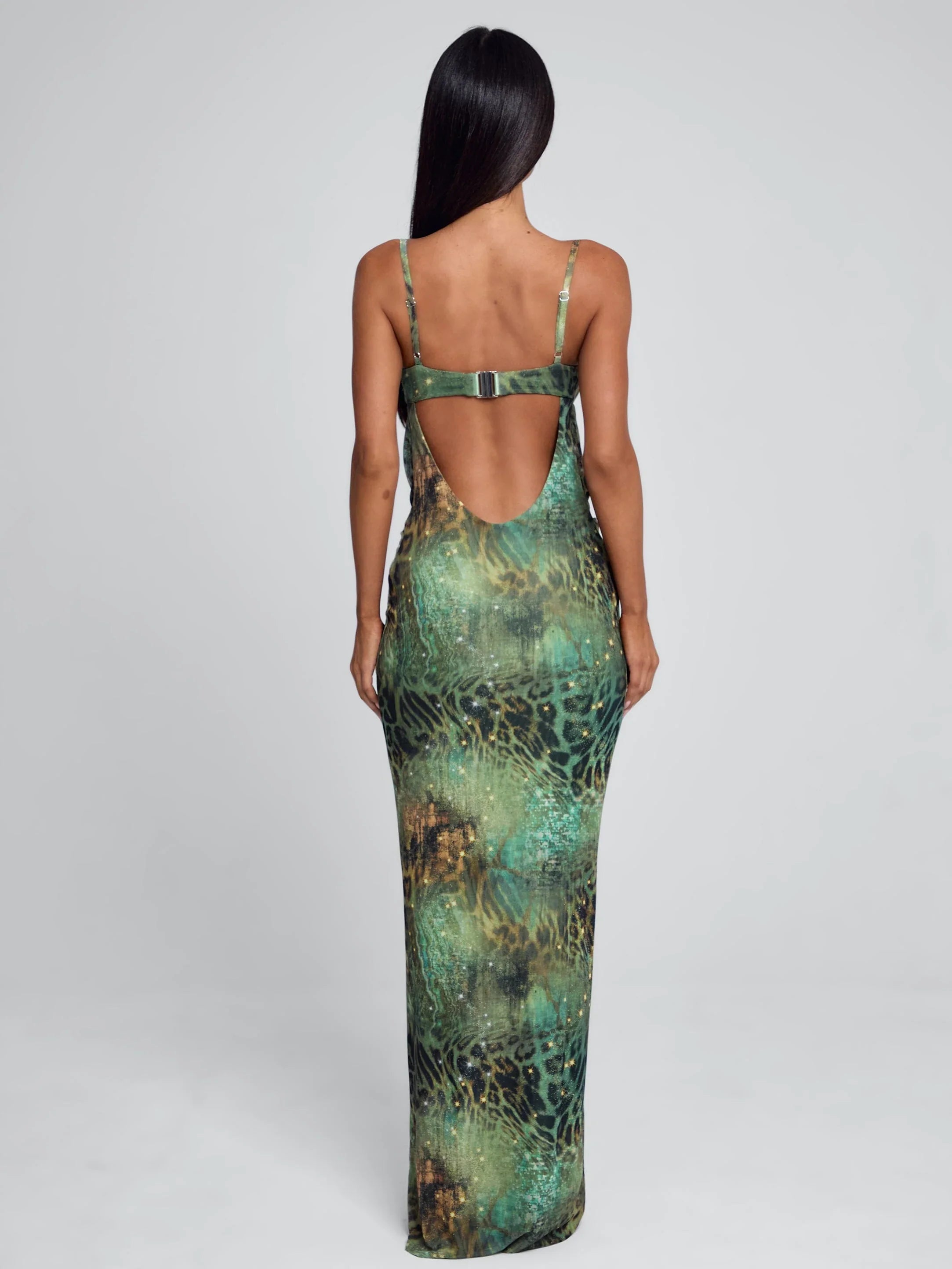 Crafted from printed mesh and lined with soft poly-knit, she features a sultry cowl neckline and a daring open back with a clasp closure. Her sculpted bust and adjustable straps create the perfect fit, while the body-con silhouette hugs your curves before falling effortlessly into a floor-skimming maxi length.