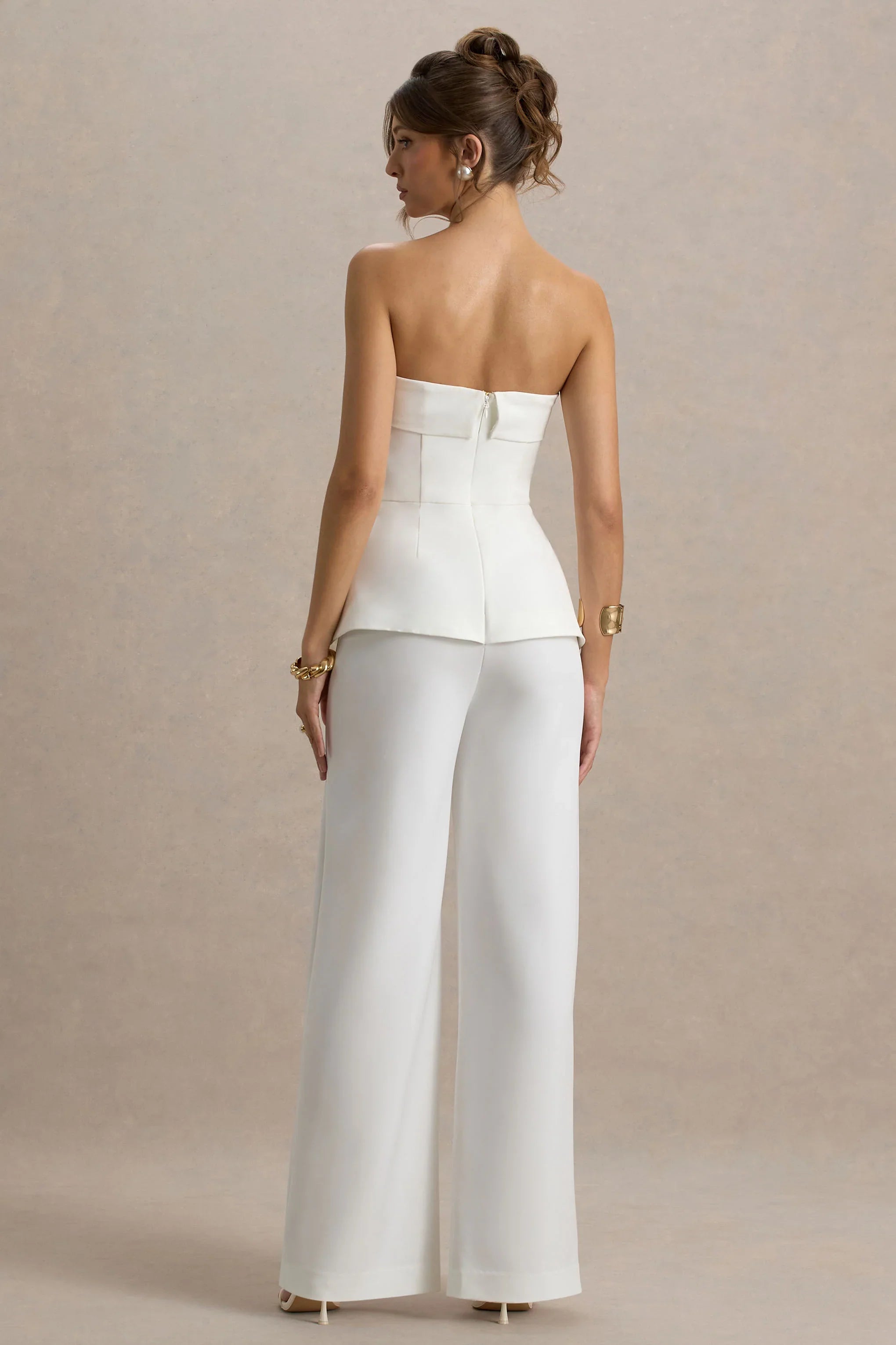 Introducing our latest jumpsuit Noemi, a piece that exudes glamour sophistication. Curated in a classic white shade of our premium stretch crepe, this piece flatters your figure beautifully. Featuring a feminine bandeau neckline, that elegantly frames your shoulders, and detailed with self covered buttons and pocket flaps for an utterly chic finish. From ladies brunches to elegant date nights, Noemi will see you through all occasions.