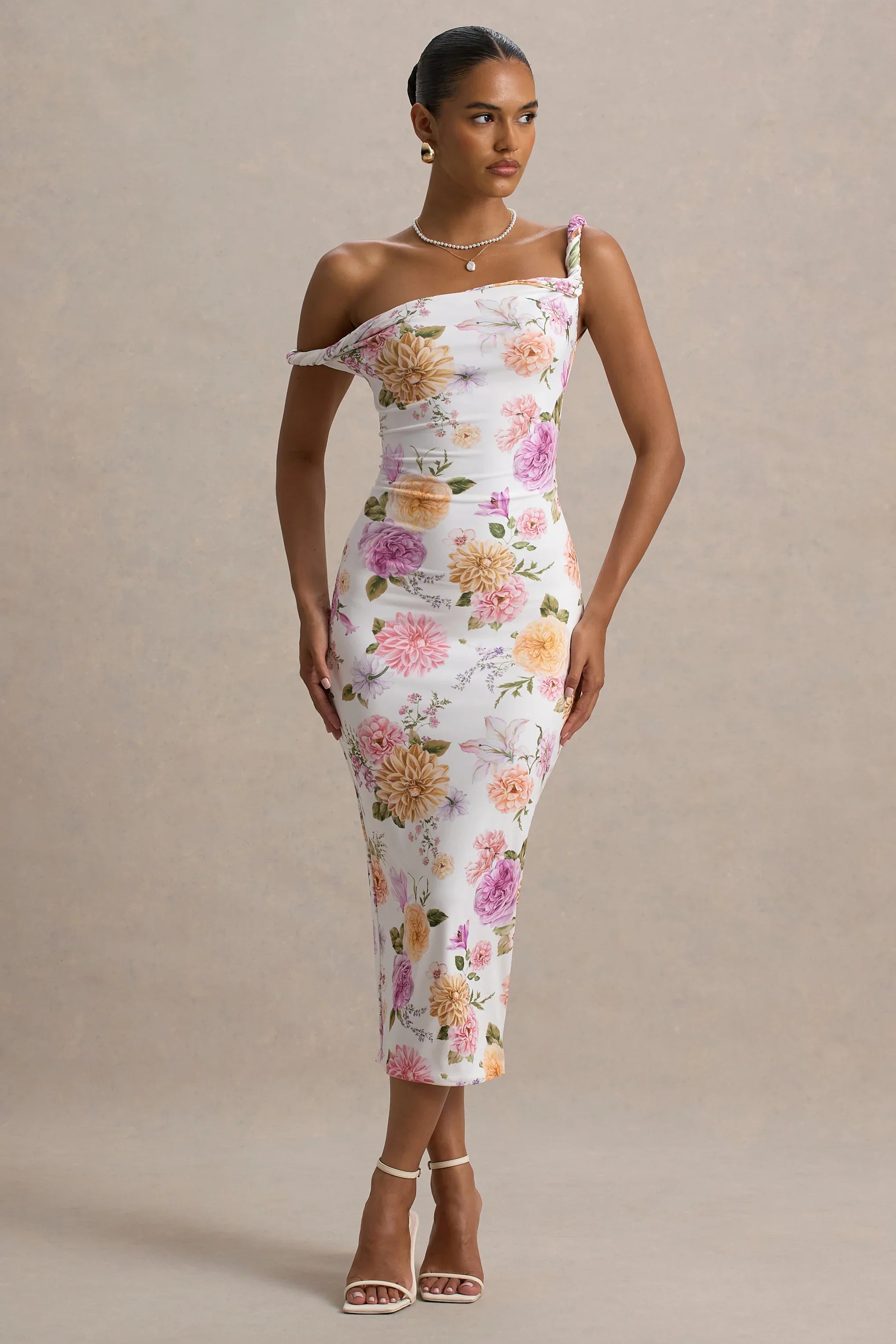 Take a trip to the wild side with Nora, our latest must-have midi of the season, painted in a peach and lilac floral print. Crafted from a premium stretch jersey fabric, this dress carries contemporary styles of asymmetric cuts and twisted necklines. Pair with your staple black heels for a chic city night look.