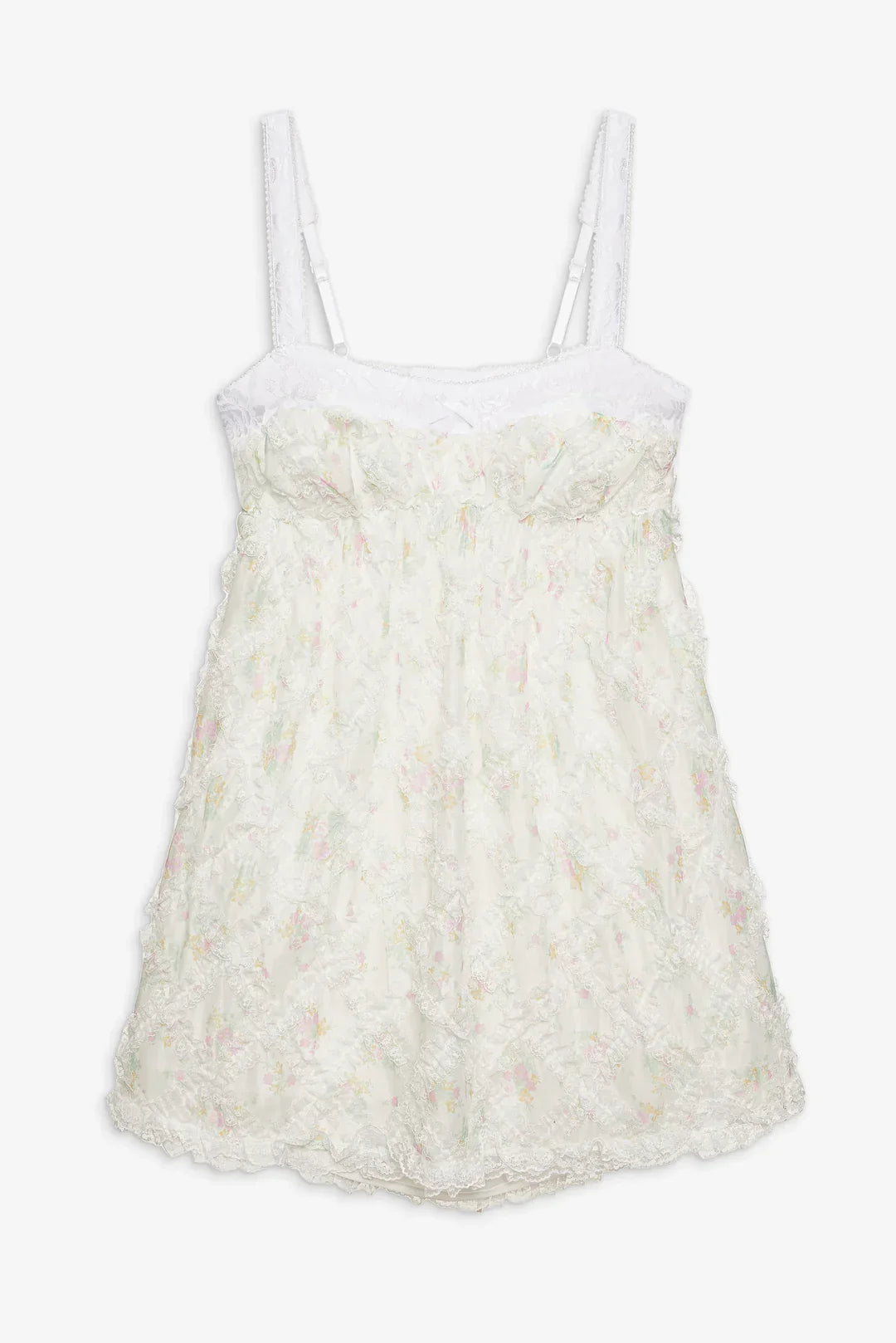 Crafted in floral printed gauze with lace trims—the Nova white mini dress is an ultra-special babydoll dress that's suited to equally special moments. It features an exposed stretch lace bra that gives way to an empire waist and a full gathered skirt.