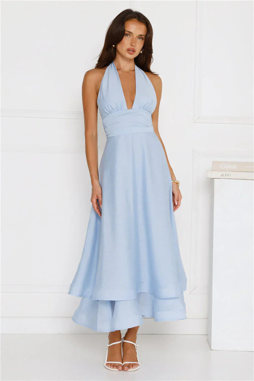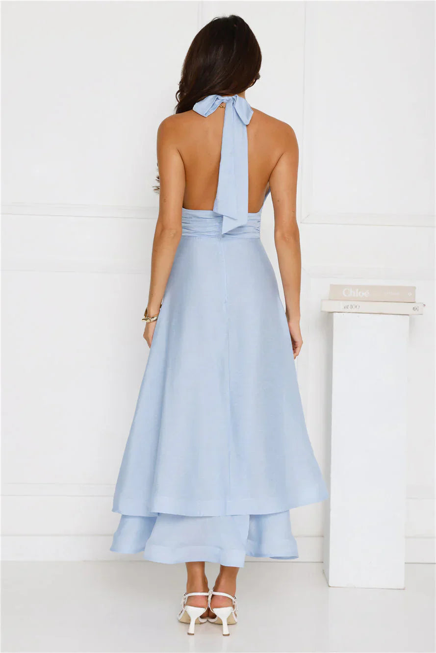 The Opal Glow Halter Maxi Dress is all about dreamy elegance, featuring a halterneck tie, gathered waist detail, V-neck, and a voluminous high-low skirt that��ll have you glowing with every step! Style with heels.