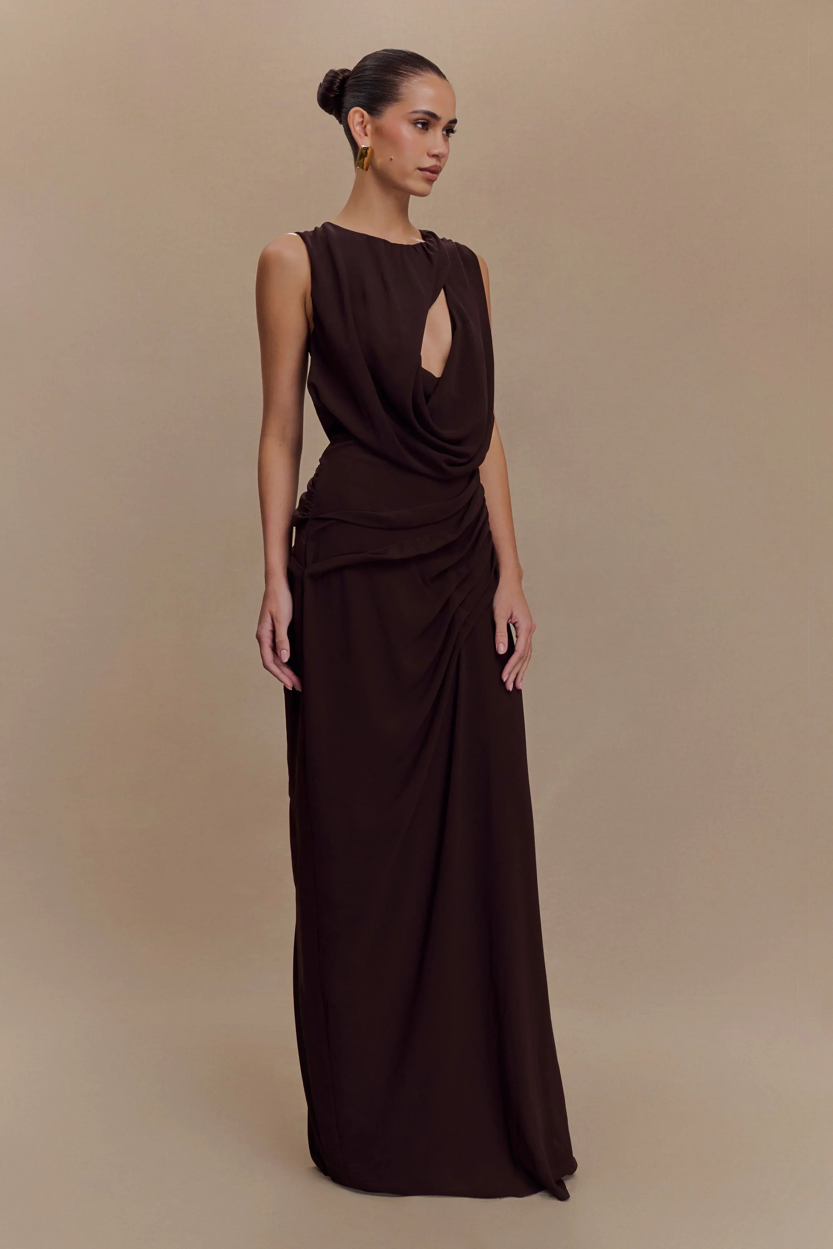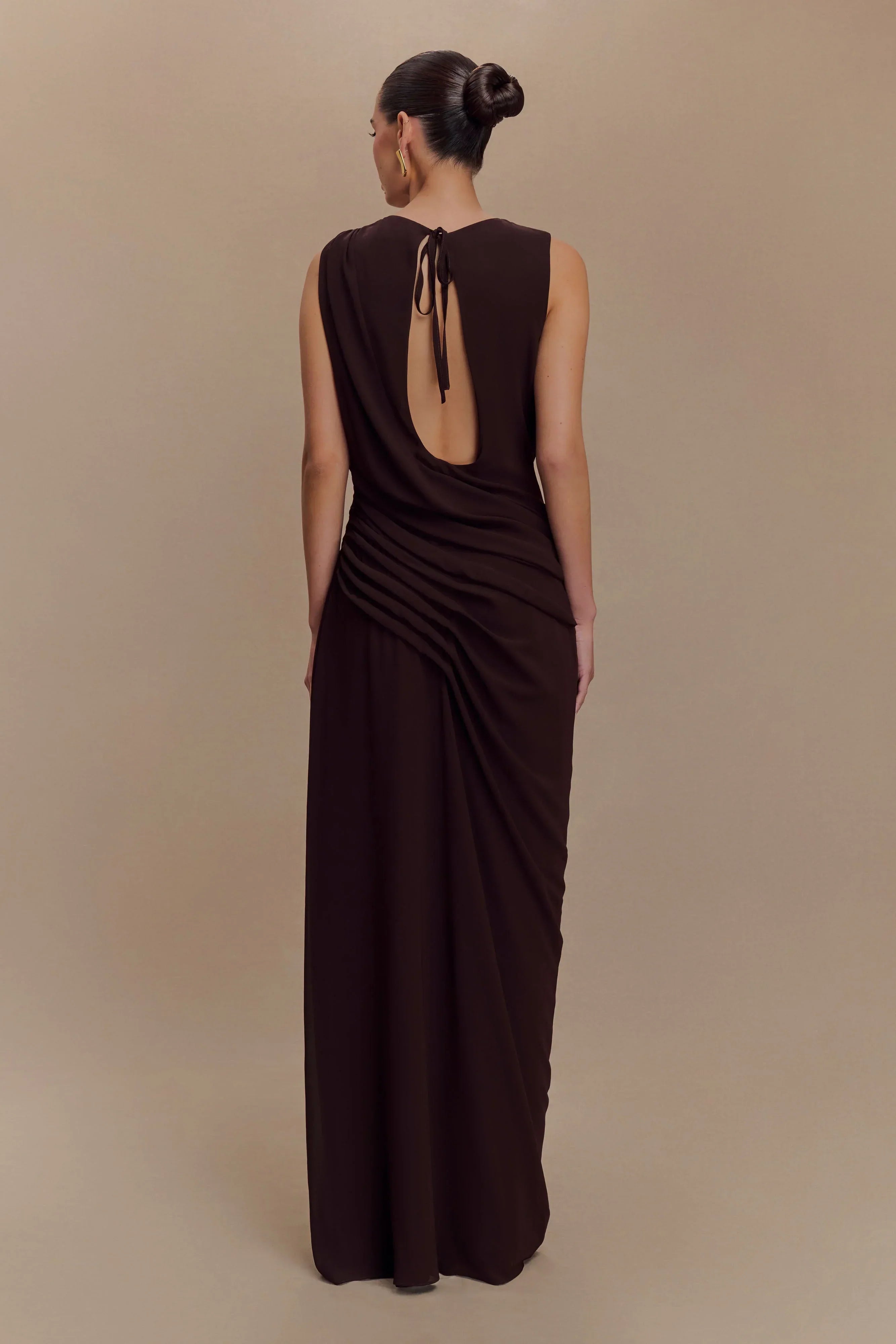 Make a statement in the ORIA Chiffon Maxi Dress, where ethereal design meets modern allure. This elegant piece features an asymmetrical neckline with a bold cutout and a draped neckline and waist detail that flatters your silhouette. The open back, secured by a delicate back neck tie, adds a touch of drama, while the flowing chiffon maxi skirt creates a graceful finish. Perfect for formal occasions or evening soirées, this dress ensures you captivate from every angle.