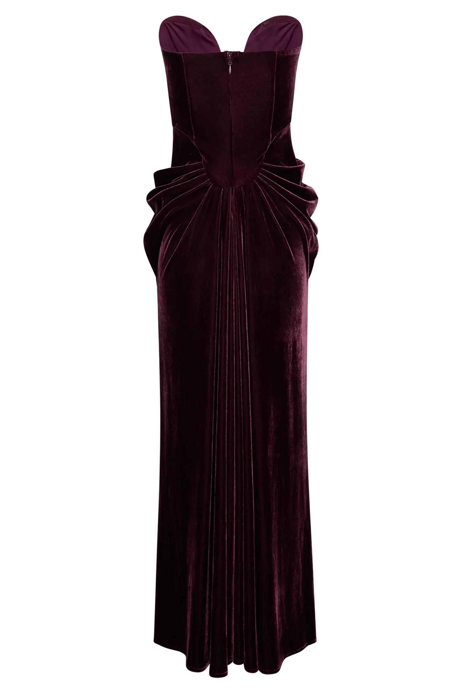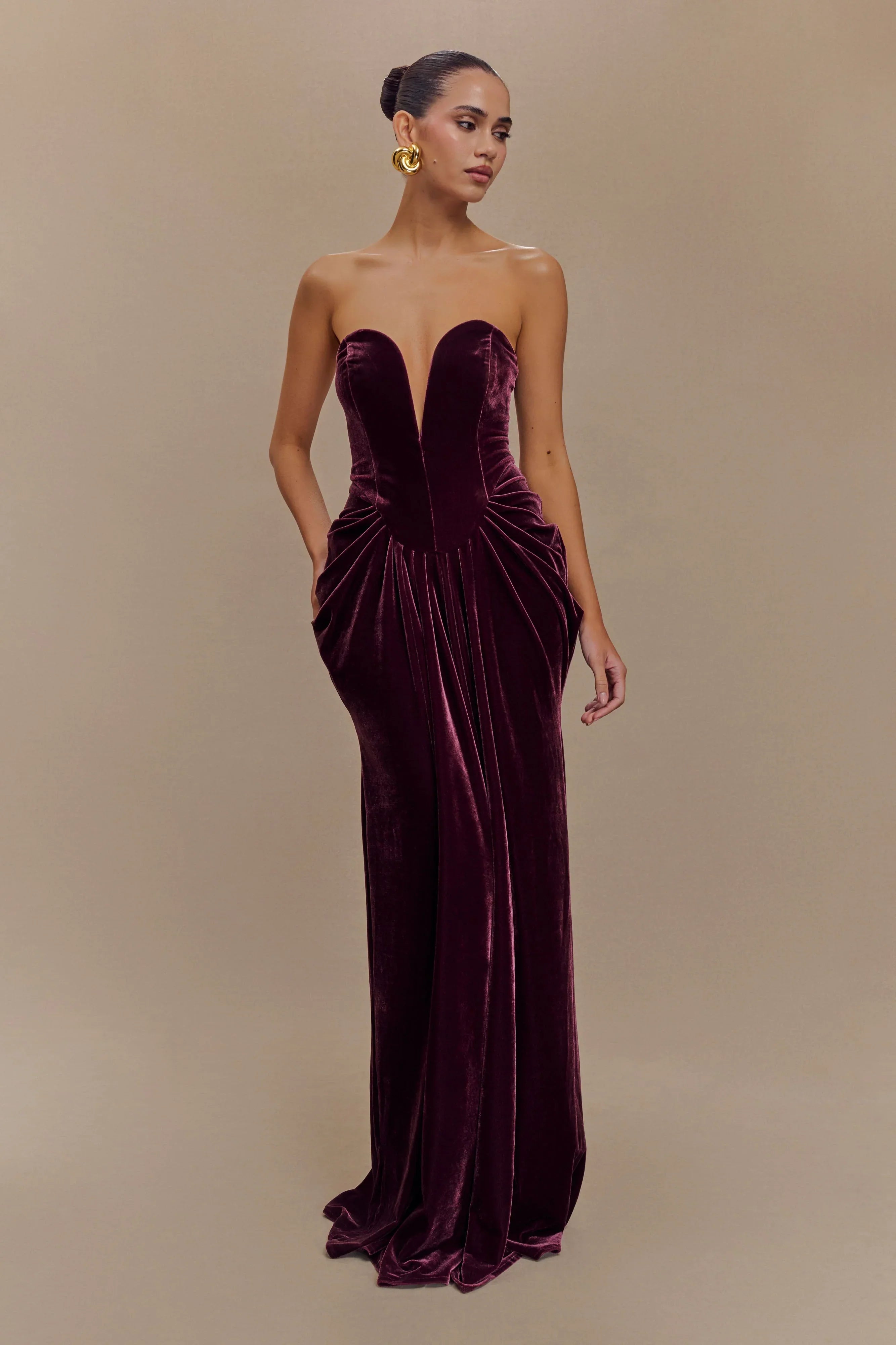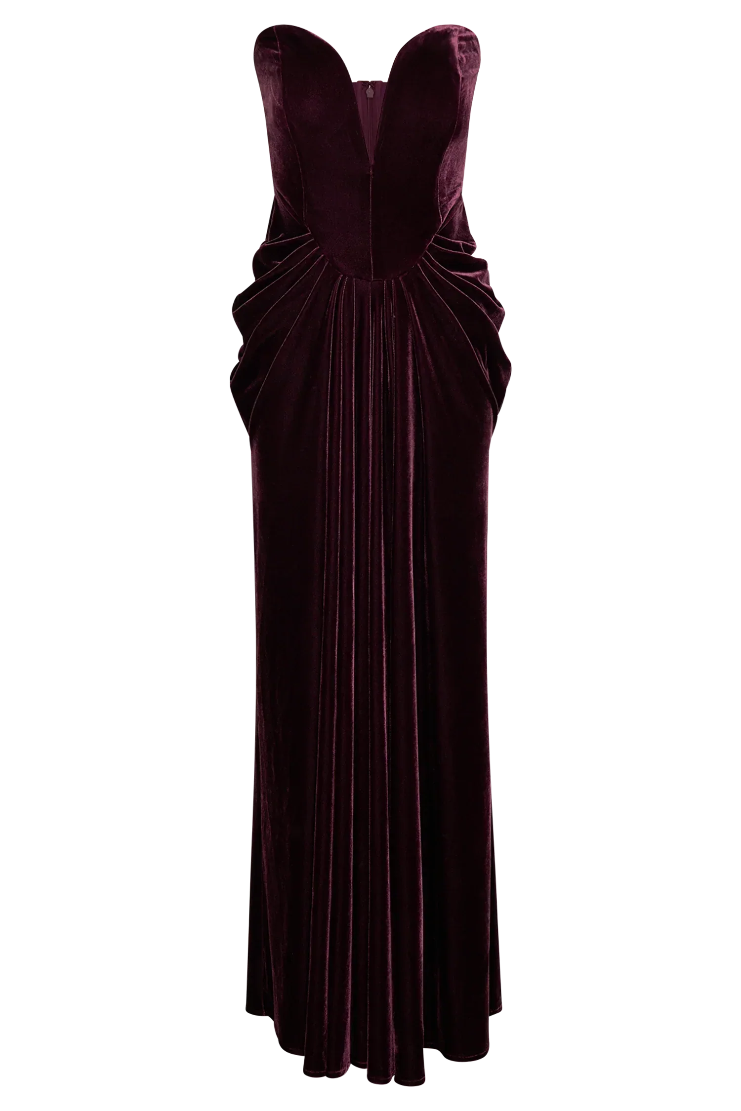 The PAIGE Strapless Velvet Maxi Dress combines elegance with sultry sophistication. Featuring a strapless design and a deep plunge neckline, it beautifully accentuates the décolletage. The corset waist shapes and defines your figure, while gathering at the hips adds movement and volume, creating a flattering silhouette. Crafted from rich velvet, the dress has a luxurious finish that catches the light with every step. With a centre-back zip for a secure fit, the maxi length offers a dramatic and graceful finish.