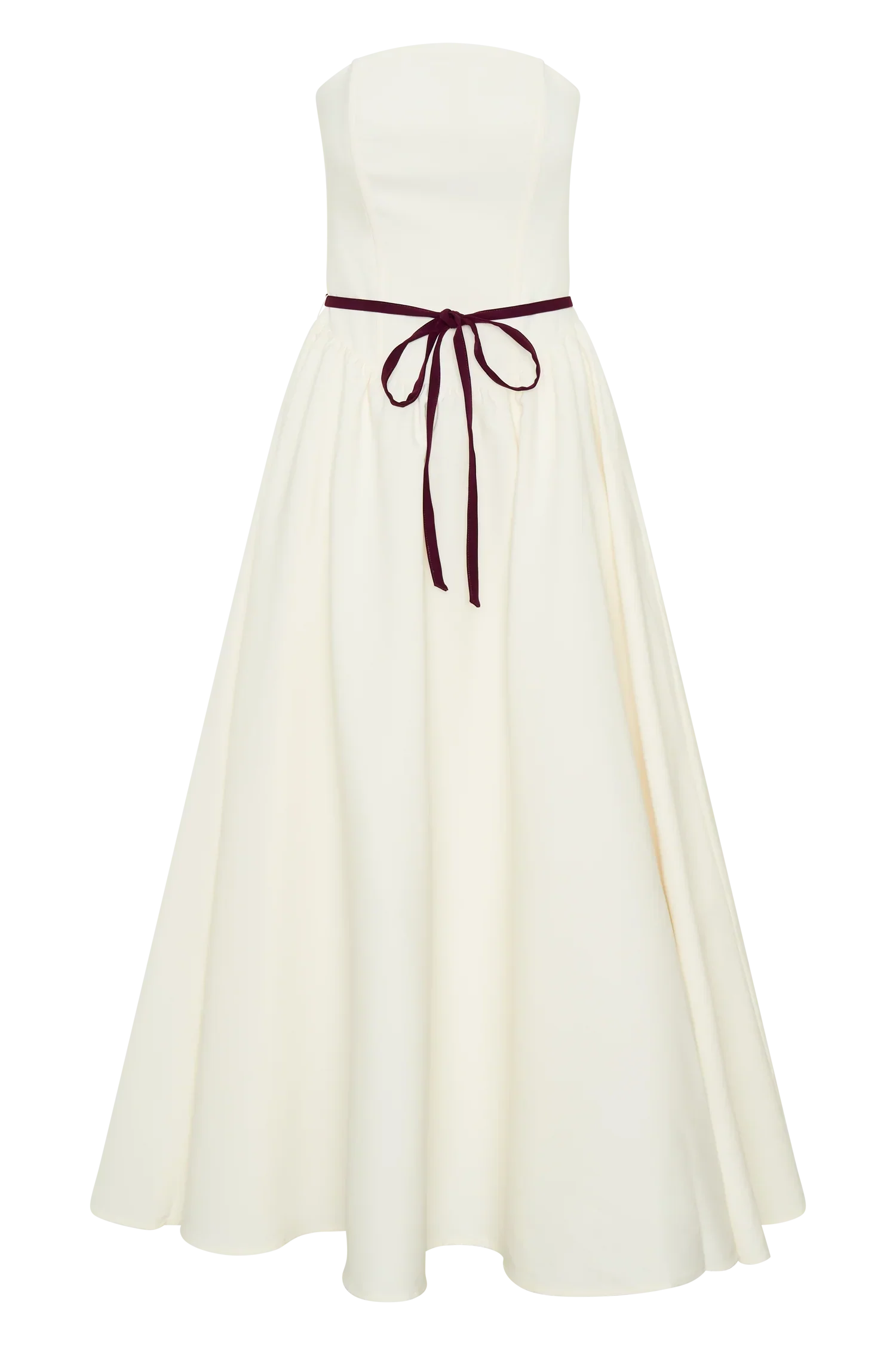 Introducing the PENNY Strapless Contrast Midi Dress, a stunning fusion of elegance and modern design. This dress showcases a flattering rounded front neckline and a strapless silhouette that accentuates your shoulders beautifully. The centre back zip closure provides a secure fit, while the full skirt offers volume and movement for an eye-catching silhouette. With its midi length, this dress is perfect for both daytime occasions and evening events. The accompanying waist belt beautifully cinches the waist, enhancing your natural curves and adding an extra touch of sophistication.