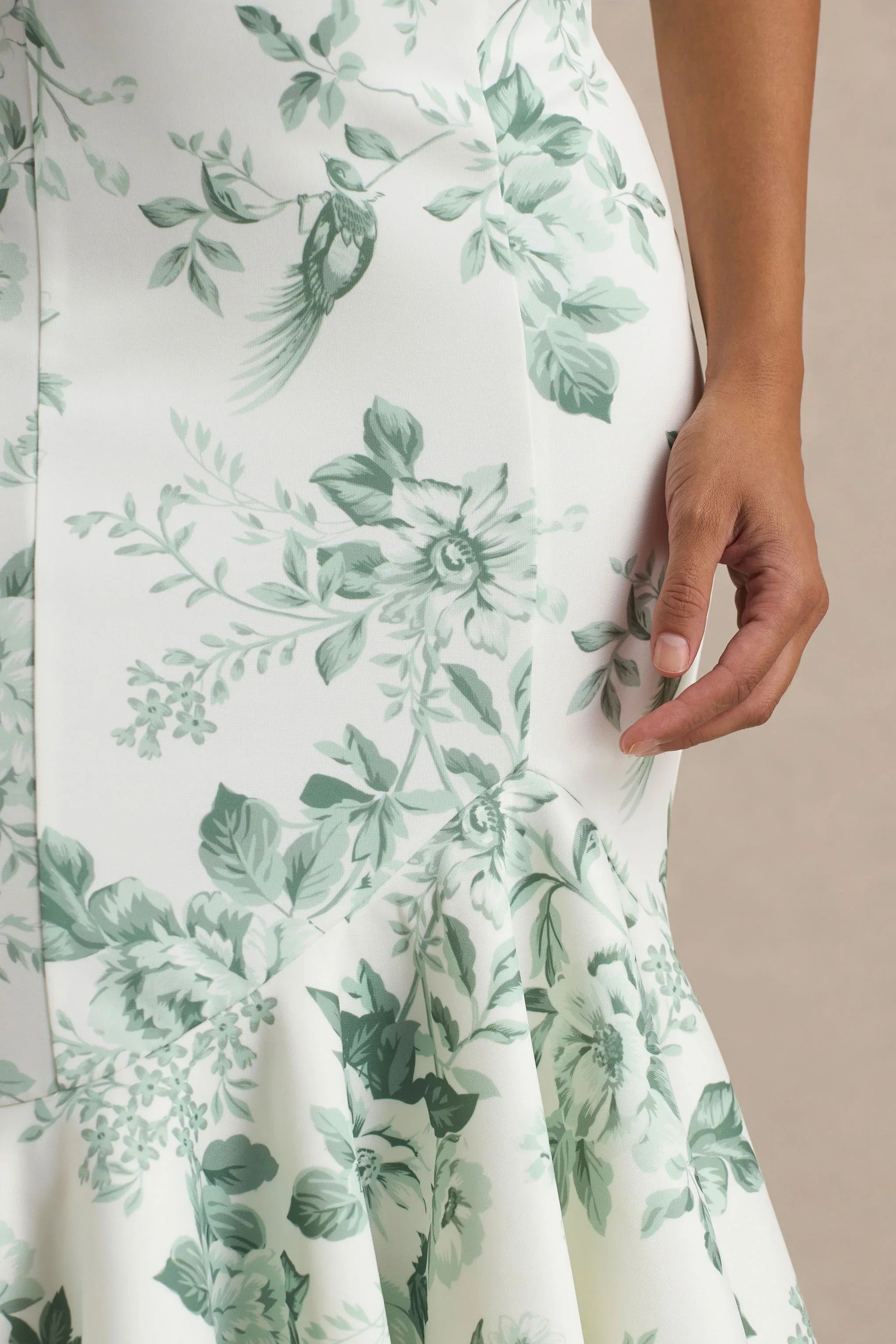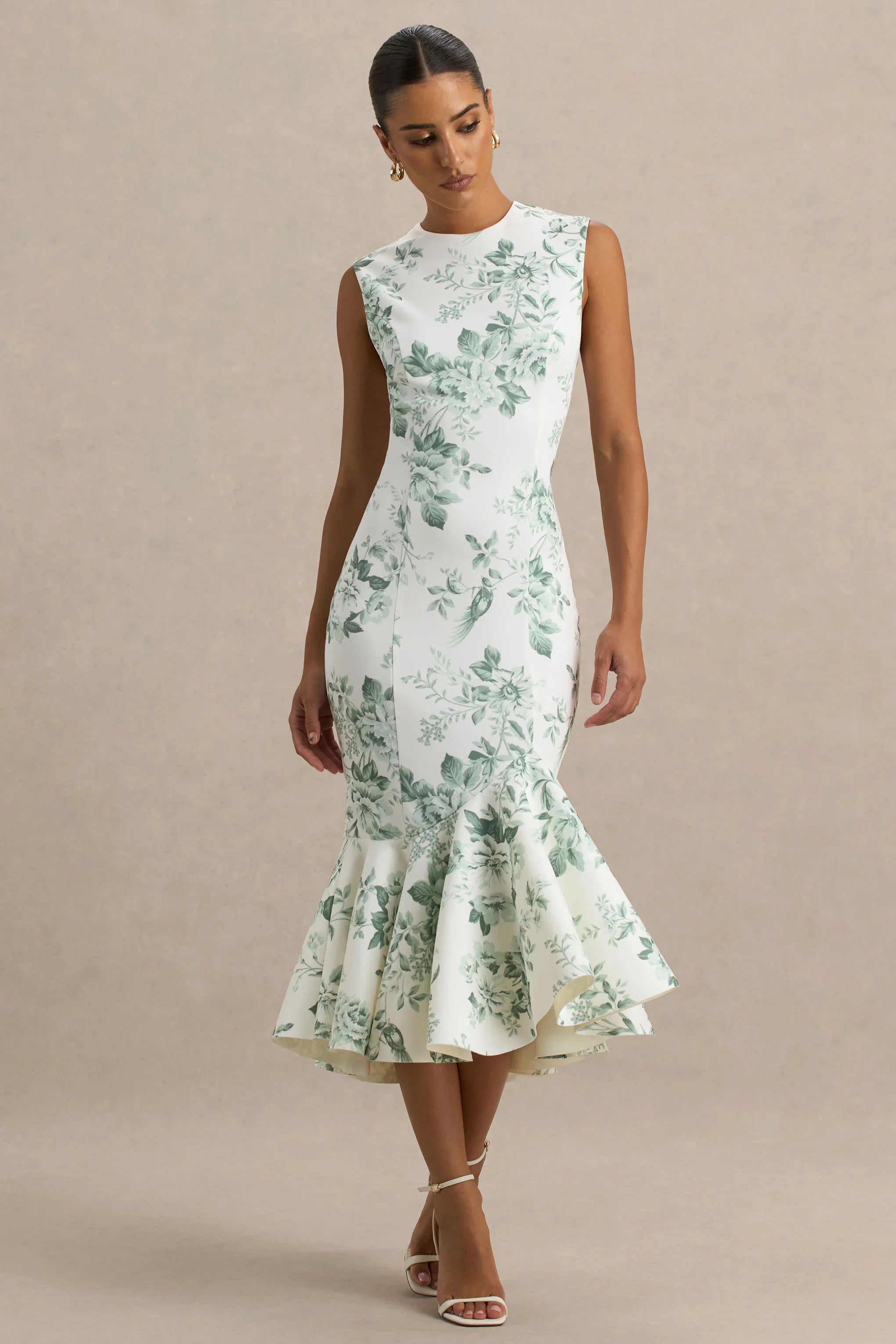 Turn heads in Priceless, a statement-making piece that defines modern glamour. Designed in a a delicate green porcelain print of our premium scuba crepe fabric, this midi dress contours your figure with effortless elegance. The high neckline adds a touch of sophistication, while the fishtail silhouette cascades into a ruffled hemline for maximum impact. Priceless is perfect for occasions that call for a little extra.