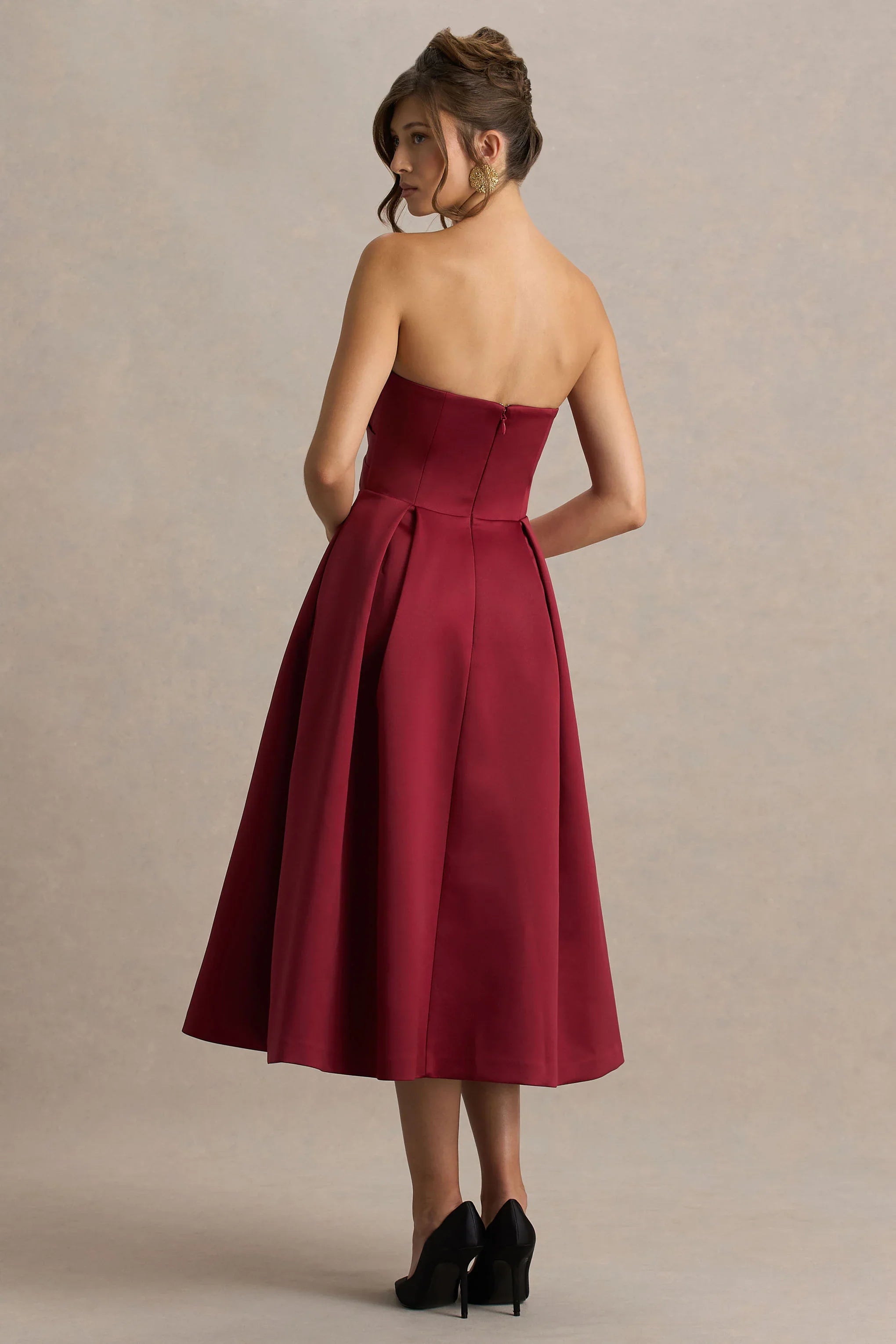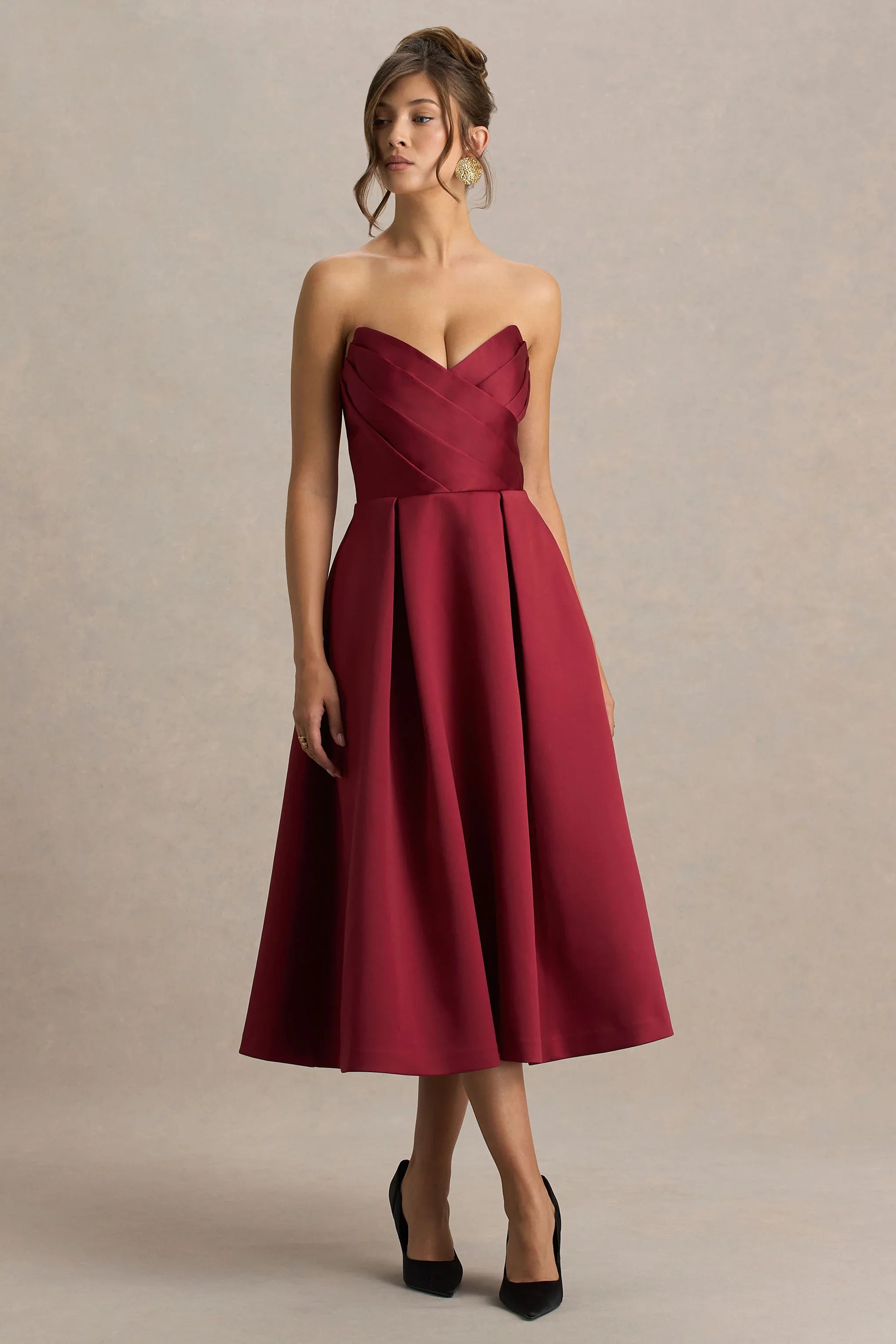 Premium is the dress that whispers elegance with every turn. Crafted in our rich burgundy satin, this midi dress moves with effortless grace. Featuring a flattering sweetheart neckline, that delicately frames the decolletage, and a playful skater that adds flirty charm. The pleated detailing adds a touch of texture and sophistication, making it perfect for date nights, parties, or any occasion where you want to leave a lasting impression.