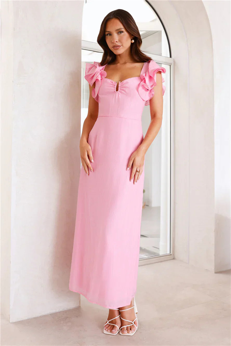 Step into a delightful style, lovely. The Provence De France Maxi Dress features a gorgeous gold metal U neckline, frill shoulder straps and a tie-up back. Style with heels for a gorgeous 'fit.