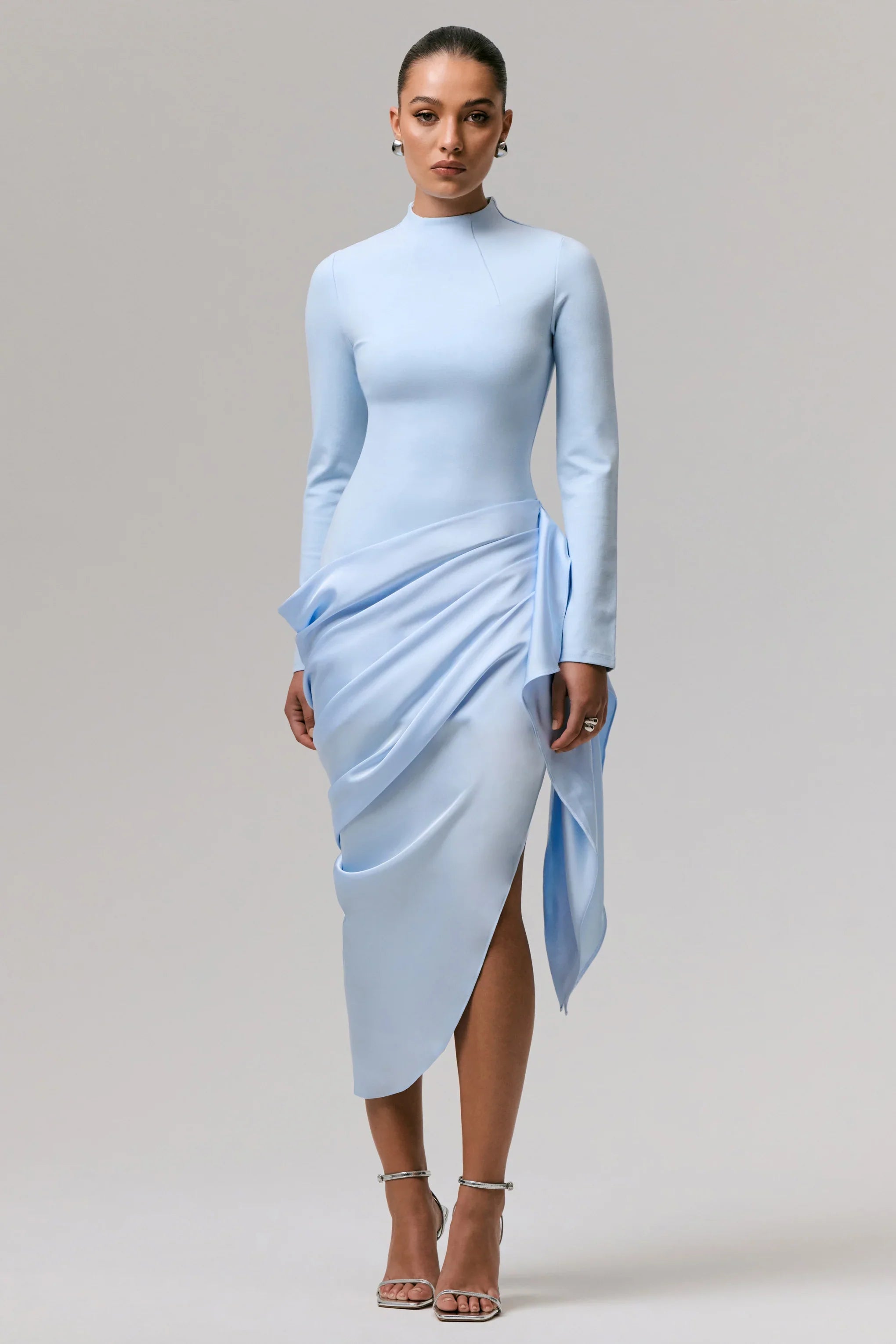 Meet your new go-to statement piece, our Raffie midi dress. Designed to sculpt and flatter, this dress is crafted from our premium ponte fabric with a satin wrap skirt, in a delicate shade of powder blue. Featuring a crew neckline and long sleeves for sophisticated structure, that contrasts perfectly with the the skirt that drapes effortlessly for an elegant finish. The asymmetric hemline adds a modern touch, making this the ultimate occasion-ready look. Pair with sleek accessories for a show-stopping ensemble