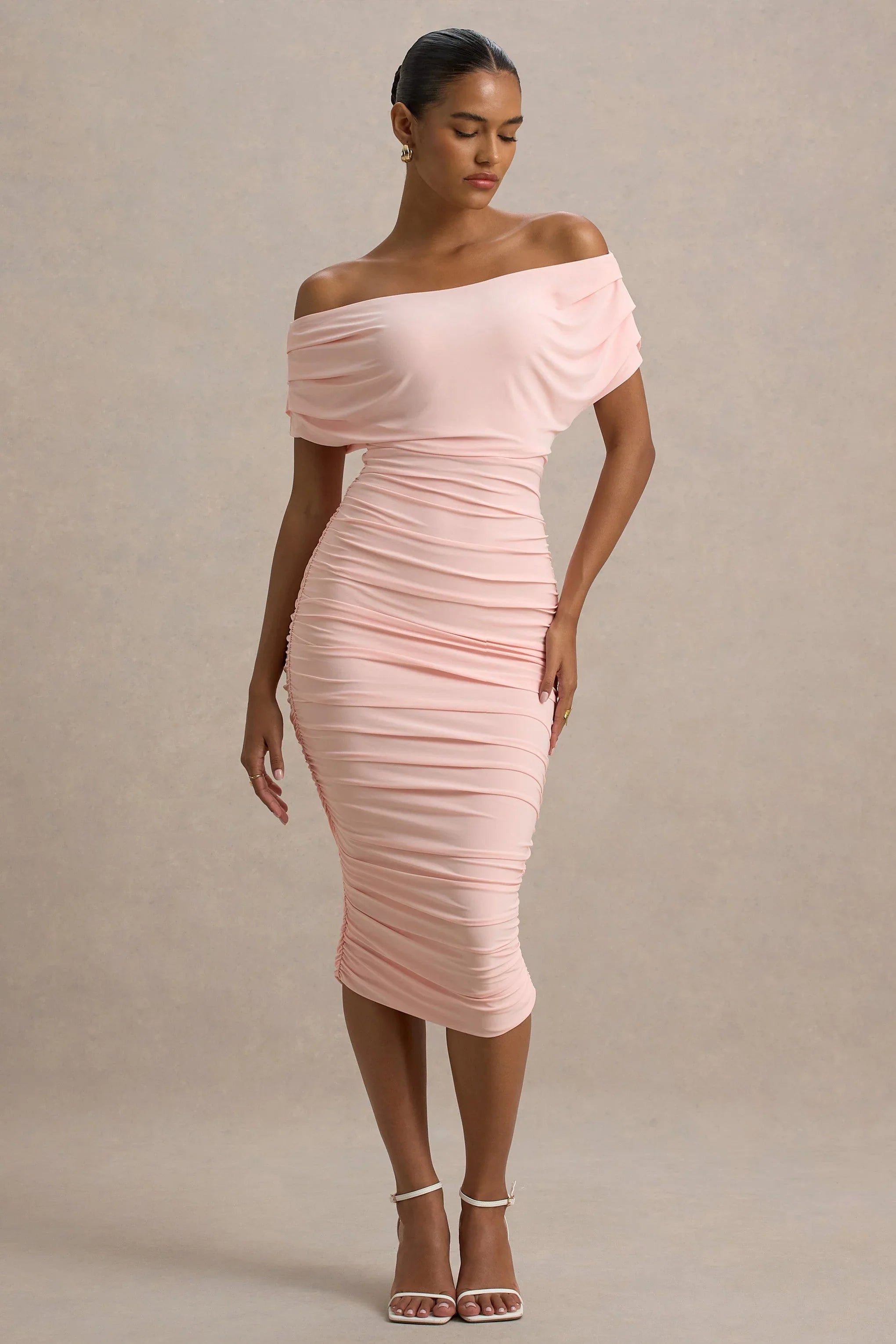 When the occasion calls for the perfect midi dress, then Rayleigh is the standout answer. With trending ruched details and a beautiful bardot neckline, the pink premium stretch jersey comes to life, making every head turn in your direction.