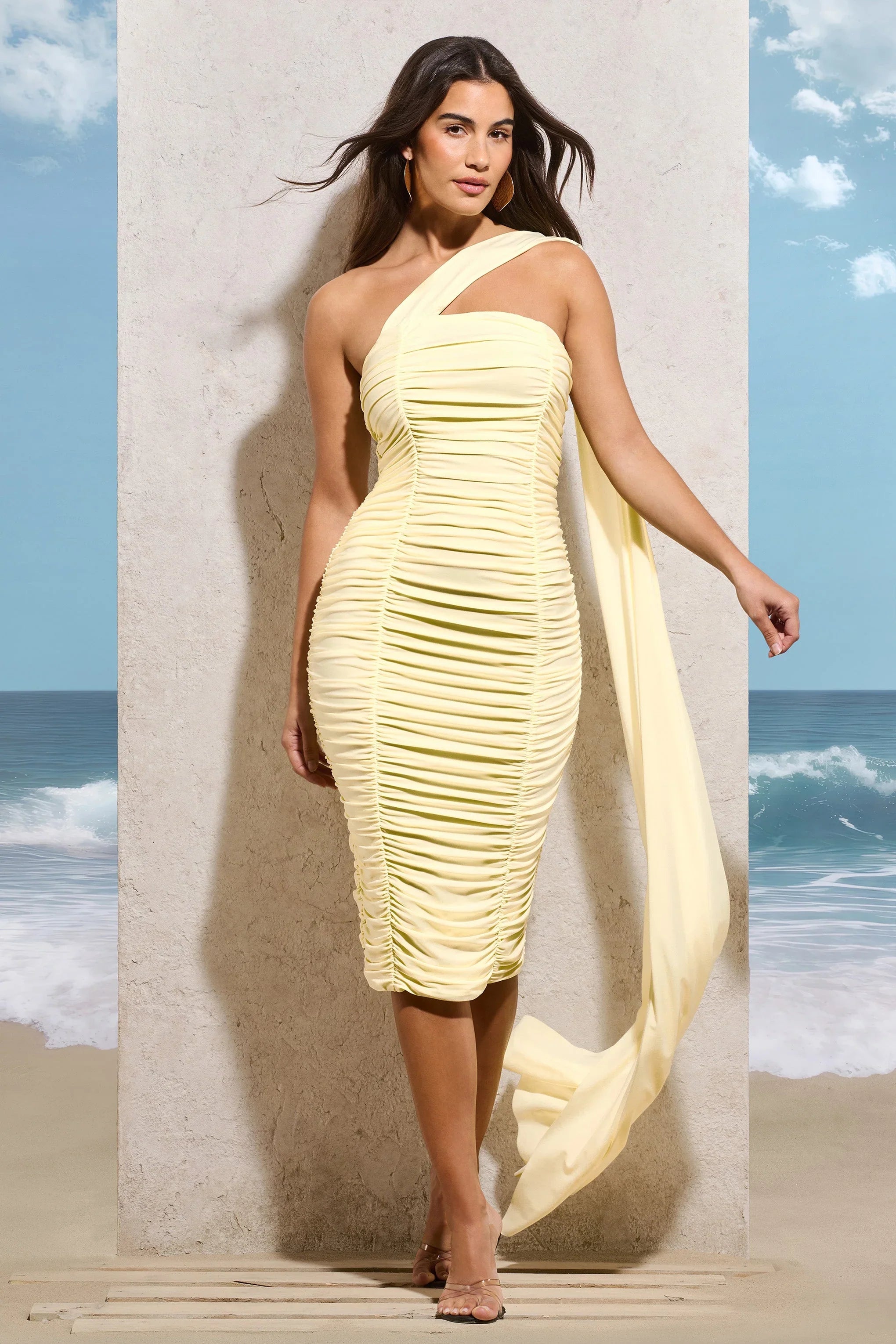 Sculpt your silhouette in our latest midi design, Realign. Expertly cut in our flattering figure hugging jersey in light lemon shade, this dress is a stand out-fit. Realign features a fully ruched bodice and asymmetric neckline with a flowing sash down the back that catches the breeze. Look bold and beautiful in this style by pairing it with a sleek high pony to show off the neckline and sash.