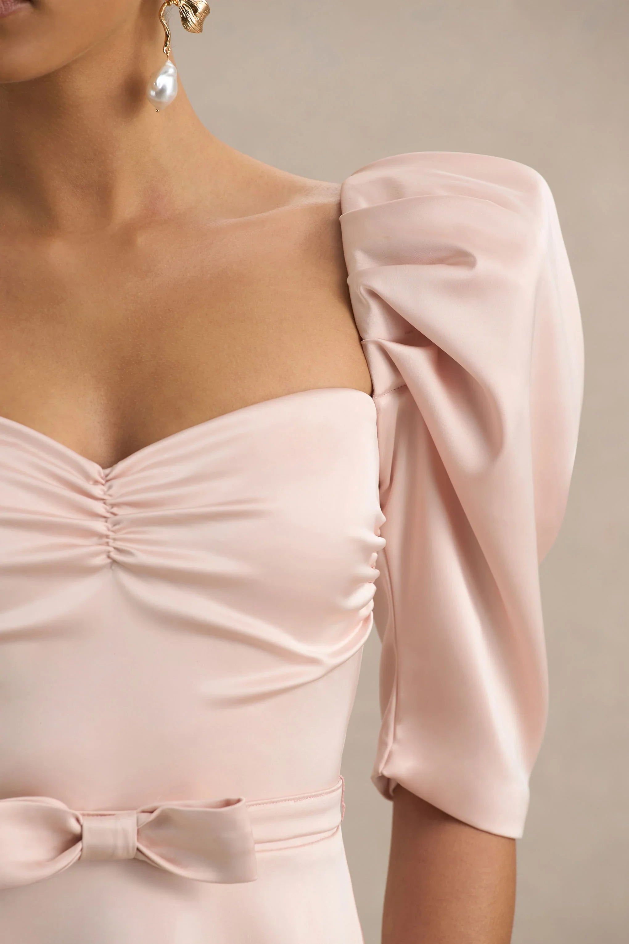 Become a vision of timeless elegance and allure in Rosey. This midi dress is cut from our premium stretch satin, in a stunning pale pink hue, offering a flawless fit for any occasion. The sweetheart neckline adds a touch of soft femininity, while the structured sleeves provide drama and sophistication. Cinching the waist with a delicate bow detail, Rosey creates a sculpted silhouette that's effortlessly chic. Whether you're attending a wedding or a glamourous dinner, this showstopping piece ensures you make an unforgettable entrance.